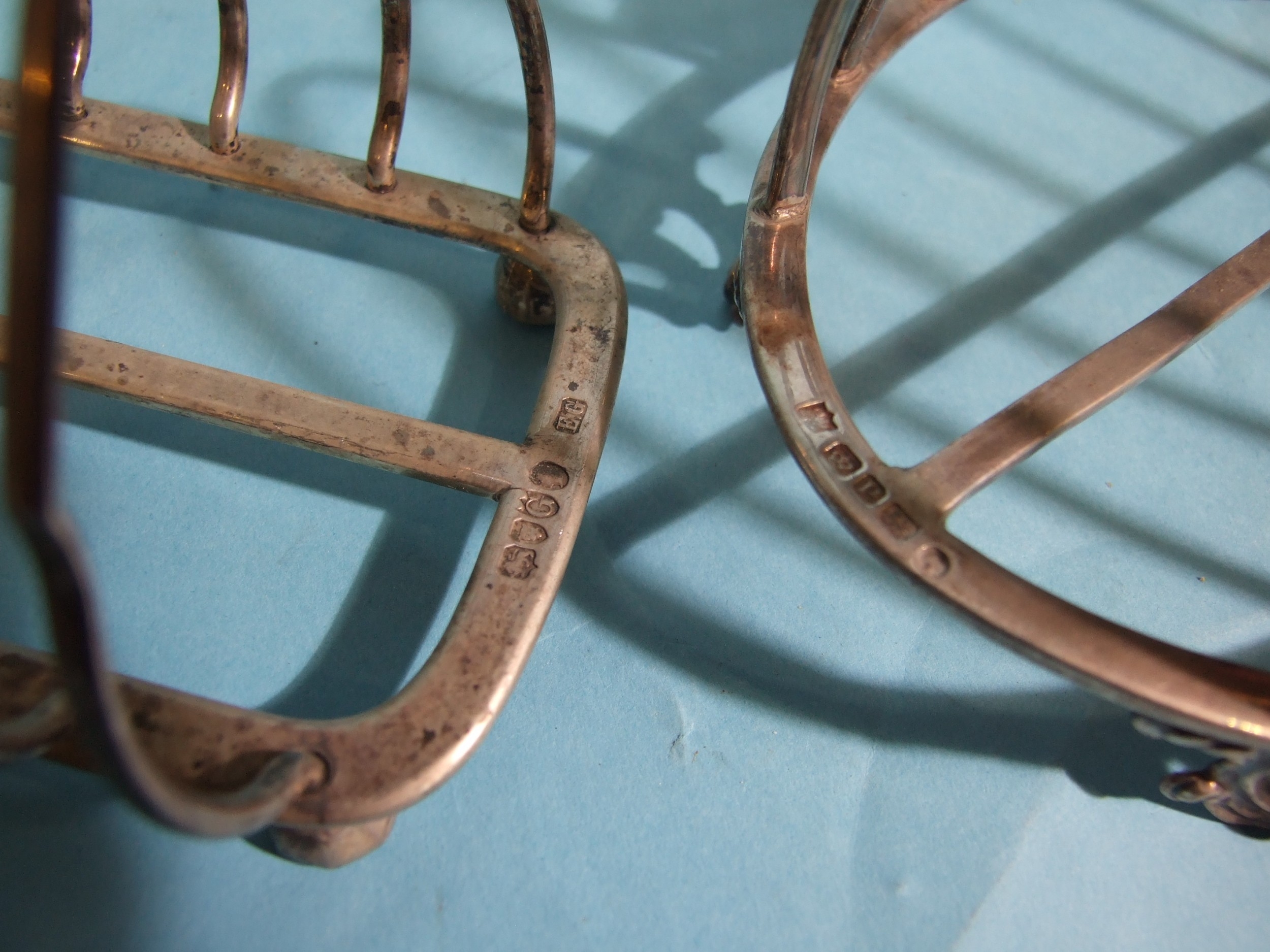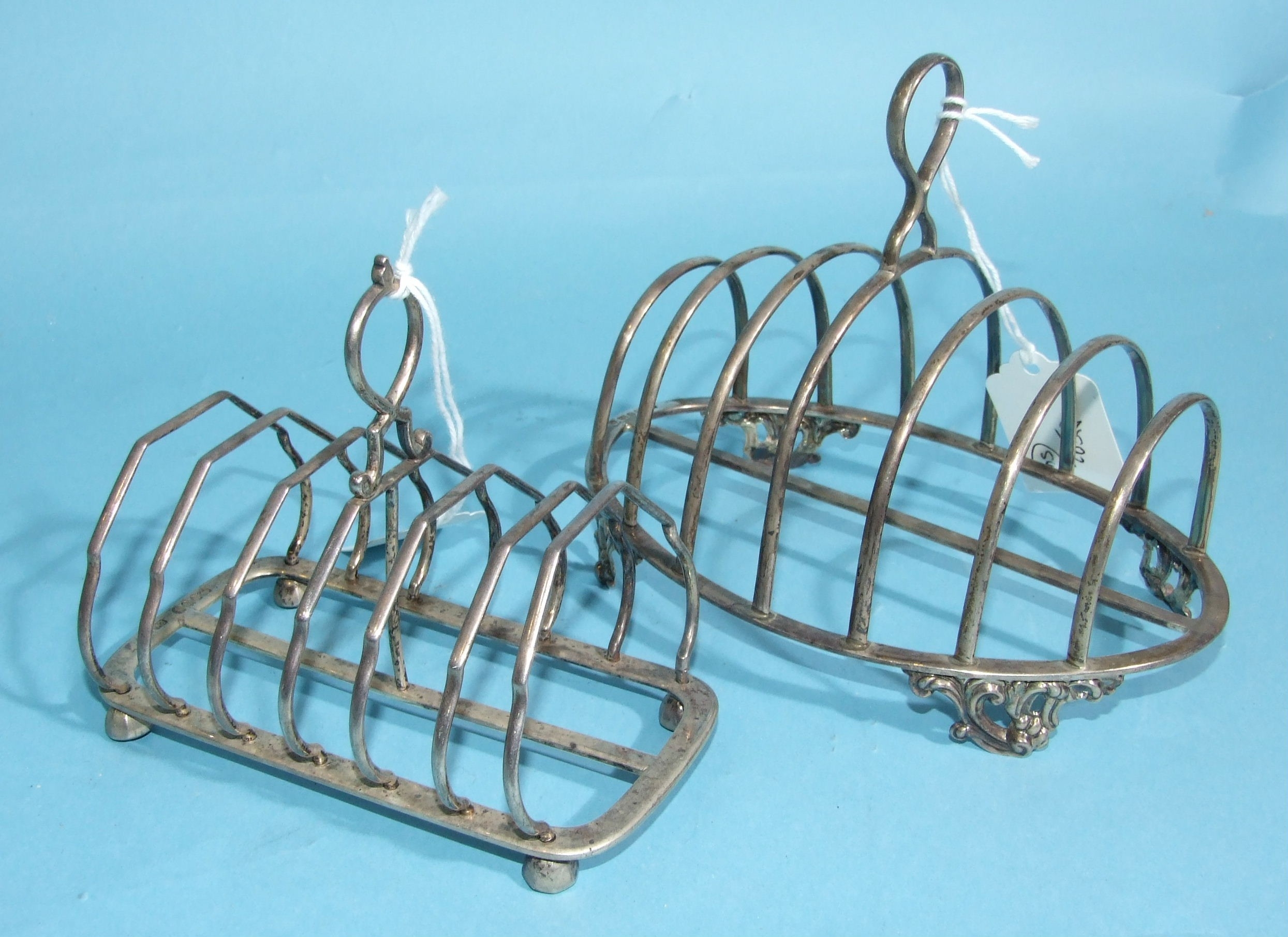 A Victorian silver oval toast rack on pierced scroll feet, 13.5cm high, Sheffield 1858, maker MH & Co, 184.7g, ___5.9oz and another silver rectangular toast rack, 10.5cm high, London 1882, 171g, ___5.5oz, (2).