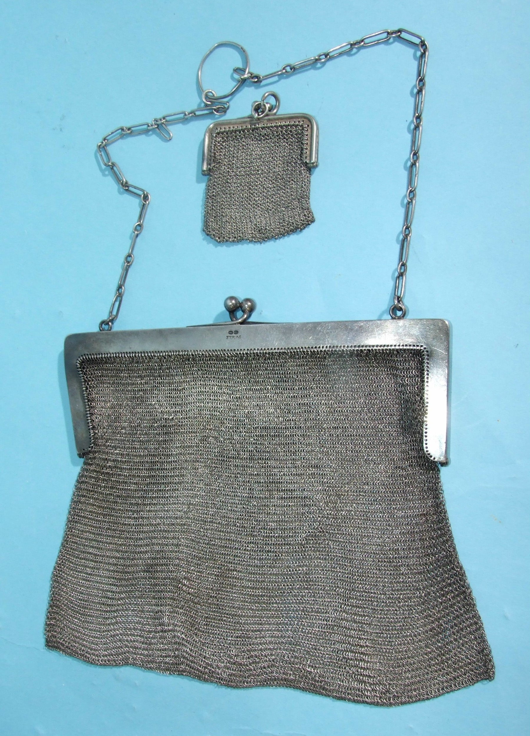 A sterling silver chainmail bag marked 925 Sterling, 16.5 x 17.5cm, ___8.7oz, 272.5g, together with a white metal purse, (2).