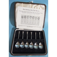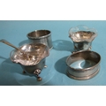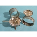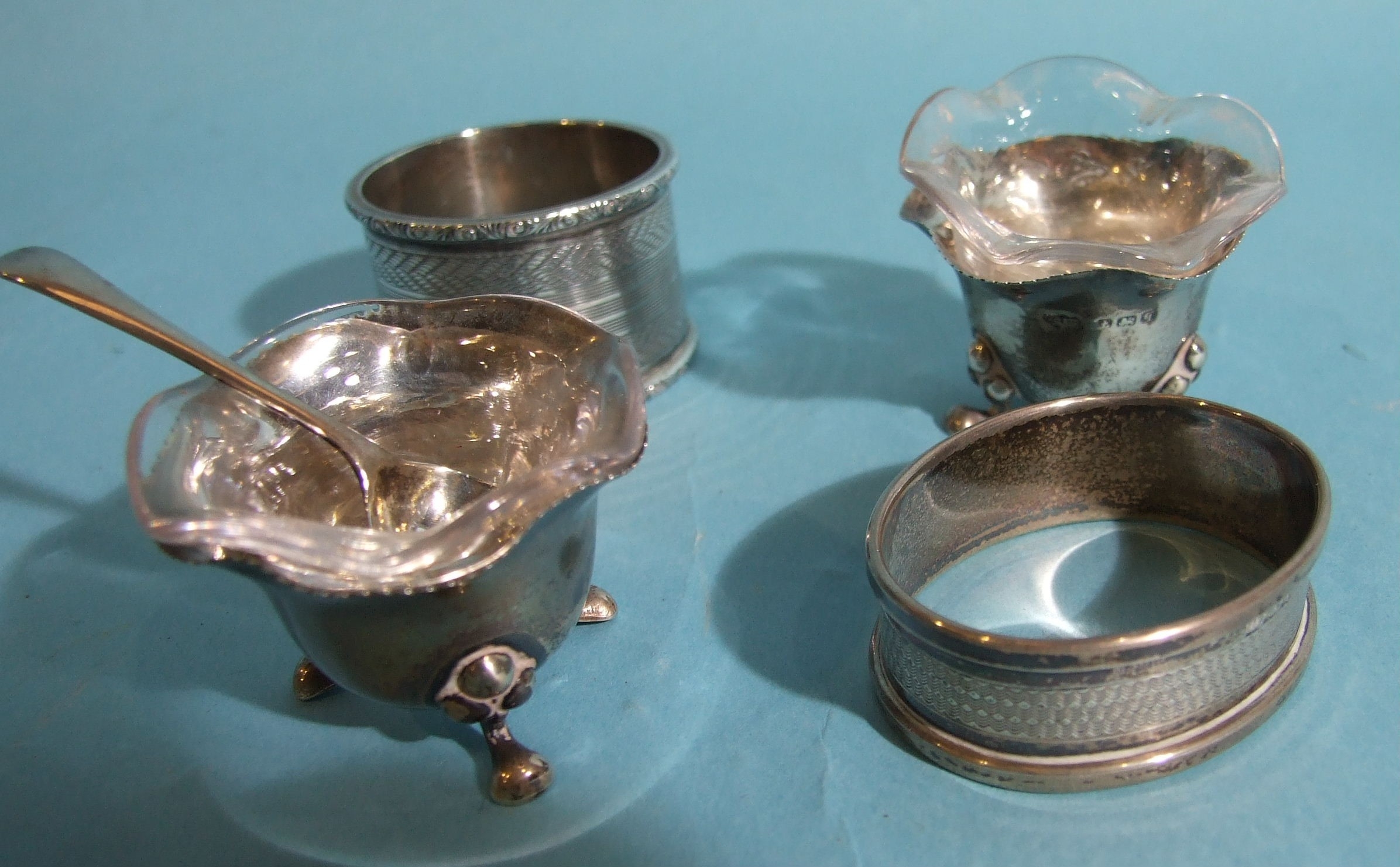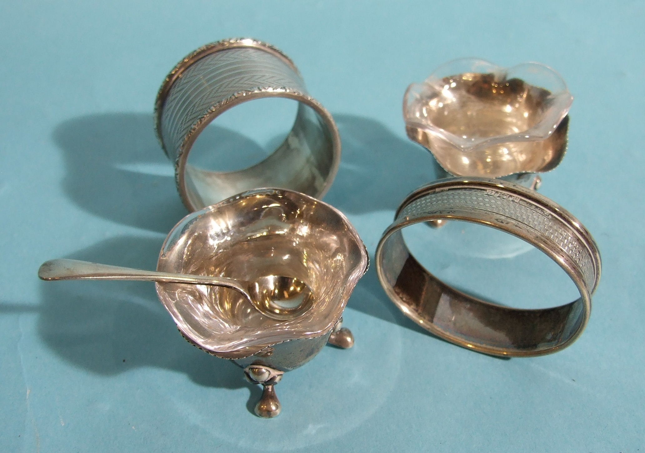 A pair of small silver flower-shaped salts with clear glass liners, 4.5cm diameter, 3cm high, a silver salt spoon and two silver napkin rings, total weight 89.5g, ___2.8oz.
