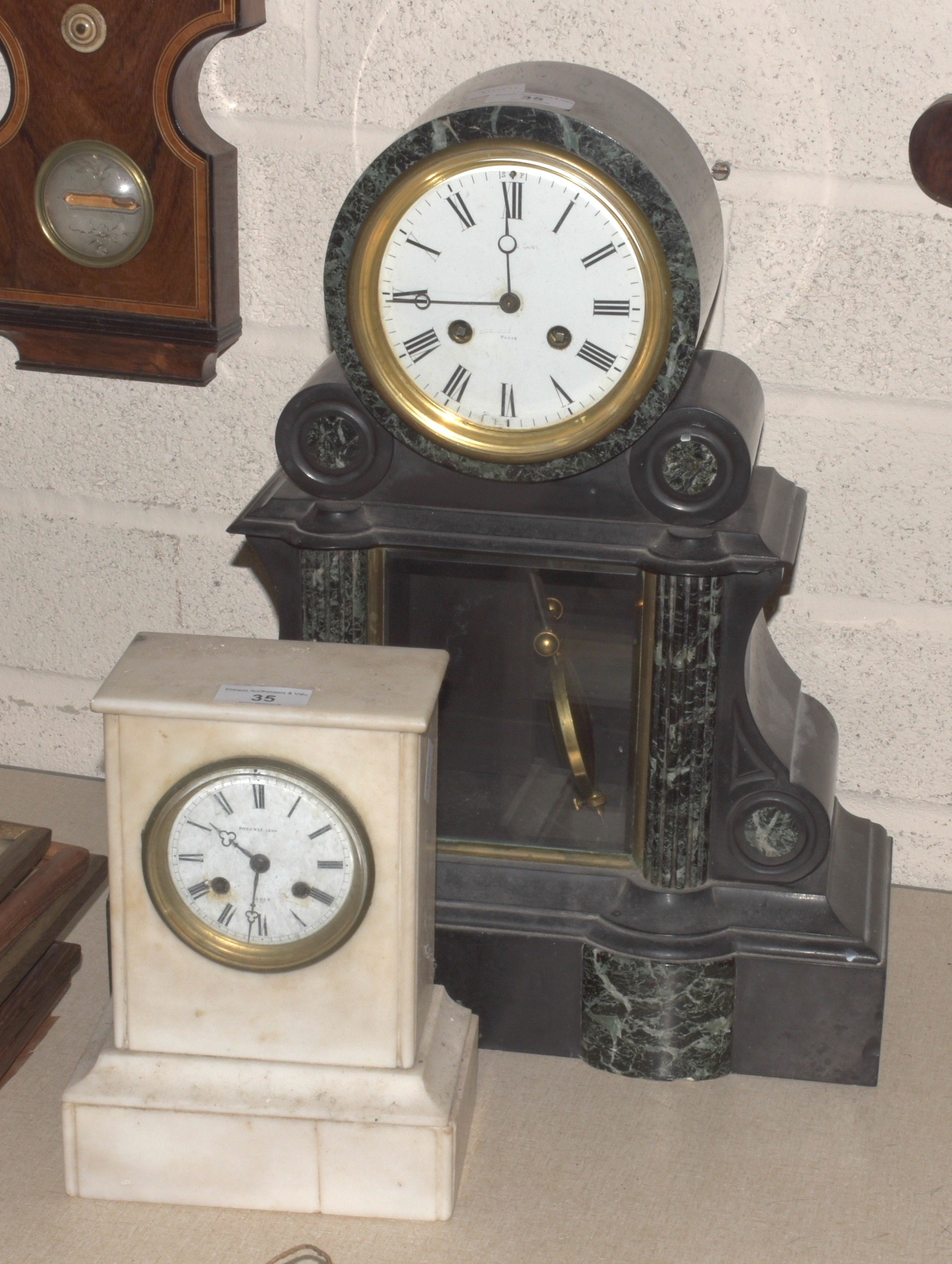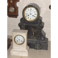 A late-19th century French black slate and green-veined marble mantel clock, the drum movement striking on a bell, marked S Marti, 45cm high, 38cm wide, (glass panel at back of movement cracked), together with a smaller white marble striking mantel clock marked Potonie Leon, Paris, on dial, 22.5cm high, (a/f), (2).