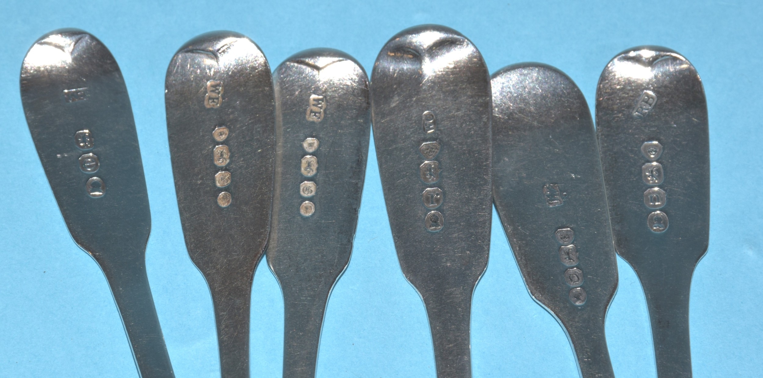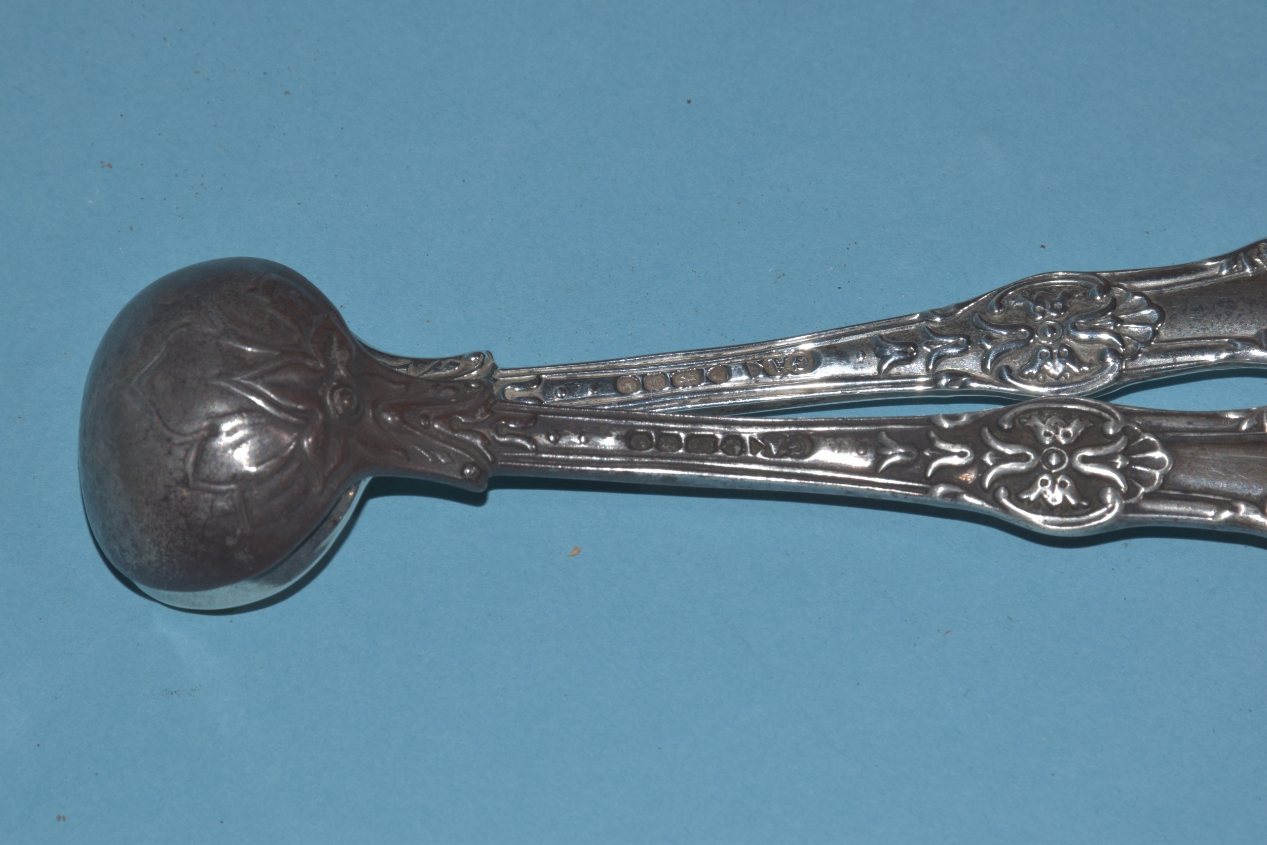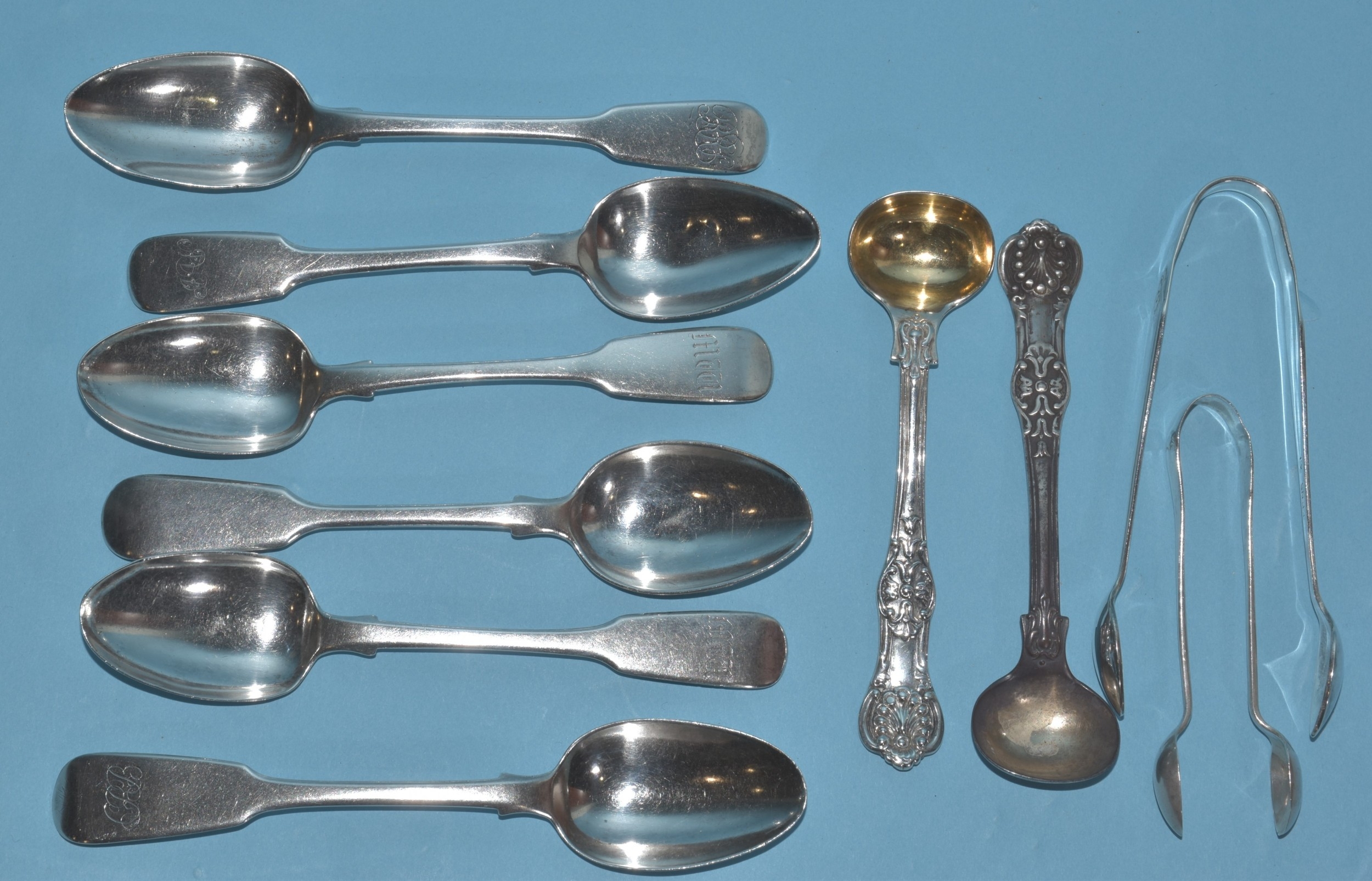 A pair of Victorian silver mustard spoons, London 1853, by Chawney & Co, six 19th century silver teaspoons, various dates, a silver sugar tong and a plated sugar tong, silver weight 200g, ___6.4oz.