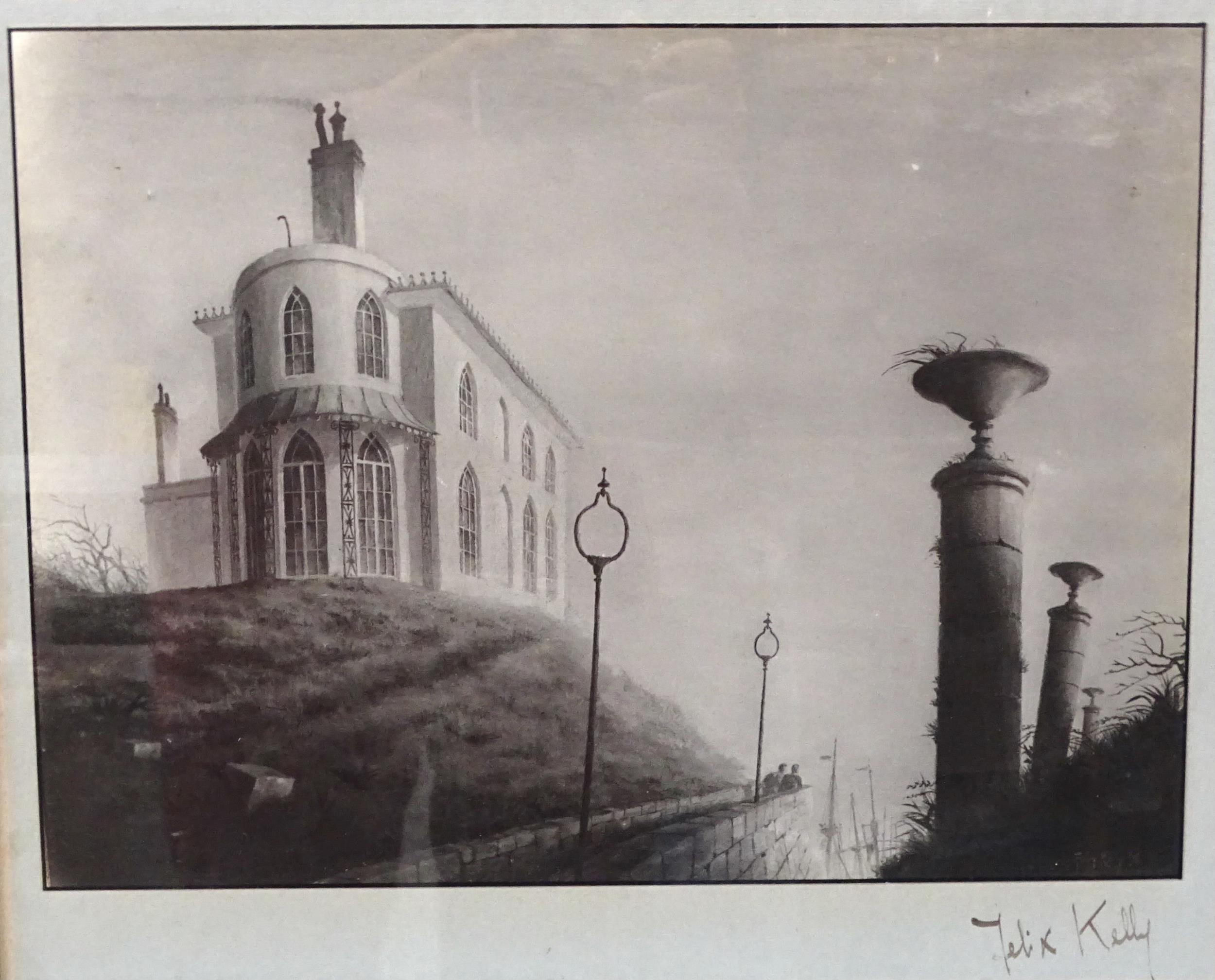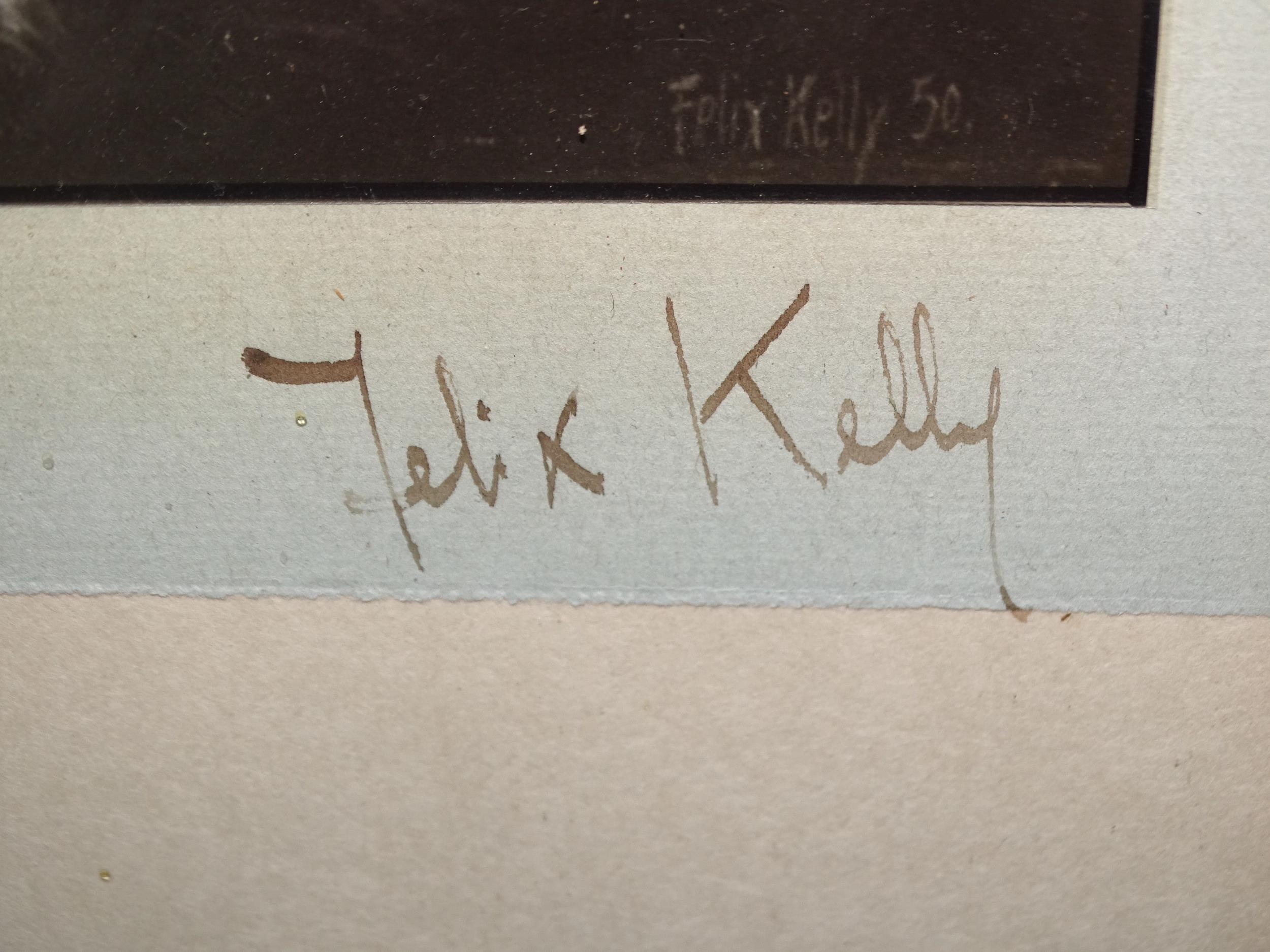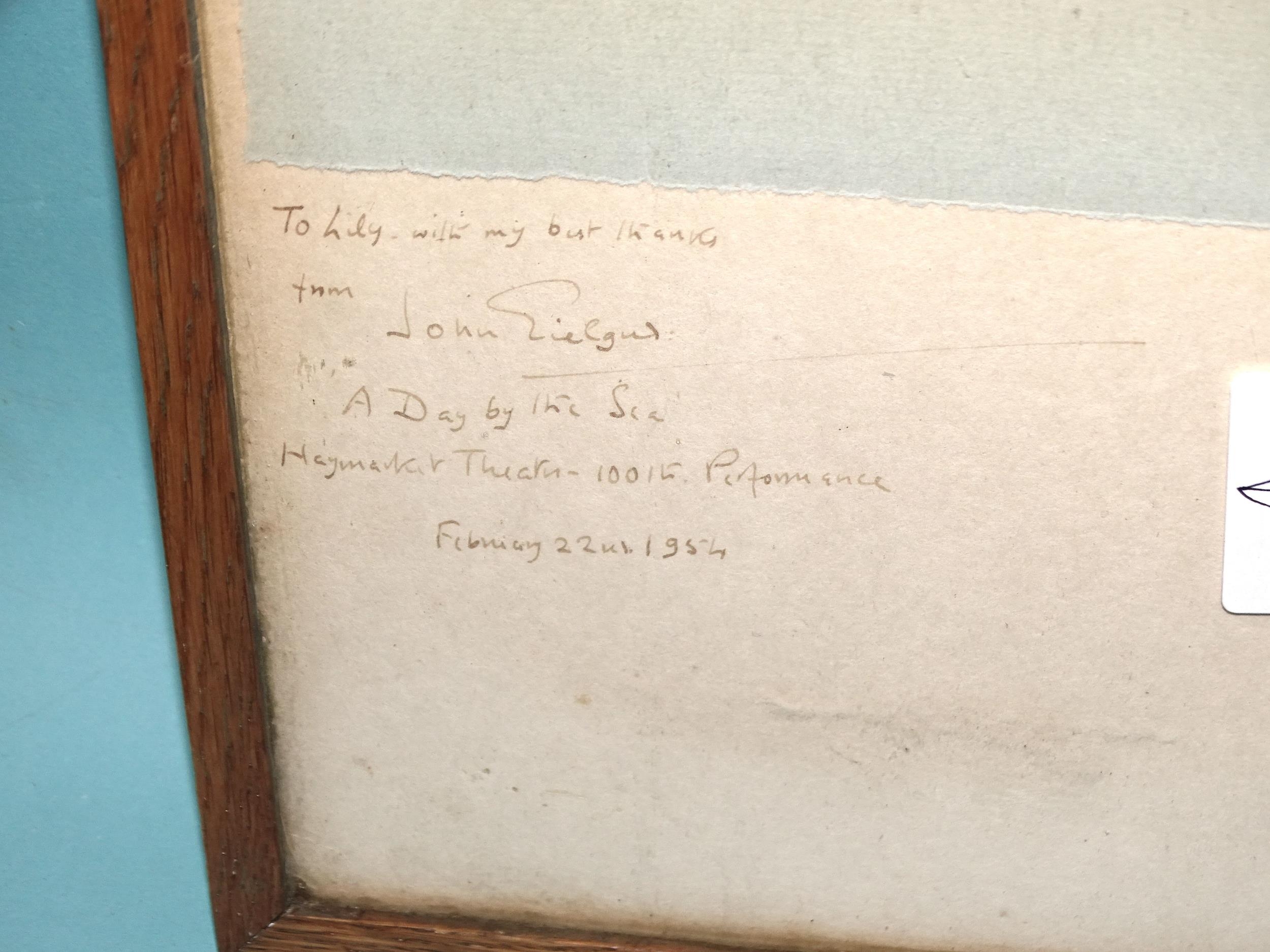 After Felix Kelly, "A Day in the Sun", monochrome print, signed in the margin and further inscribed To Lily with my best thanks, from John Gielgud, "A Day by the Sea", Haymarket Theatre, 100th Performance, February 22nd 1954, together with a coloured photographic print of the young John Gielgud with Pamela Brown in The Lady's Not for Burning.