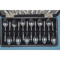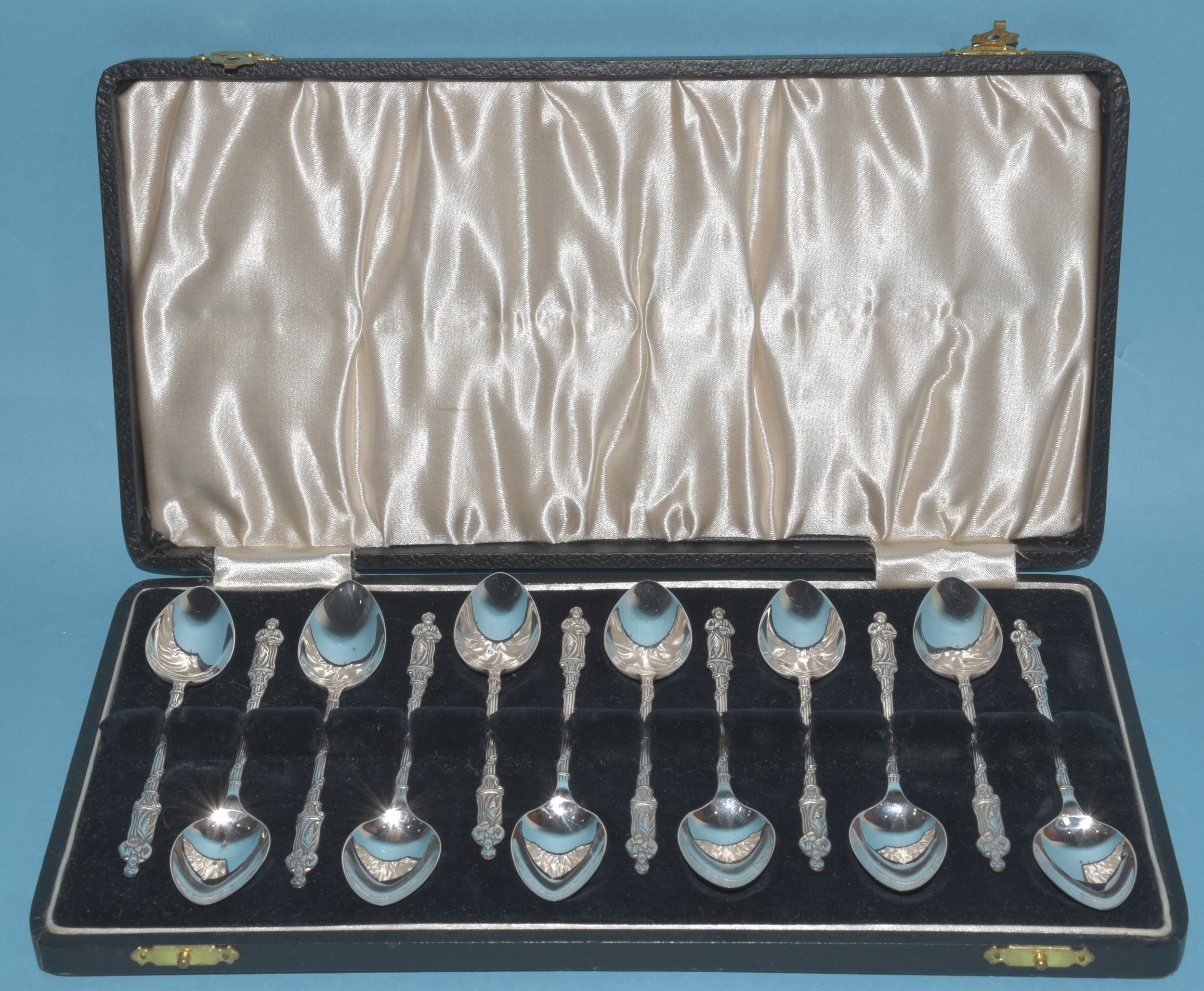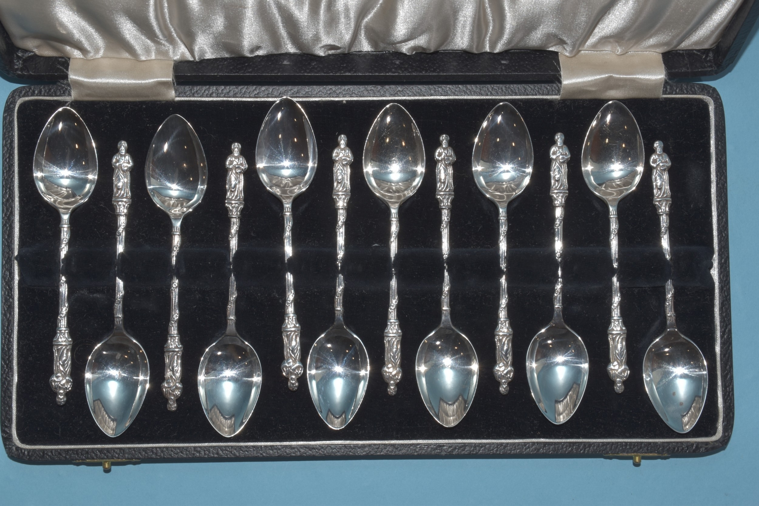 A cased set of twelve silver apostle spoons, Birmingham 1932, maker A J Bailey, 120g, ___3.8oz.