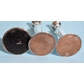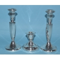 A pair of George V silver candlesticks with hexagonal columns, on circular loaded bases, 18.5cm high, Birmingham 1922 and a smaller silver loaded-base candlestick, 8cm high, Birmingham 1921, (3).