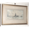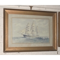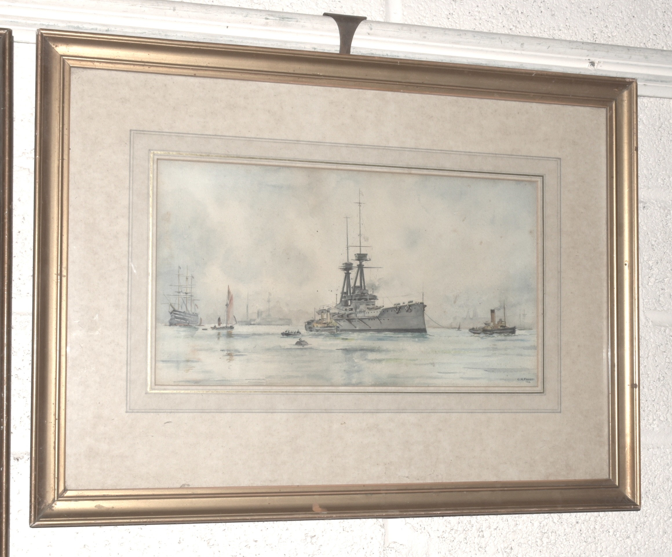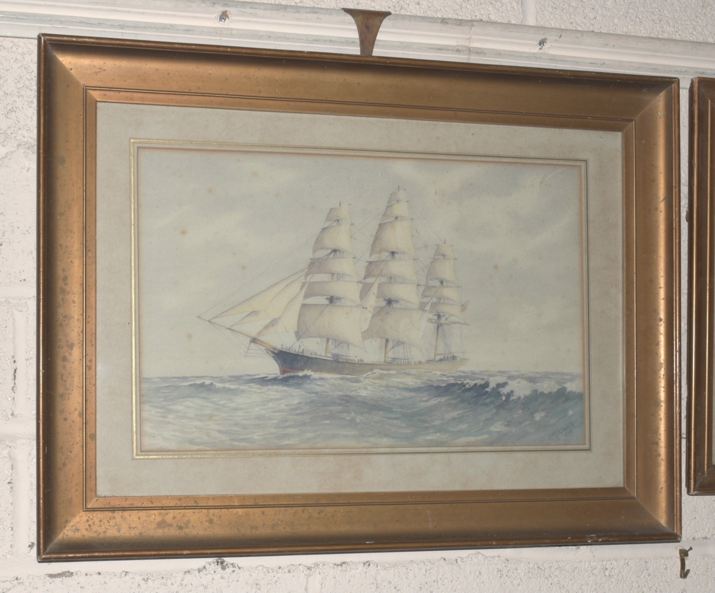 Percy G Dalton (1906-1982), 'Three-masted sailing ship in full sail', signed watercolour dated 1928, 25 x 40cm, together with another watercolour depicting a WWI battleship with two paddle steamer tugs and other shipping, signed G H Frost and dated 1914, 18 x 33cm, (2).