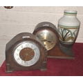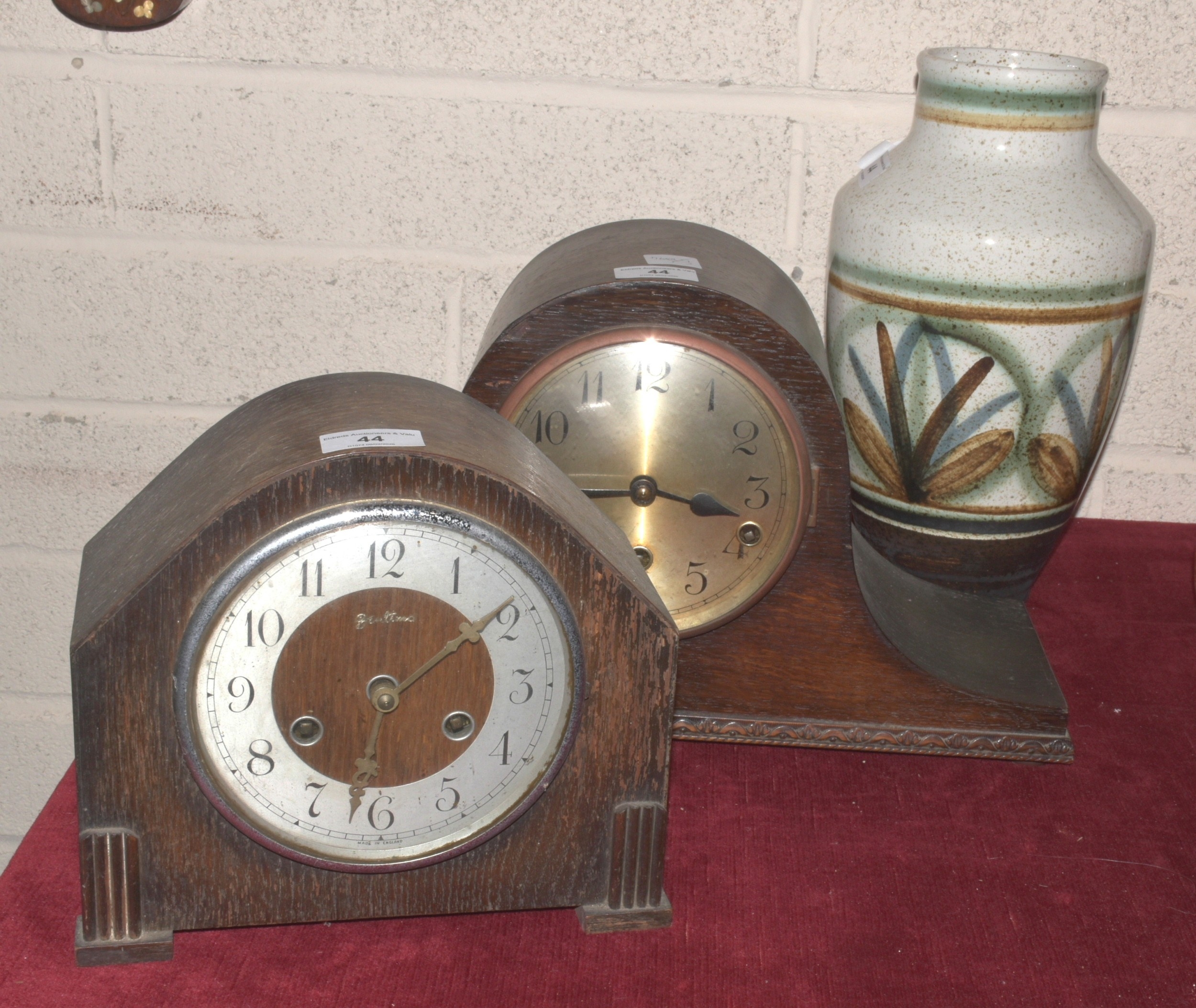A Cinque Ports Pottery Rye decorated baluster vase, 33cm high and two oak-cased mantel clocks (a/f), (3).