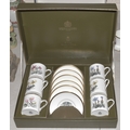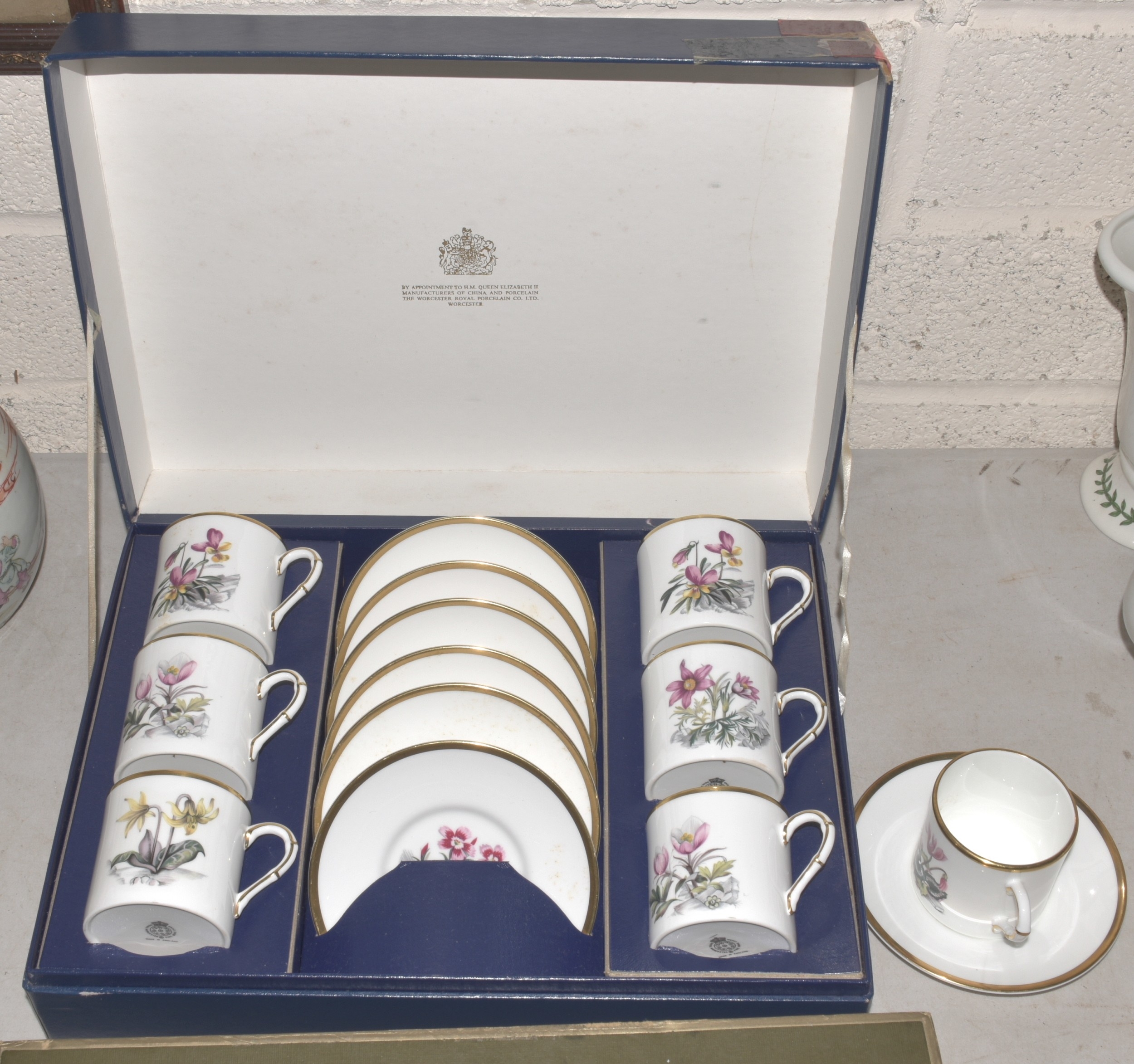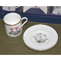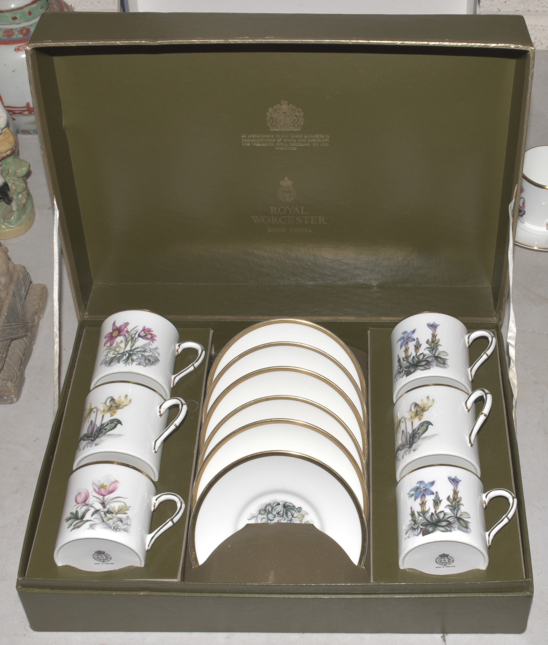 Two Royal Worcester boxed sets of six each coffee cans and saucers decorated with Alpine flowers, (with one additional cup and saucer in the same pattern).