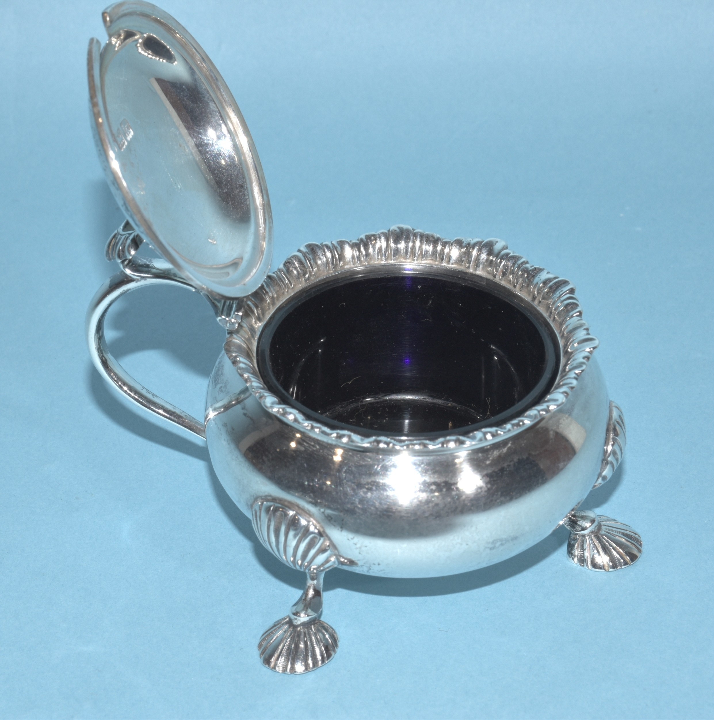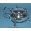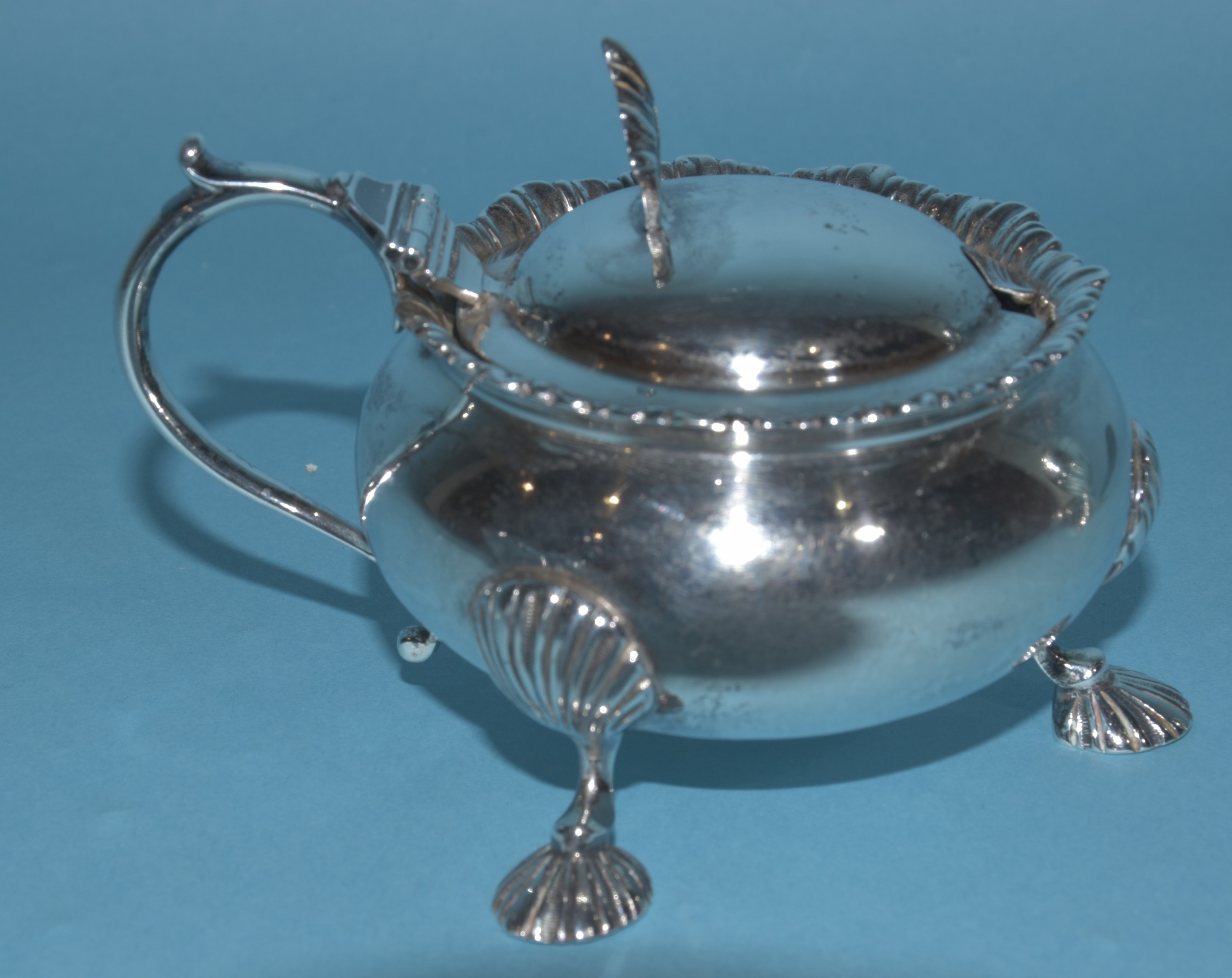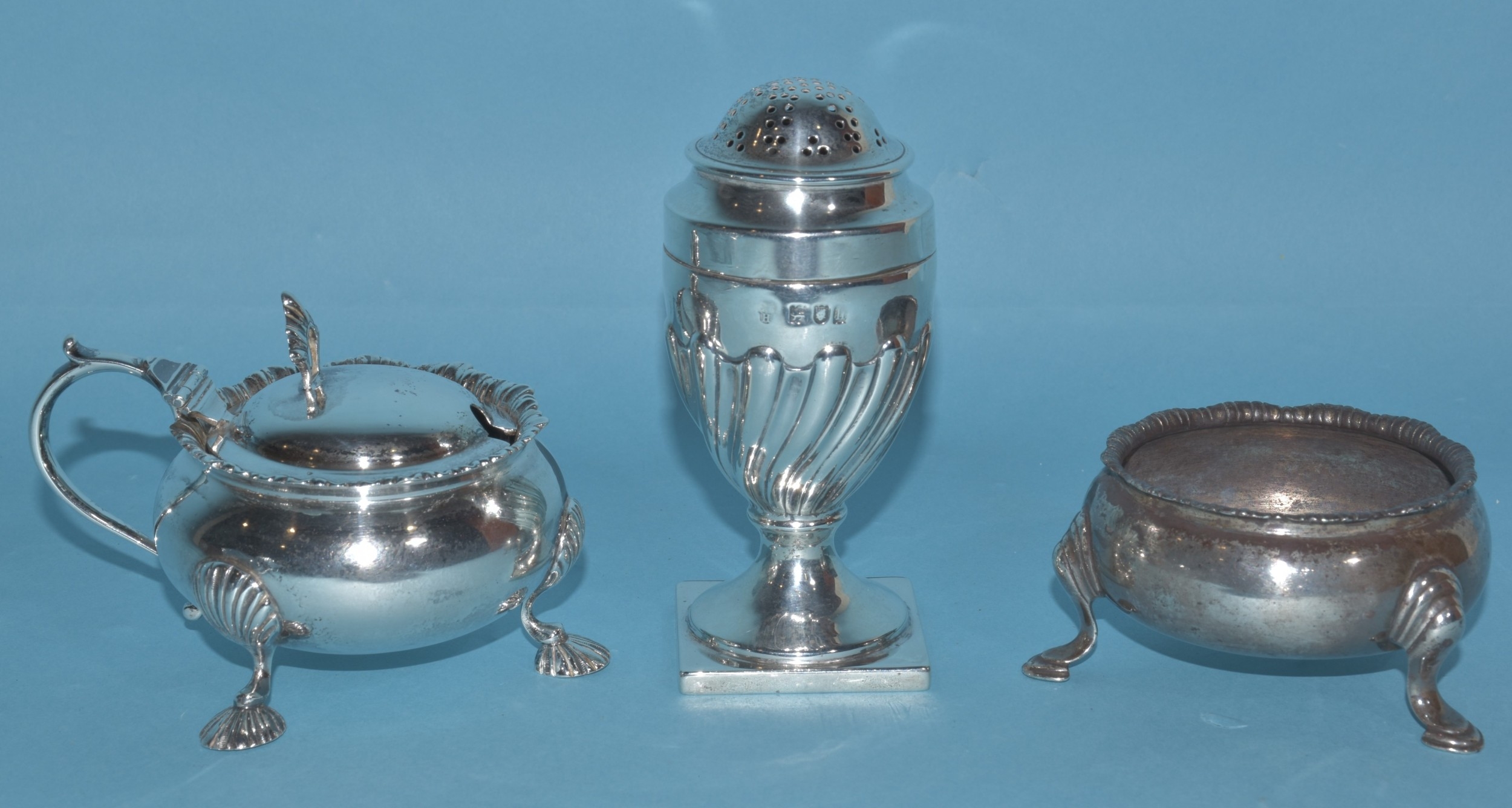 An Edwardian silver mustard of circular form, with gadrooned rim and hinged lid, on three hoof feet, 8cm diameter, 6cm high, London 1905, maker Horace Woodward & Co. Ltd, includes glass liner, an Edwardian silver pepperette, 11cm high, London 1903 and a Georgian silver salt, 7cm diameter, (marks rubbed), total silver weight 325g, ___10.4oz.