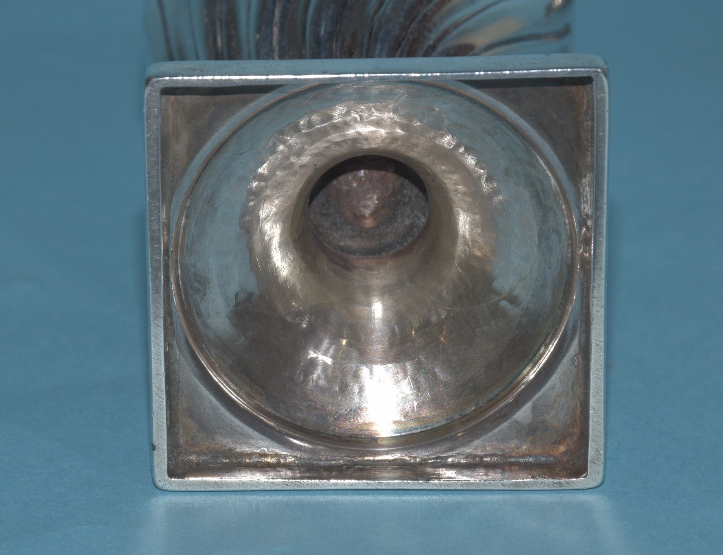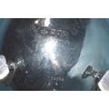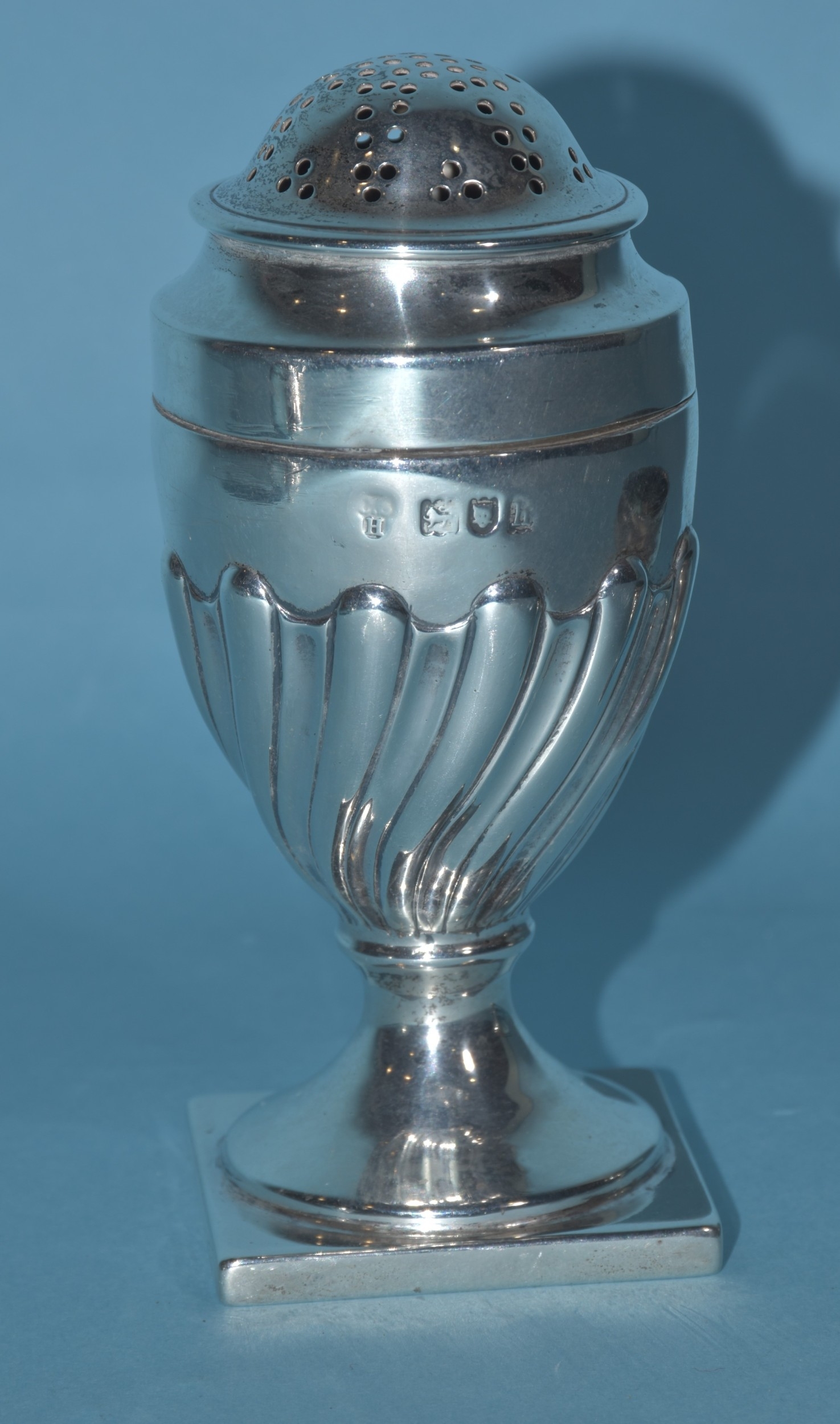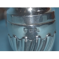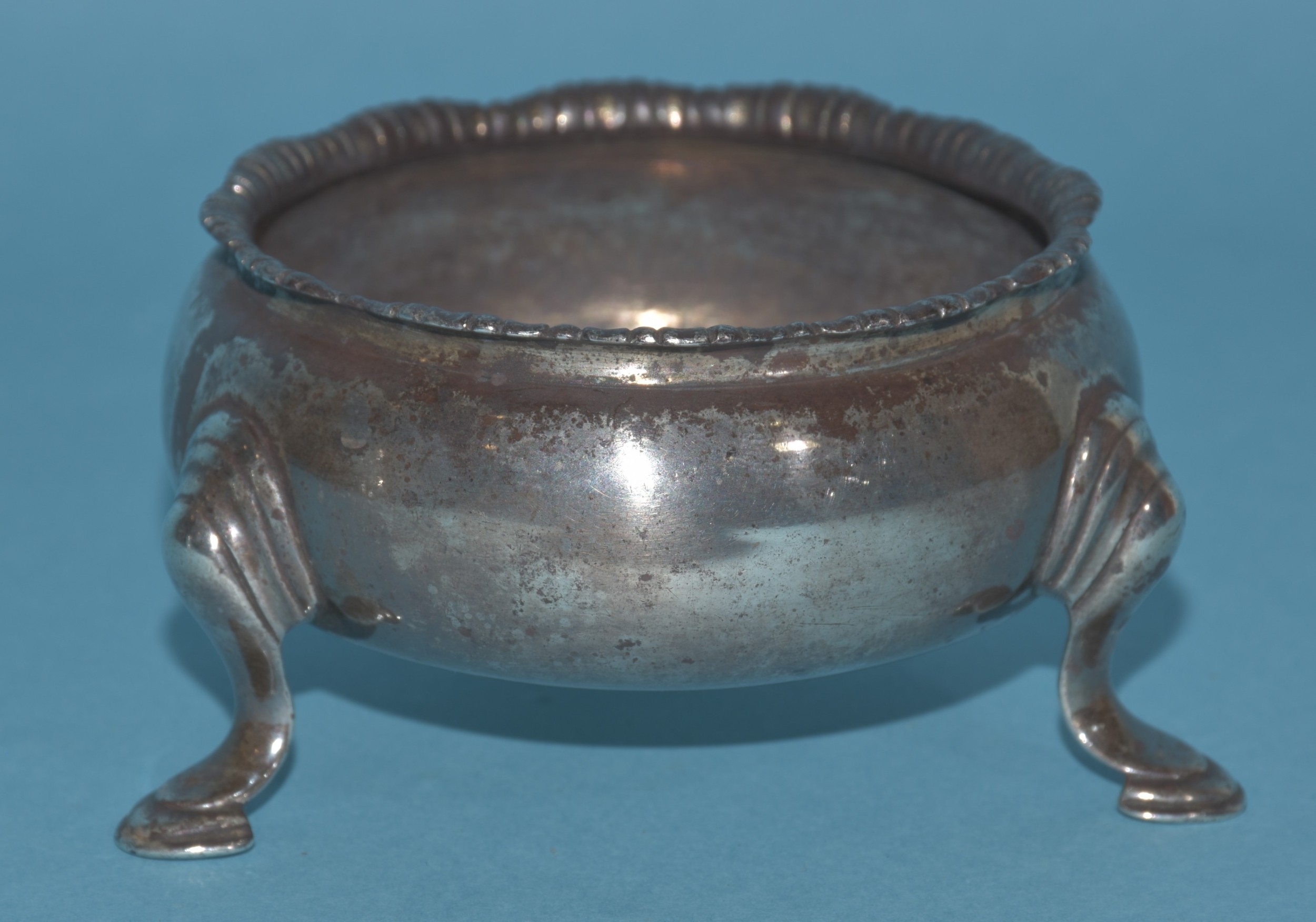 An Edwardian silver mustard of circular form, with gadrooned rim and hinged lid, on three hoof feet, 8cm diameter, 6cm high, London 1905, maker Horace Woodward & Co. Ltd, includes glass liner, an Edwardian silver pepperette, 11cm high, London 1903 and a Georgian silver salt, 7cm diameter, (marks rubbed), total silver weight 325g, ___10.4oz.