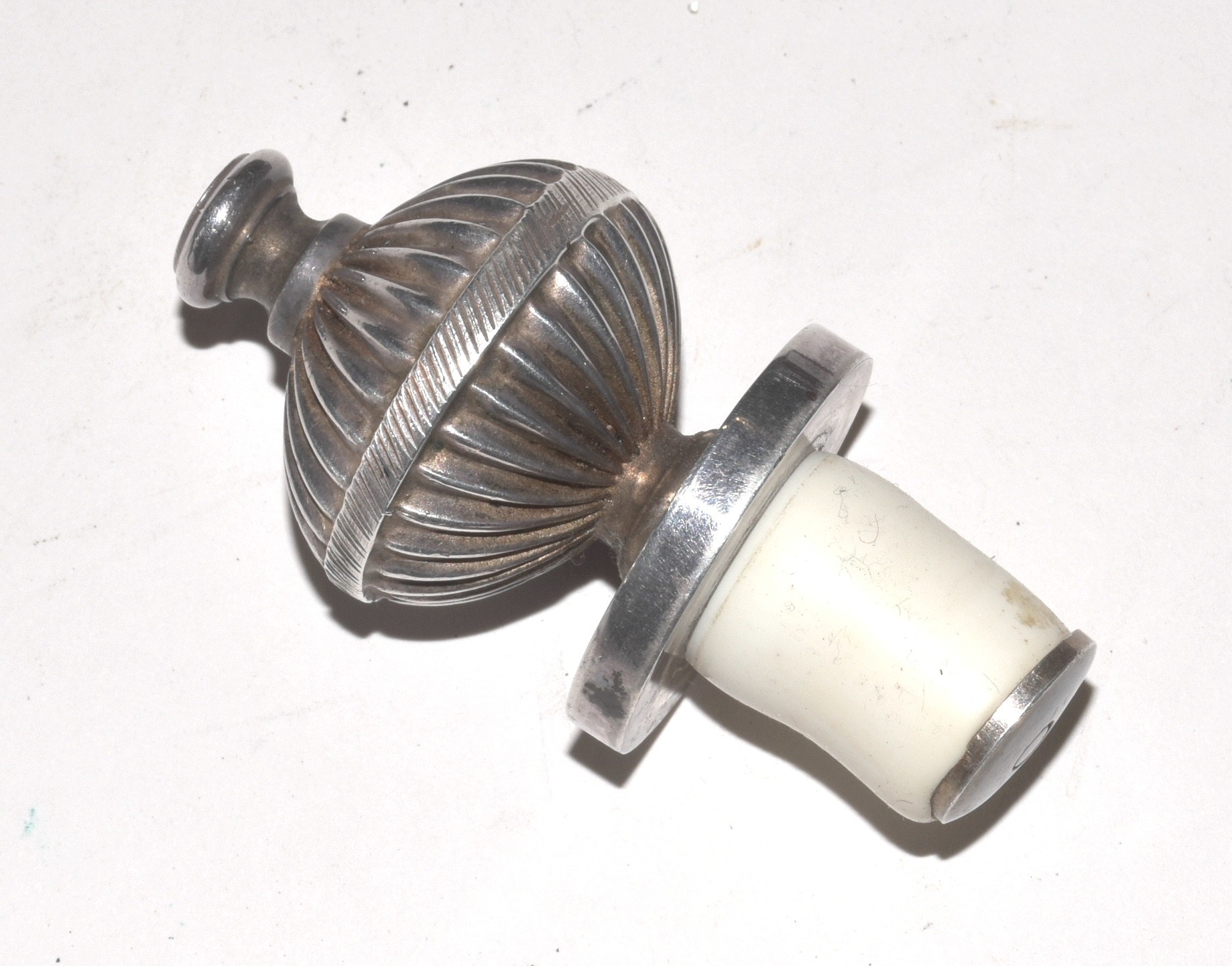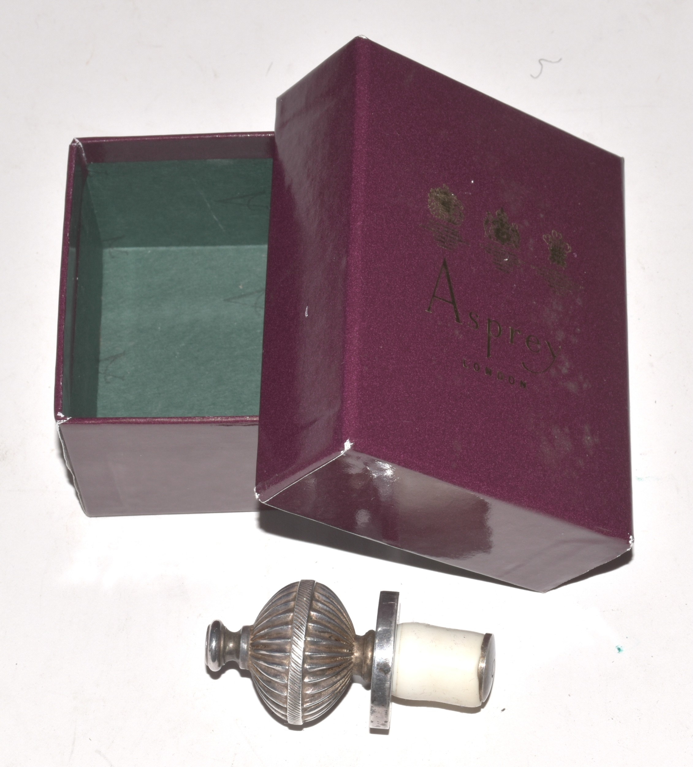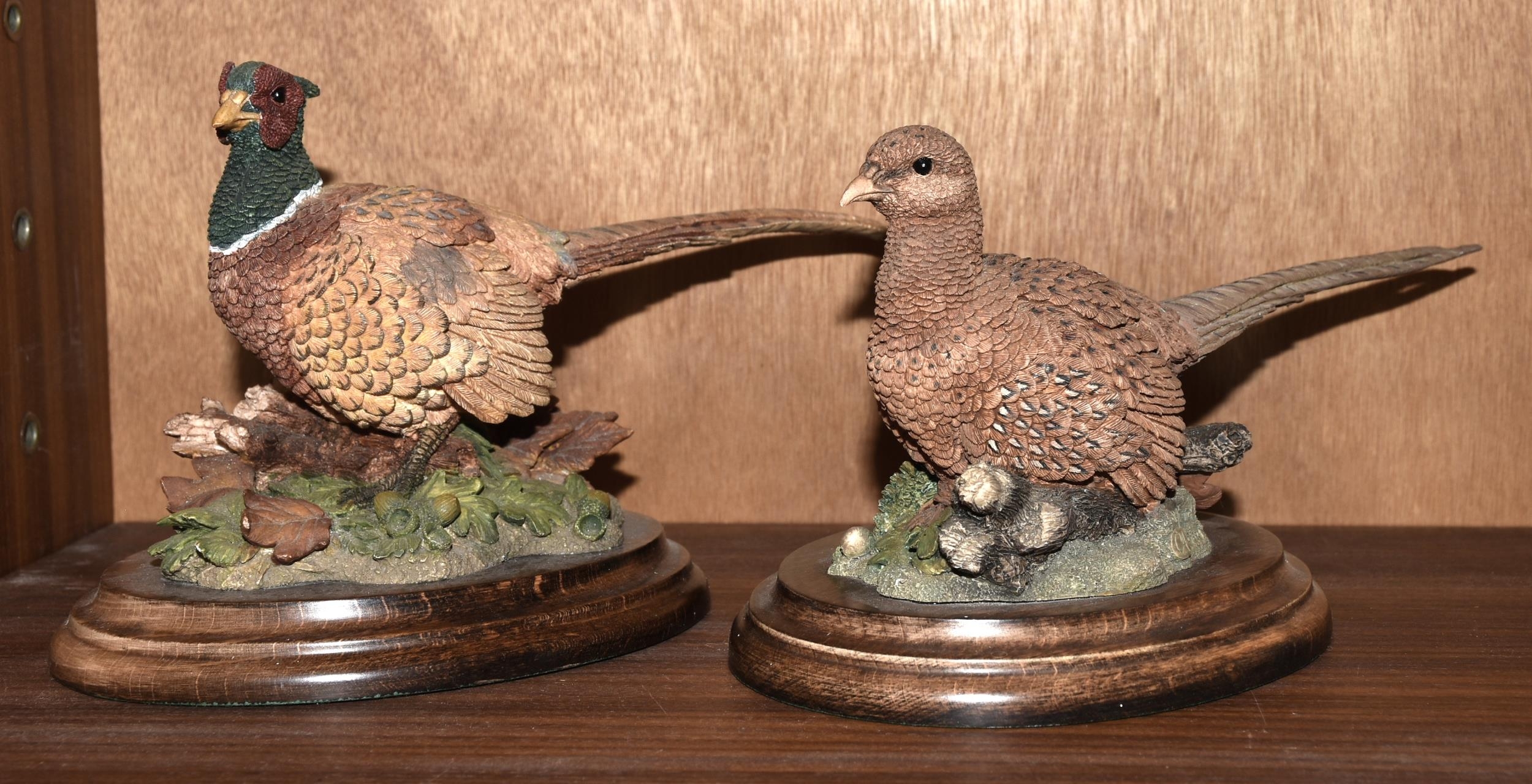 Two Country Artists composite models of cock and hen pheasants, 20cm x 12cm and an Asprey's silver-plated bottle stopper of reeded form, 6.5cm, (in box), (3).
