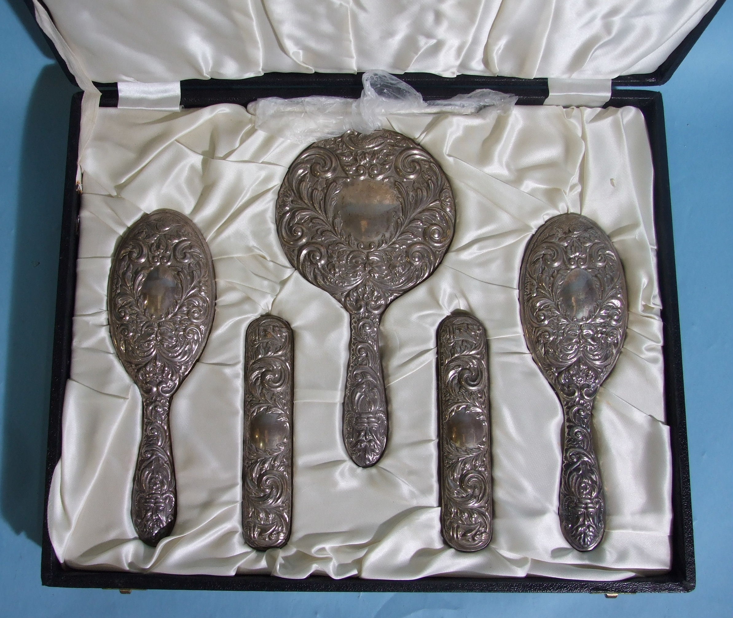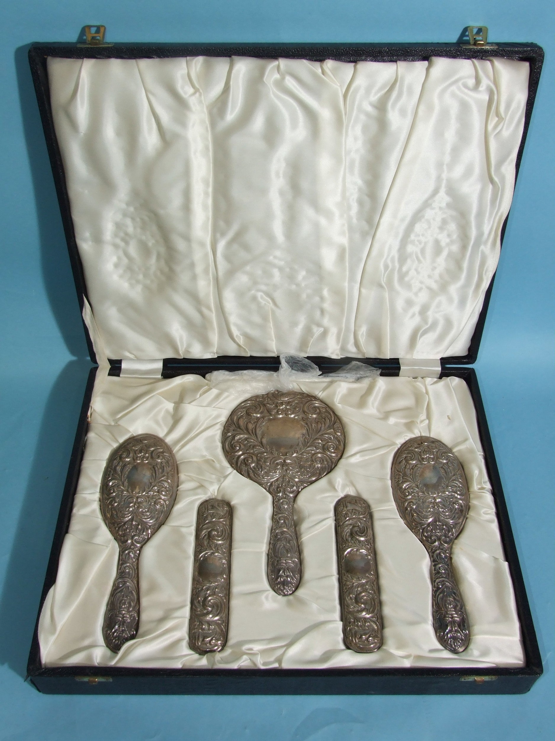 A 20th century six-piece sterling silver dressing table set, comprising: hand mirror, two hair brushes, two clothes brushes and comb, with embossed decoration, Birmingham 1973.