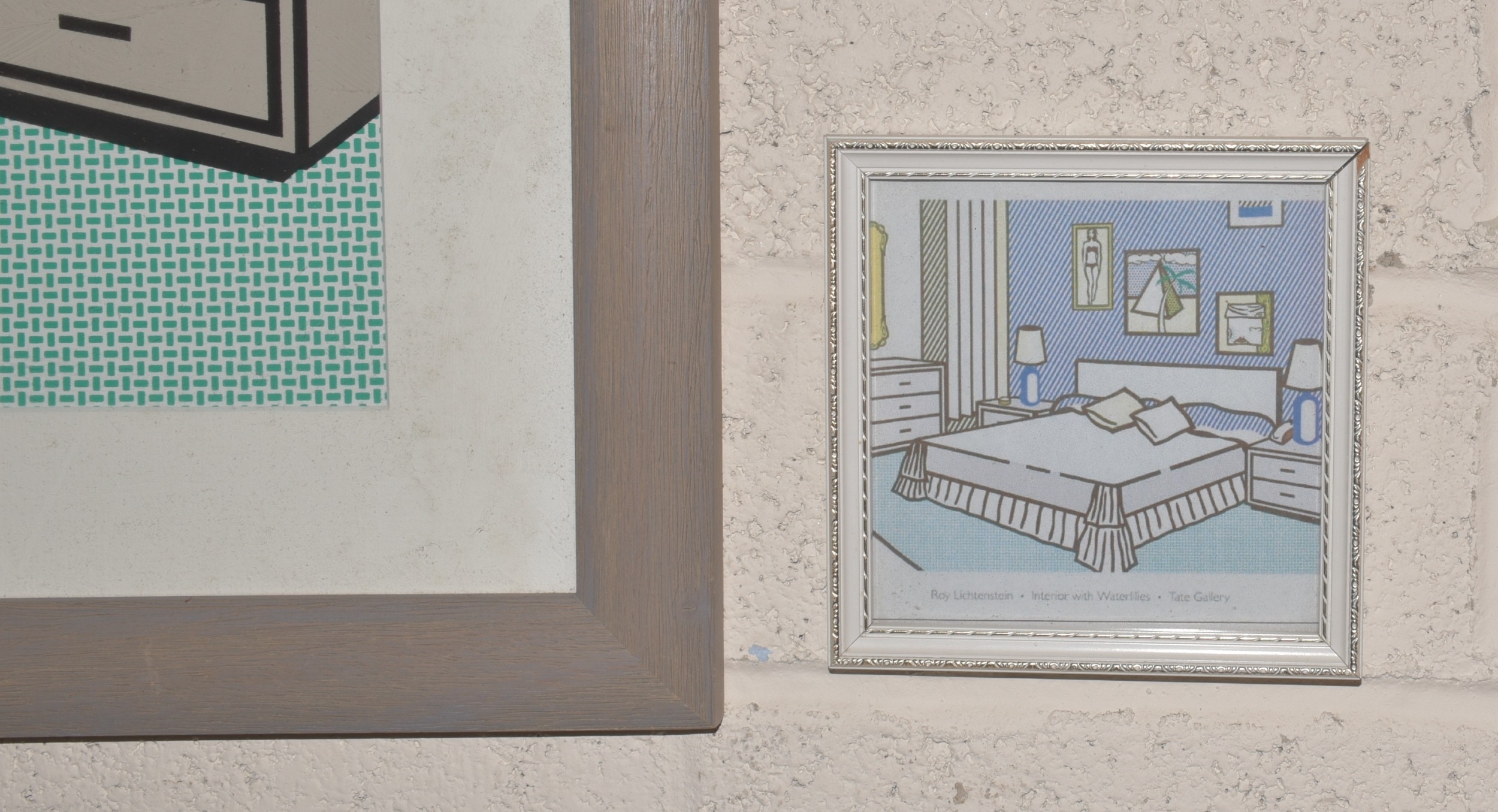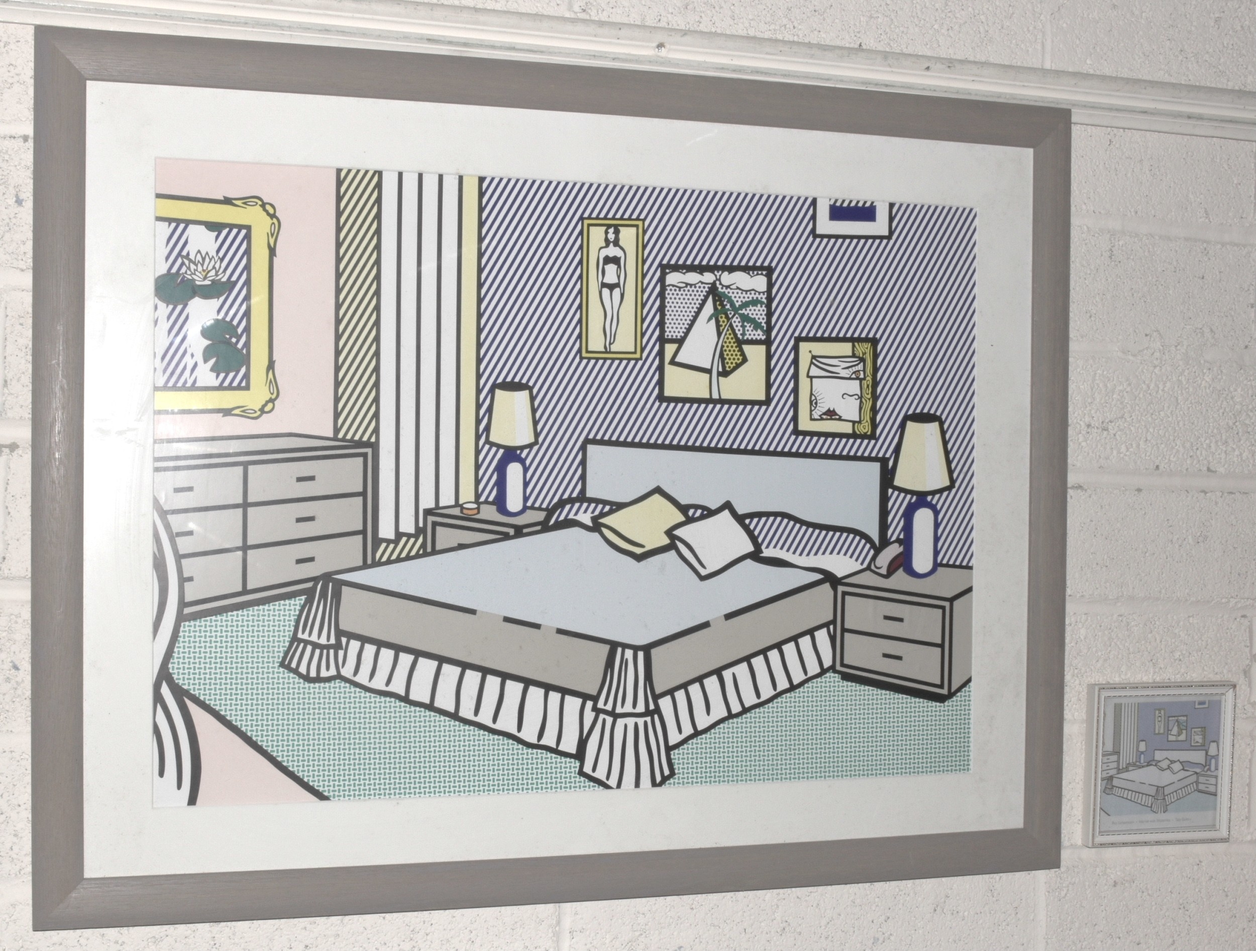 After Roy Lichtenstein, "Interior with waterlilies", a framed print, 48 x 69cm, a smaller print of the same picture, a small framed watercolour of a river scene initialled EGW, 10 x 15.5cm and an indistinctly-signed gouache of a Highland scene, 10 x 22cm, with two small prints, (6).