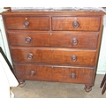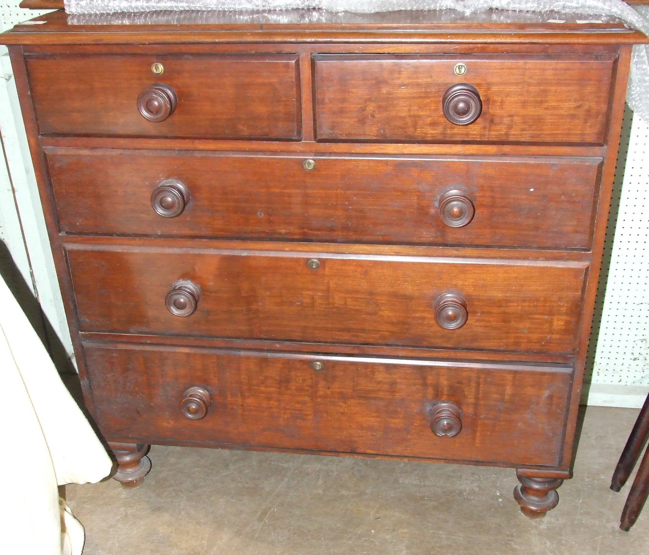 A Victorian mahogany rectangular chest of two short and three long drawers, with turned wood handles, on short turned legs, 109cm wide, 108cm high, in good and solid condition.