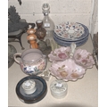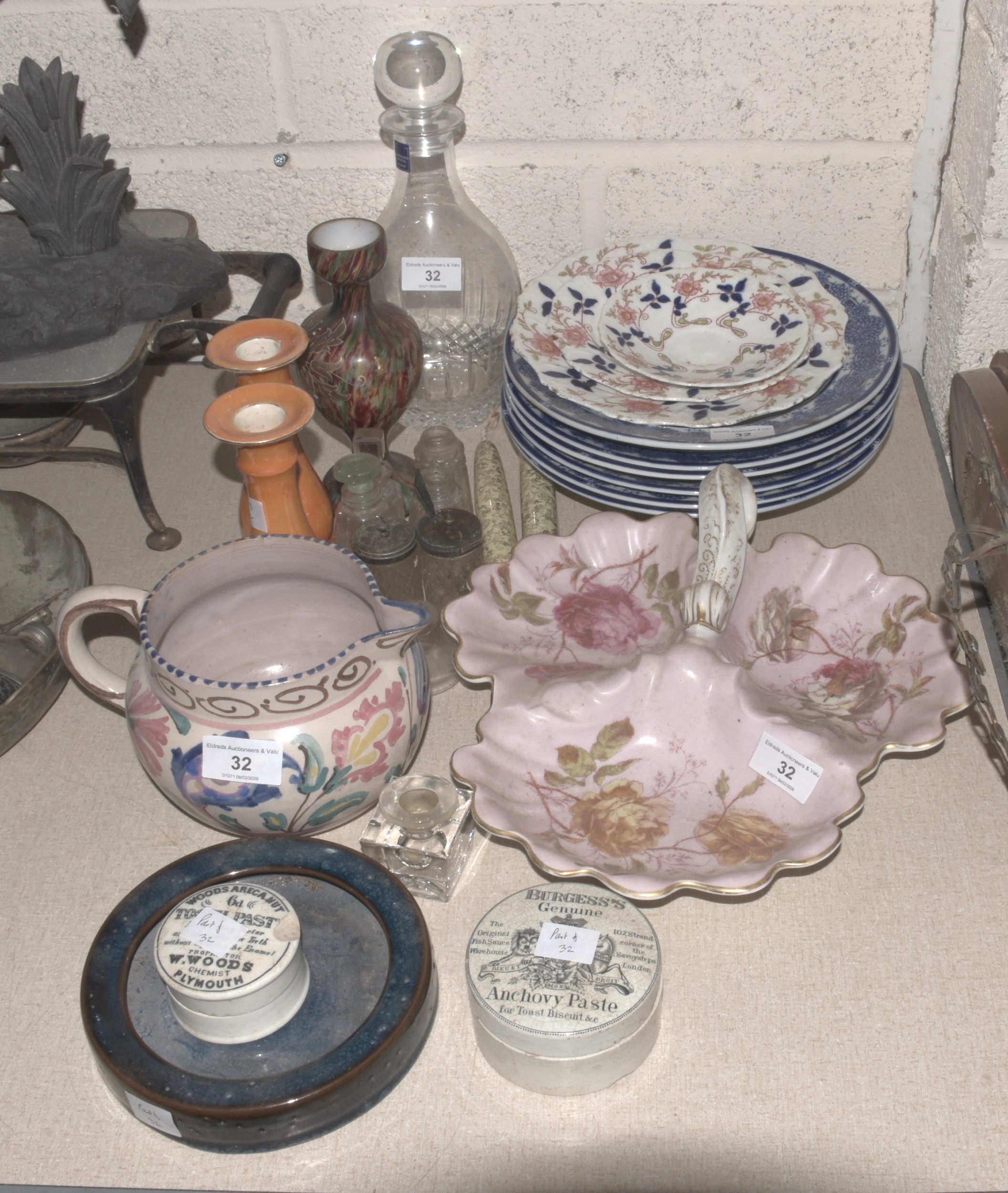 A Honiton Pottery floral-decorated jug, 12cm high, a set of six Royal Worcester soup plates with blue chrysanthemum-decorated border, 25.5cm diameter, a Dartington Crystal glass decanter and stopper and other ceramics.