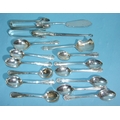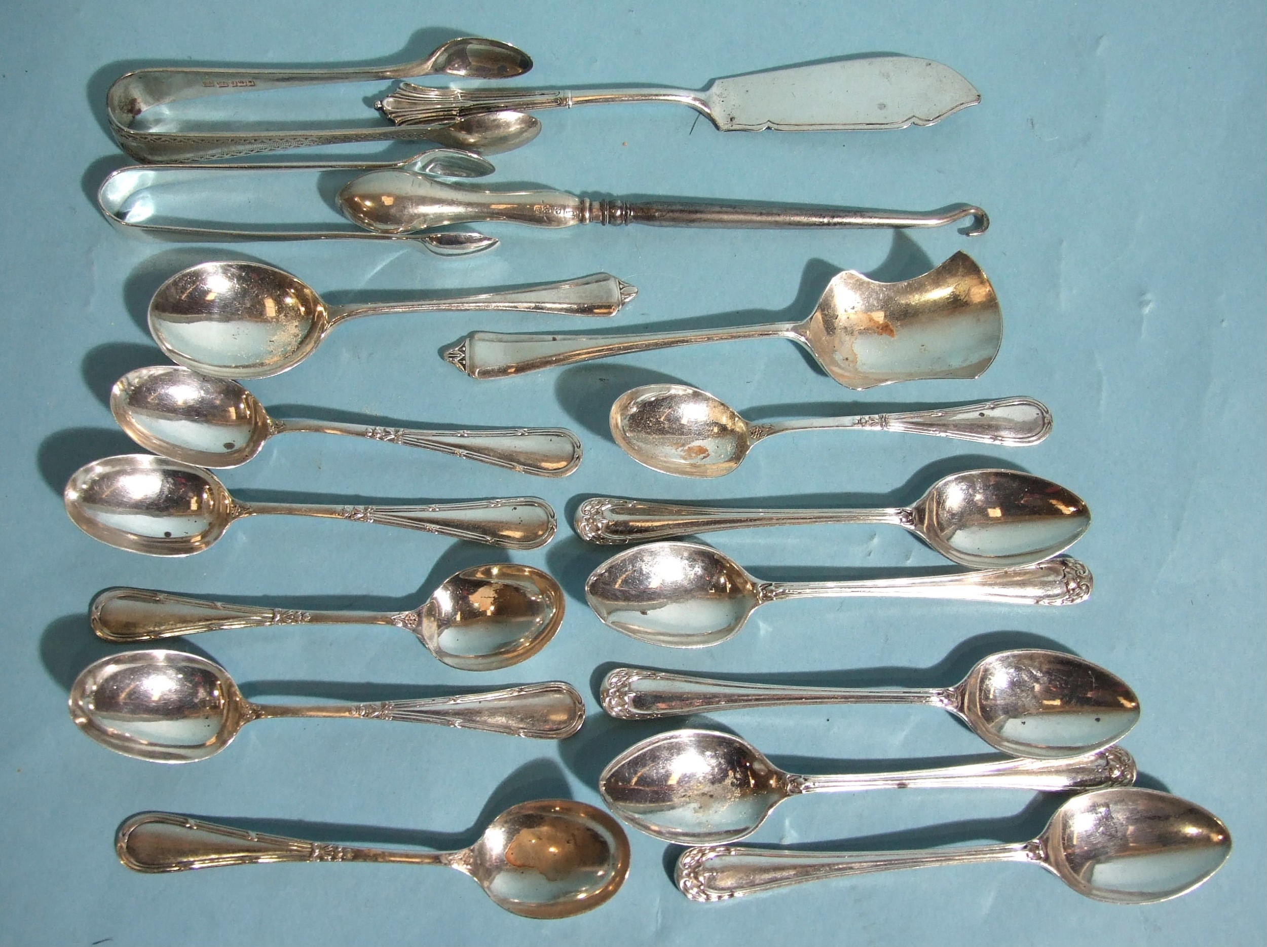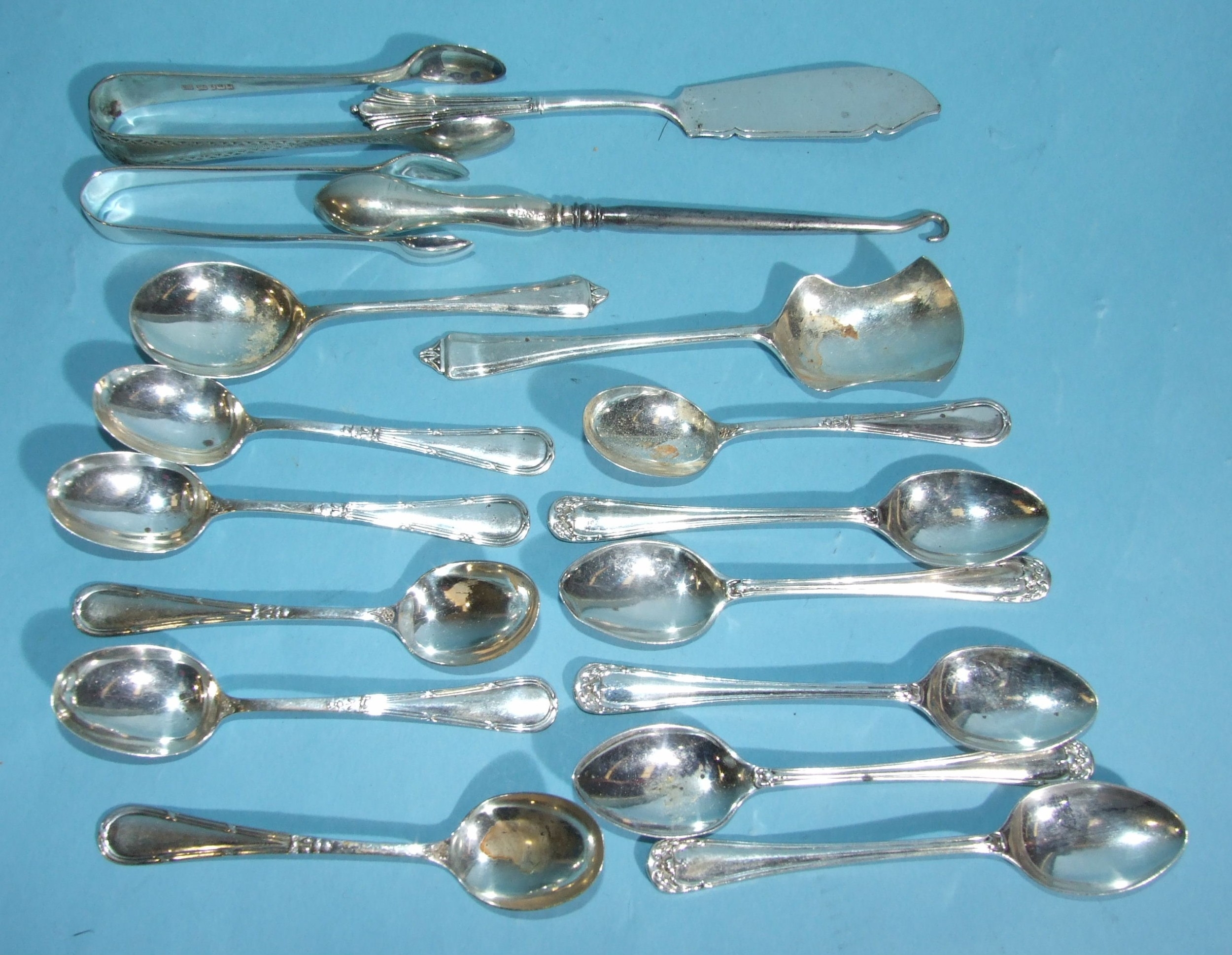 A set of six silver coffee spoons, Birmingham 1923, a Victorian silver butter knife, London 1886 and other silver teaspoons, two pairs of sugar tongs and a button hook, weighable silver 244.7g, ___7.8oz.
