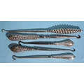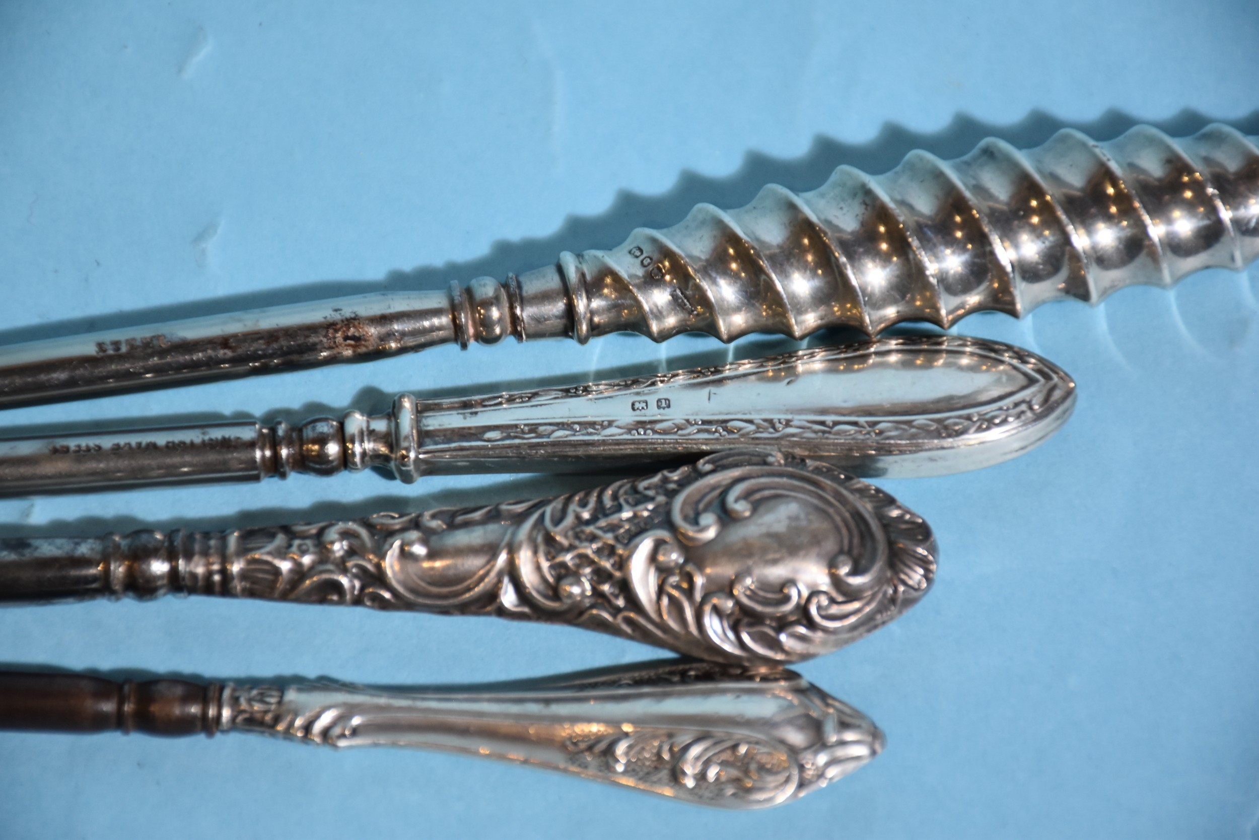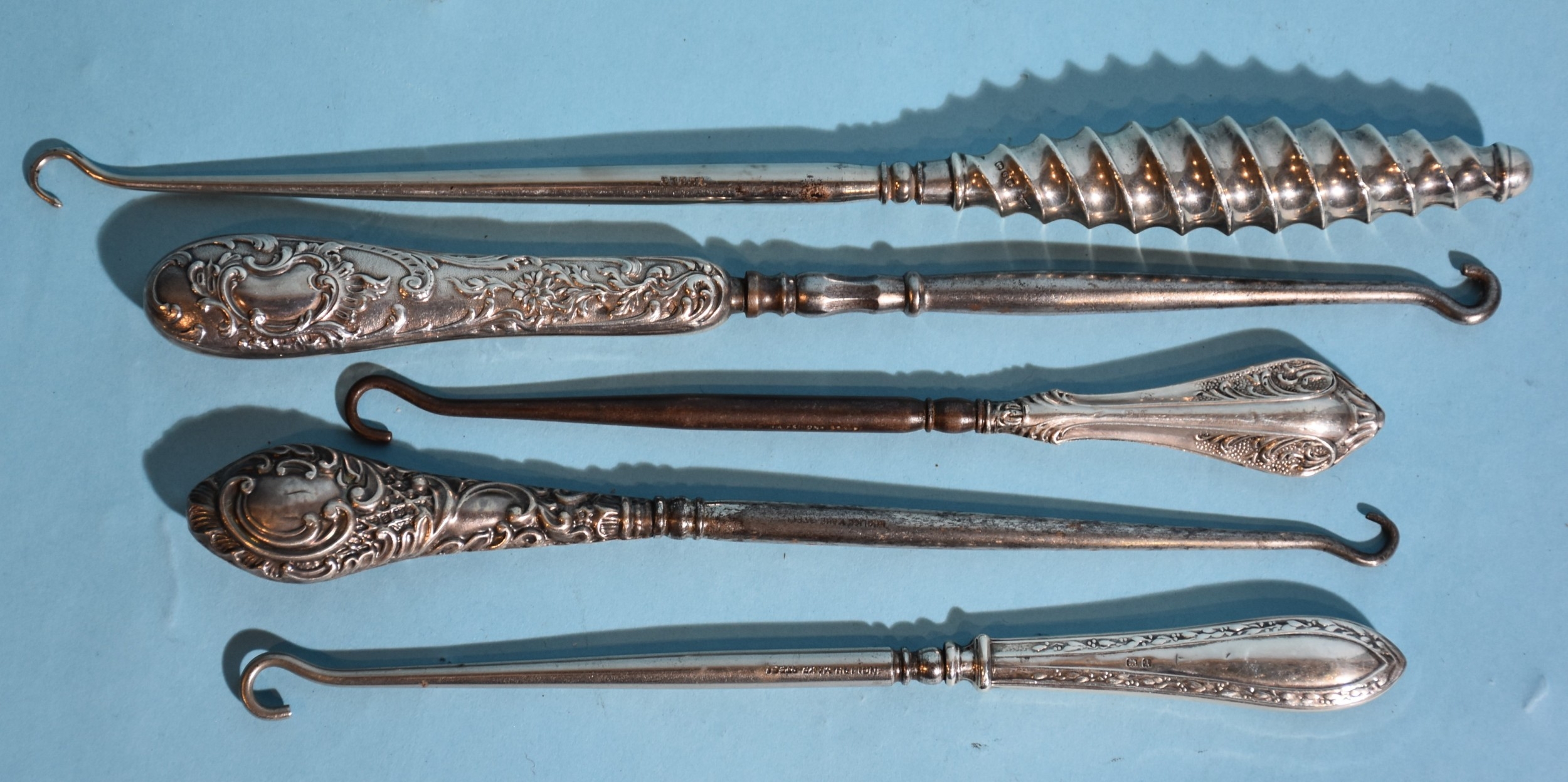 A steel button hook with spiral silver handle, 23cm long, Birmingham 1901, three other silver and one white metal-handled button hooks, (5).