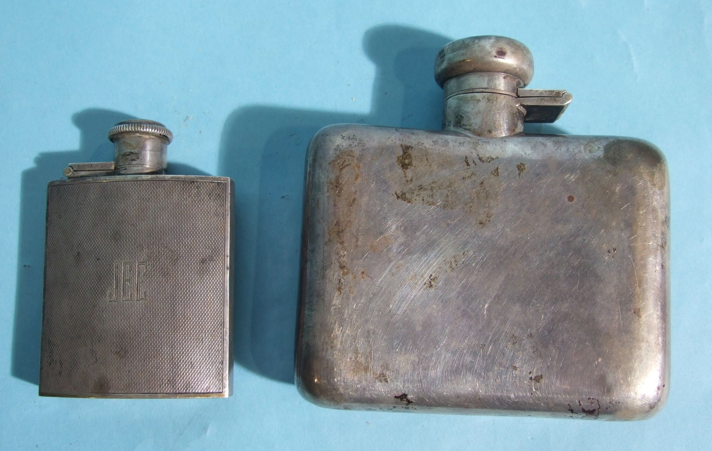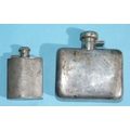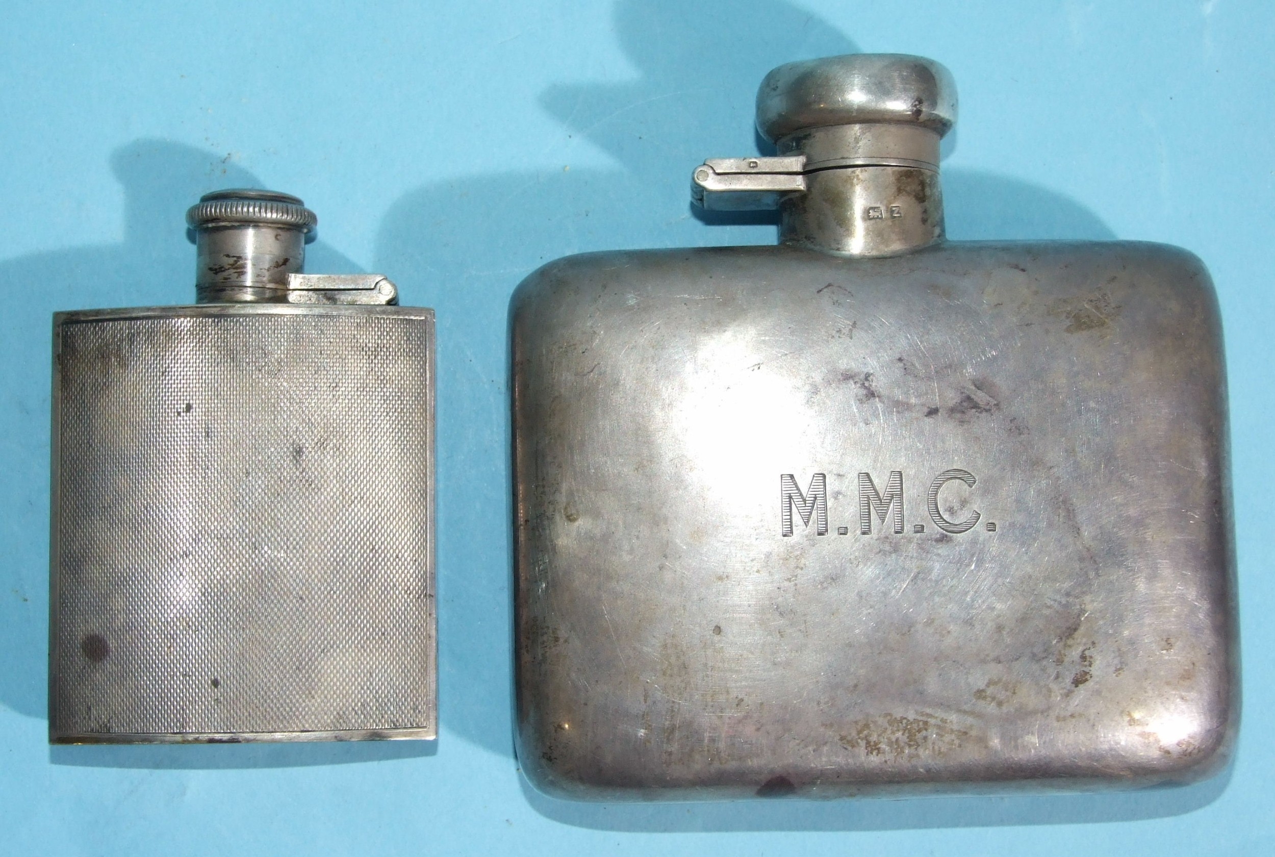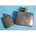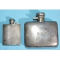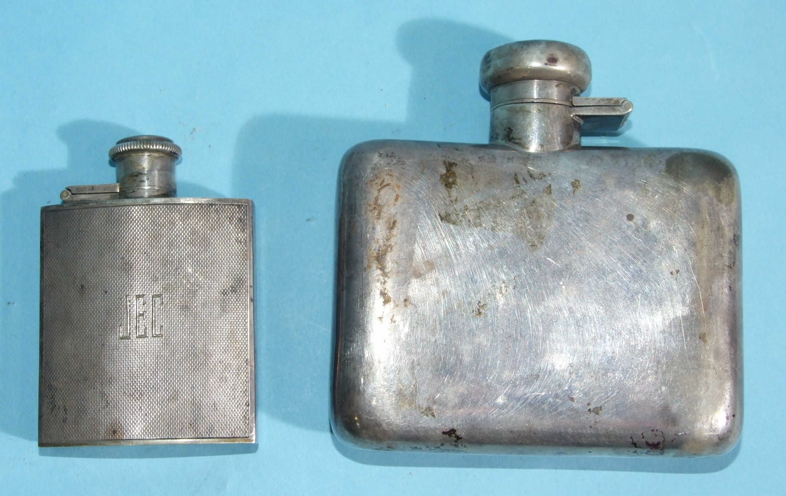 A silver hip flask of plain form, 10.5 x 10.5cm, with engraved initials, Birmingham 1949, 165.5g, ___5.3oz and a smaller engine-turned silver hip flask, 8 x 5.5cm, with engraved initials, Birmingham 1953, 72.6g, ___2.3oz, (2).