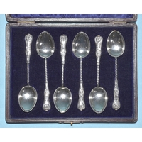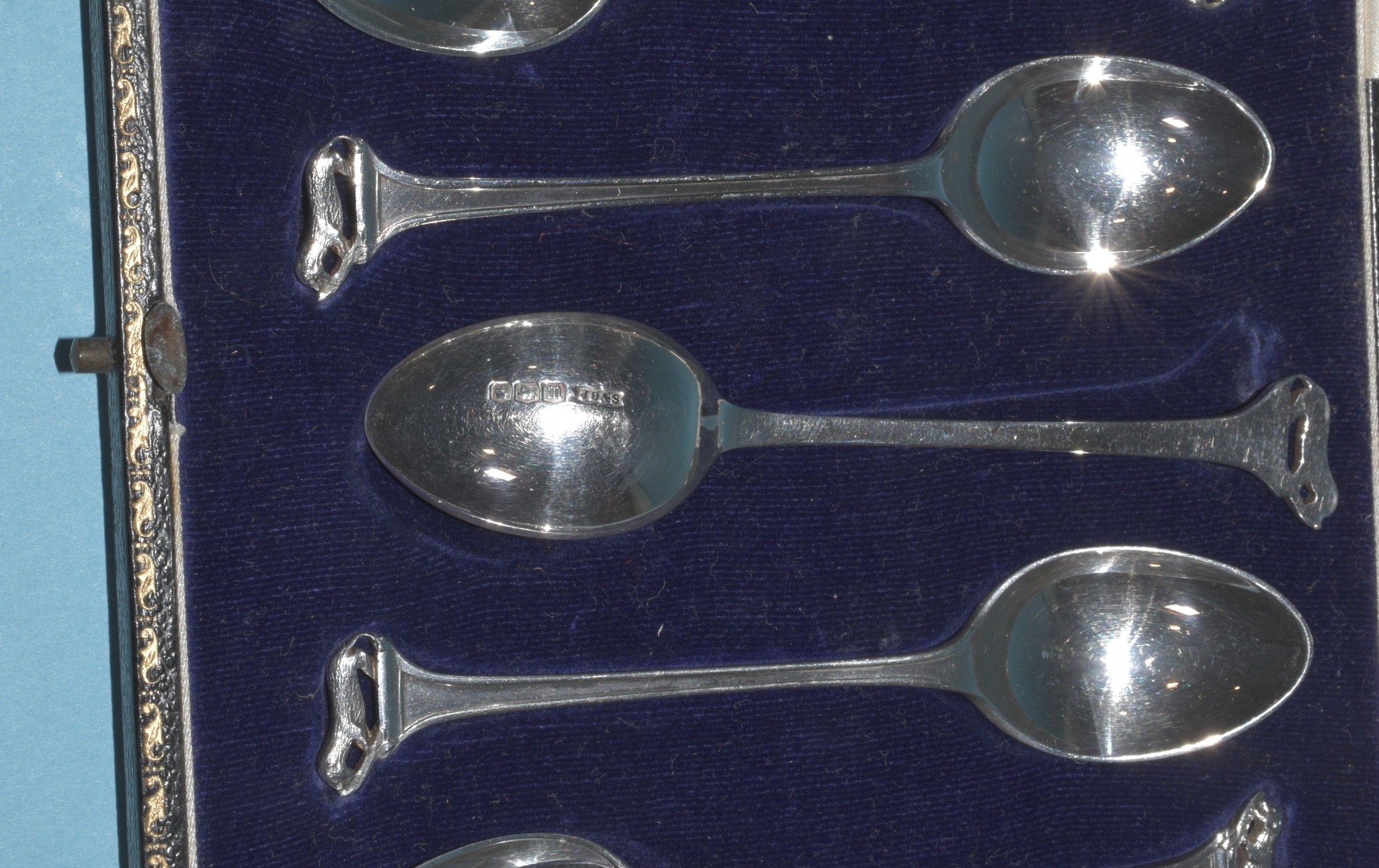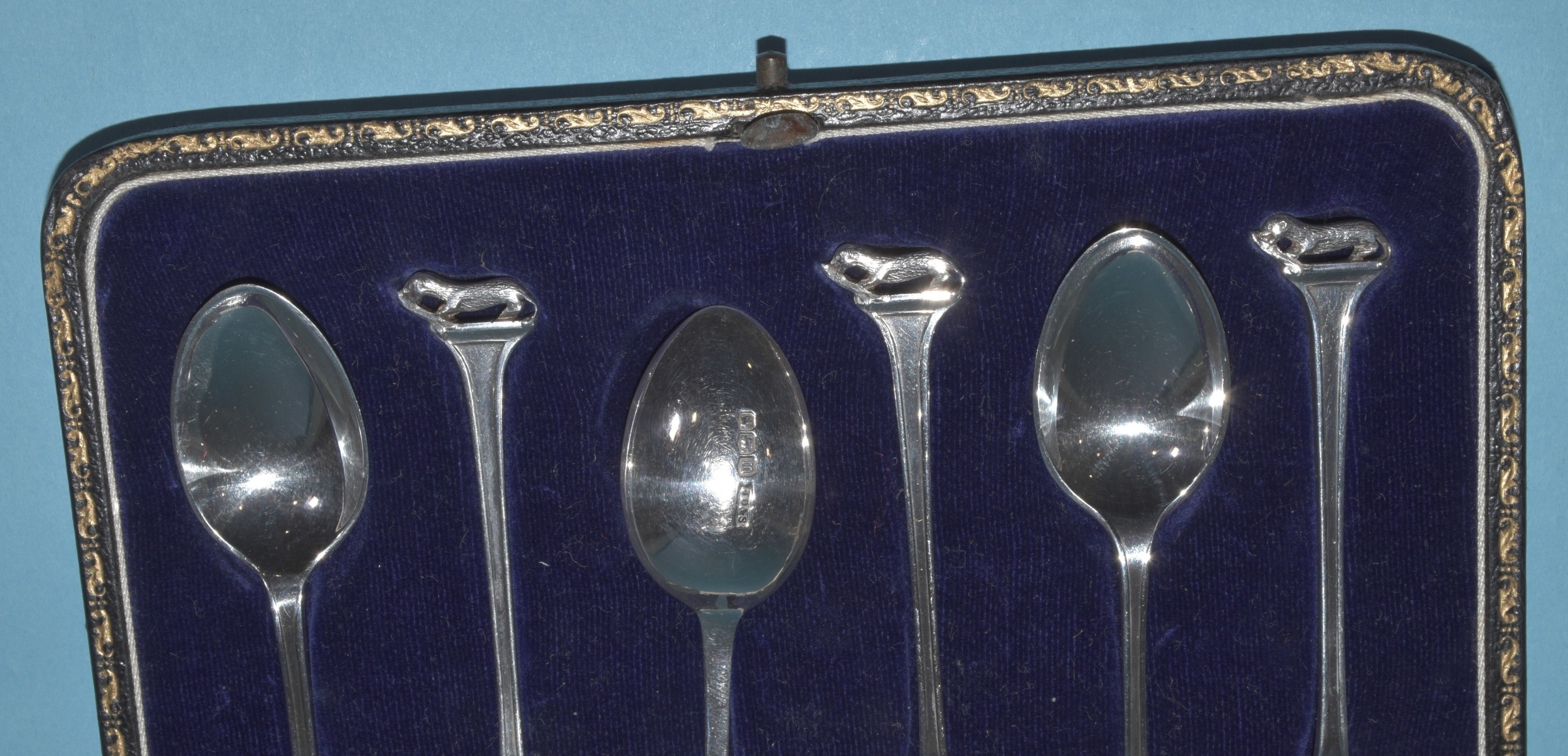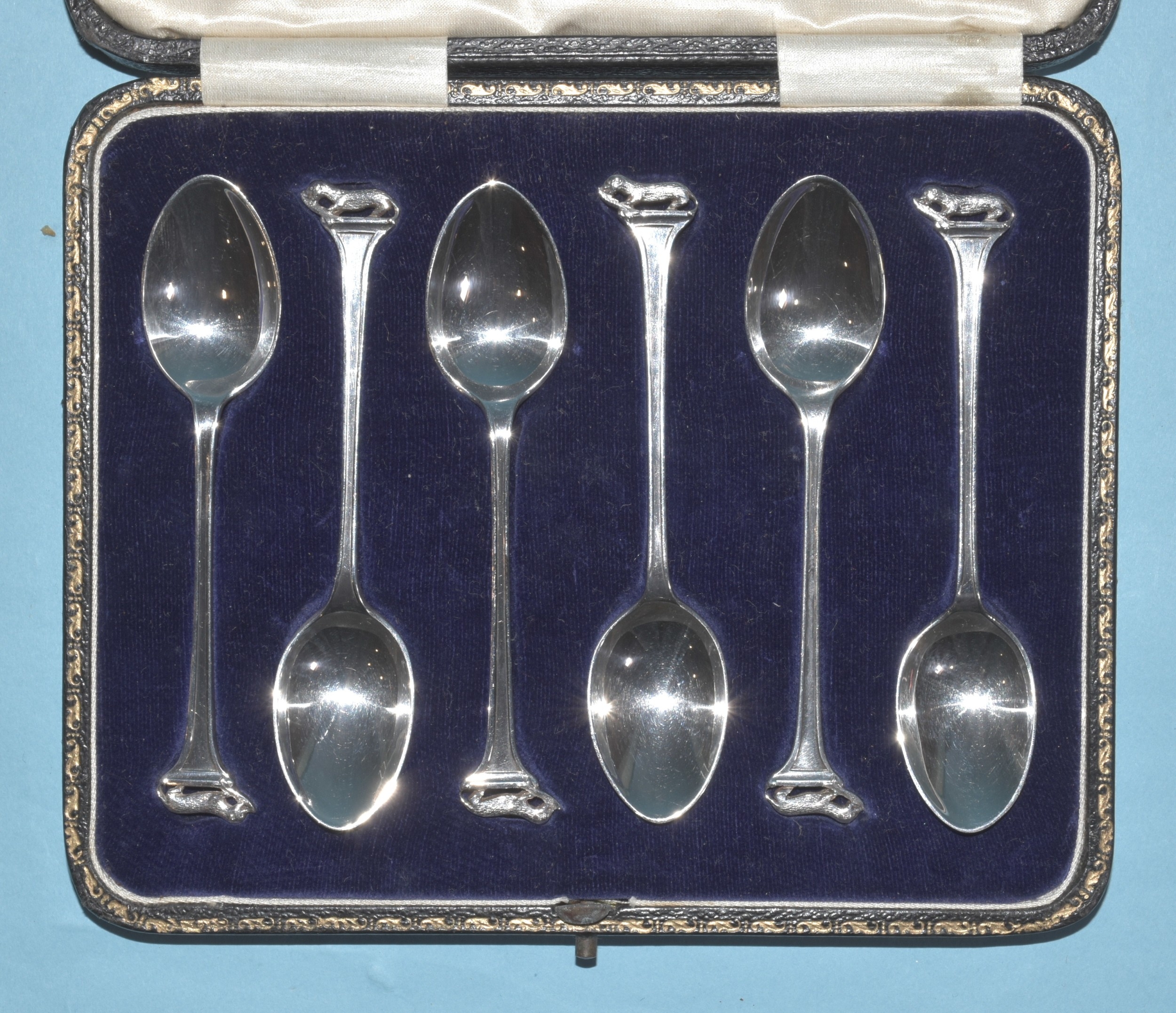 A set of six silver teaspoons with each terminal in the form of an otter and salmon, Sheffield 1929, 80g, ___2.5oz.