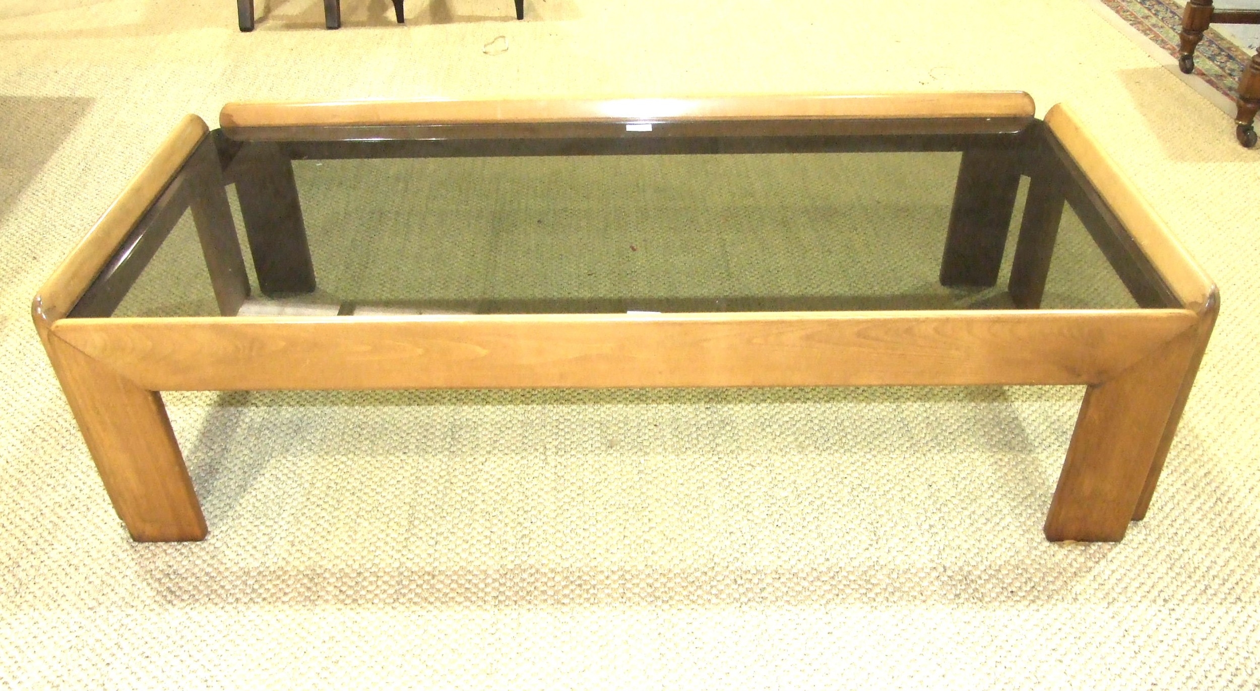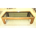 A 1970's bleached wood low coffee table with smoked plate glass top, 135 x 64cm, standing 35cm high.