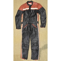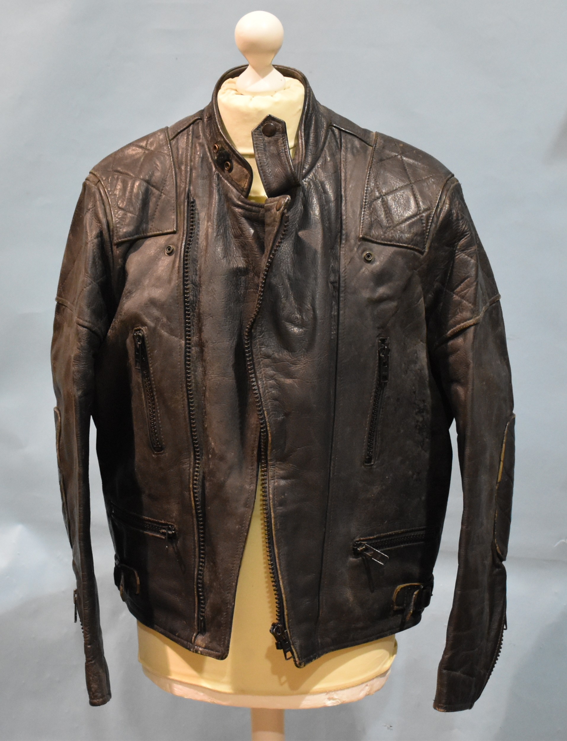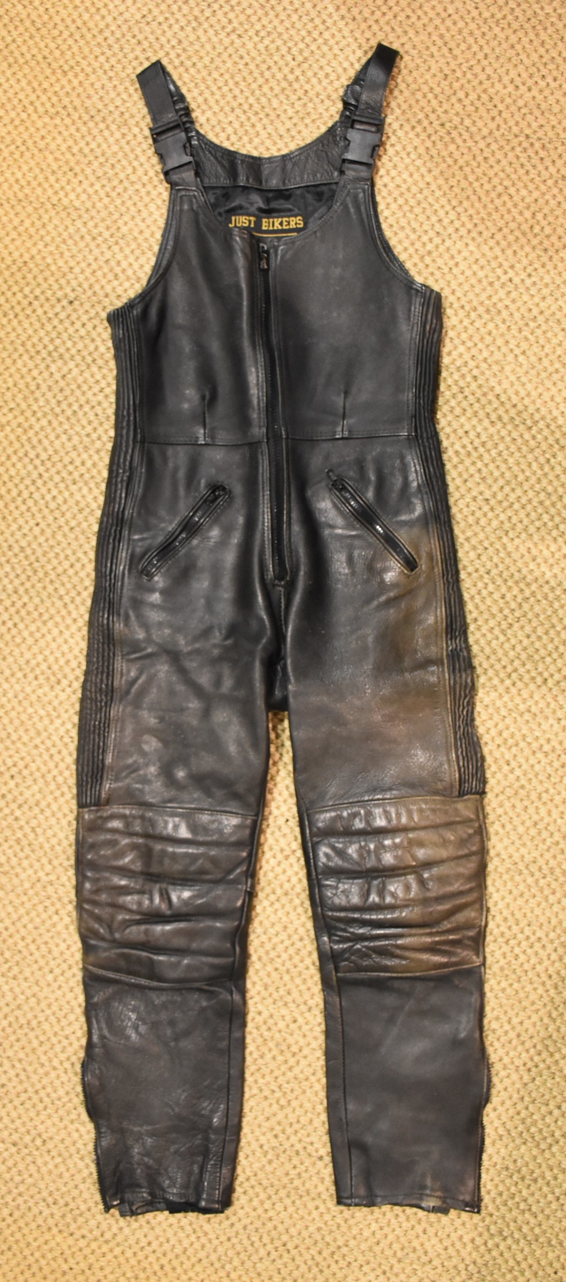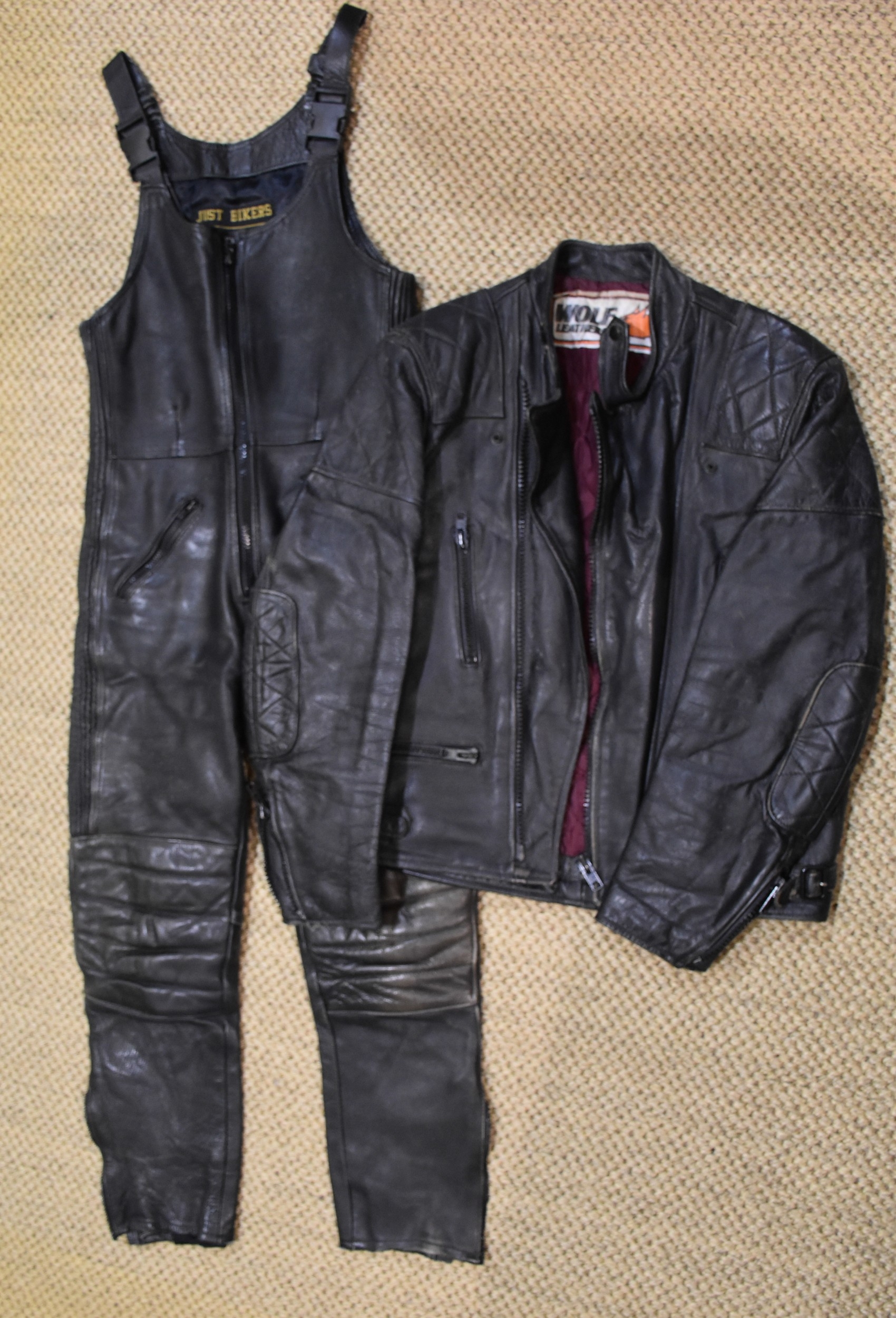 A pair of black leather "Just Bikers" labelled motorcycle bib and brace trousers, 34" and a "Wolf Leathers" black leather jacket, 44", (2).