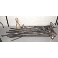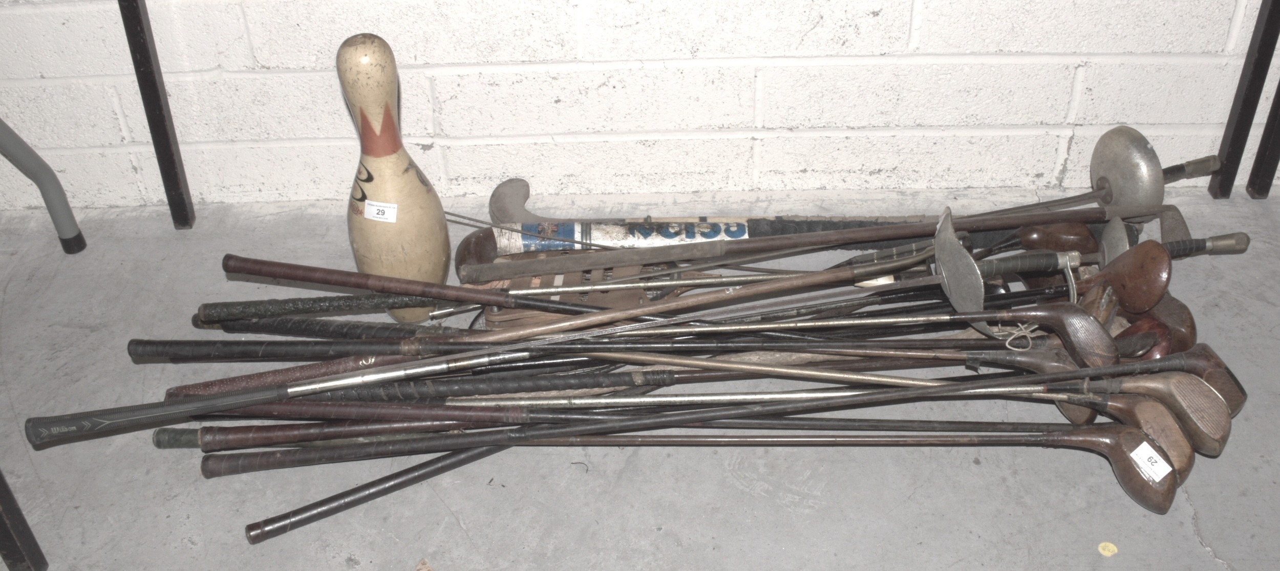 A collection of metal-shafted golf clubs, mainly woods, two hockey sticks and miscellaneous items.