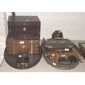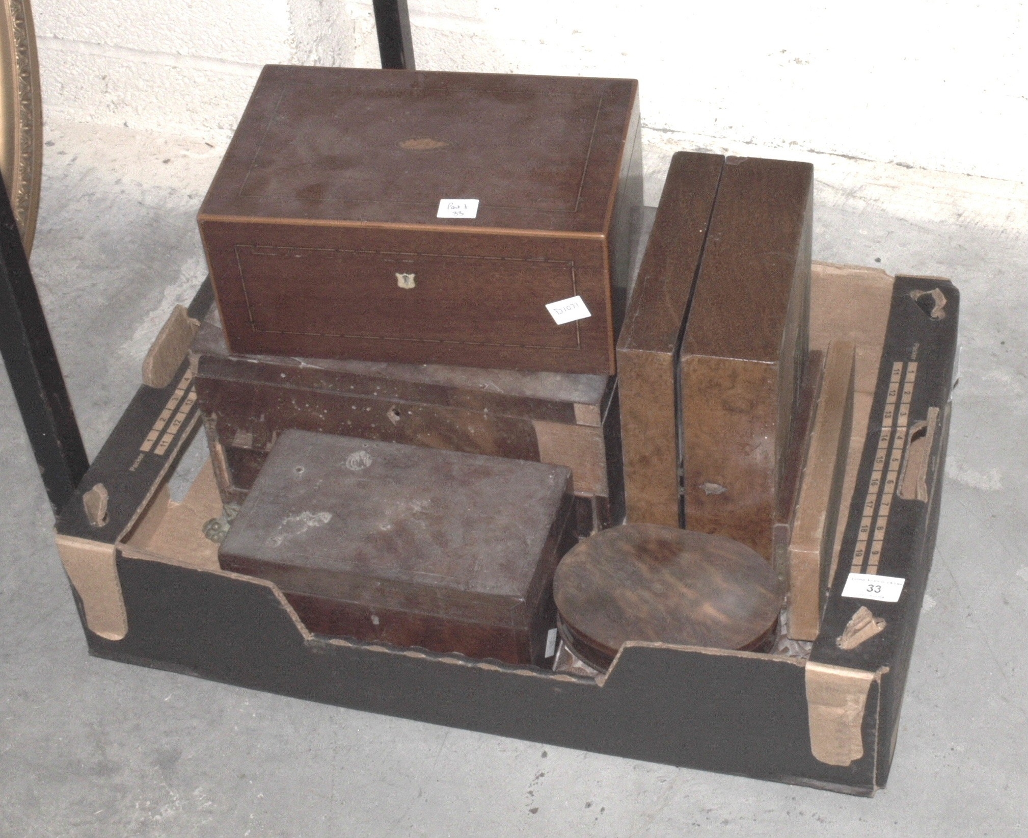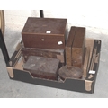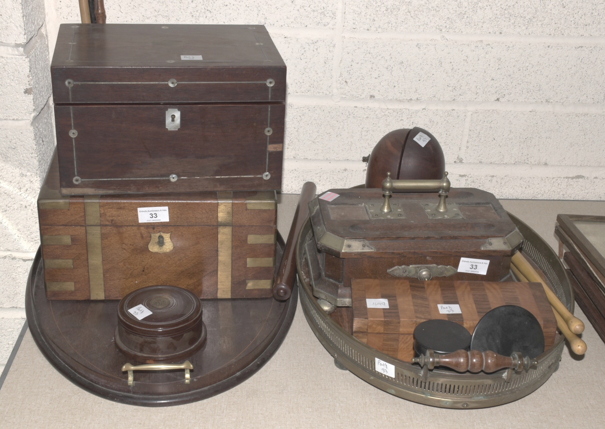 A brass-mounted writing box, (interior tray lacking), various other wooden boxes, an oval two-handled wooden-base tray with pierced metal gallery, 58 x 37cm, a plated-mount oak pen and ink stand, (ink bottles lacking), an oval-framed mirror and other wooden pieces.