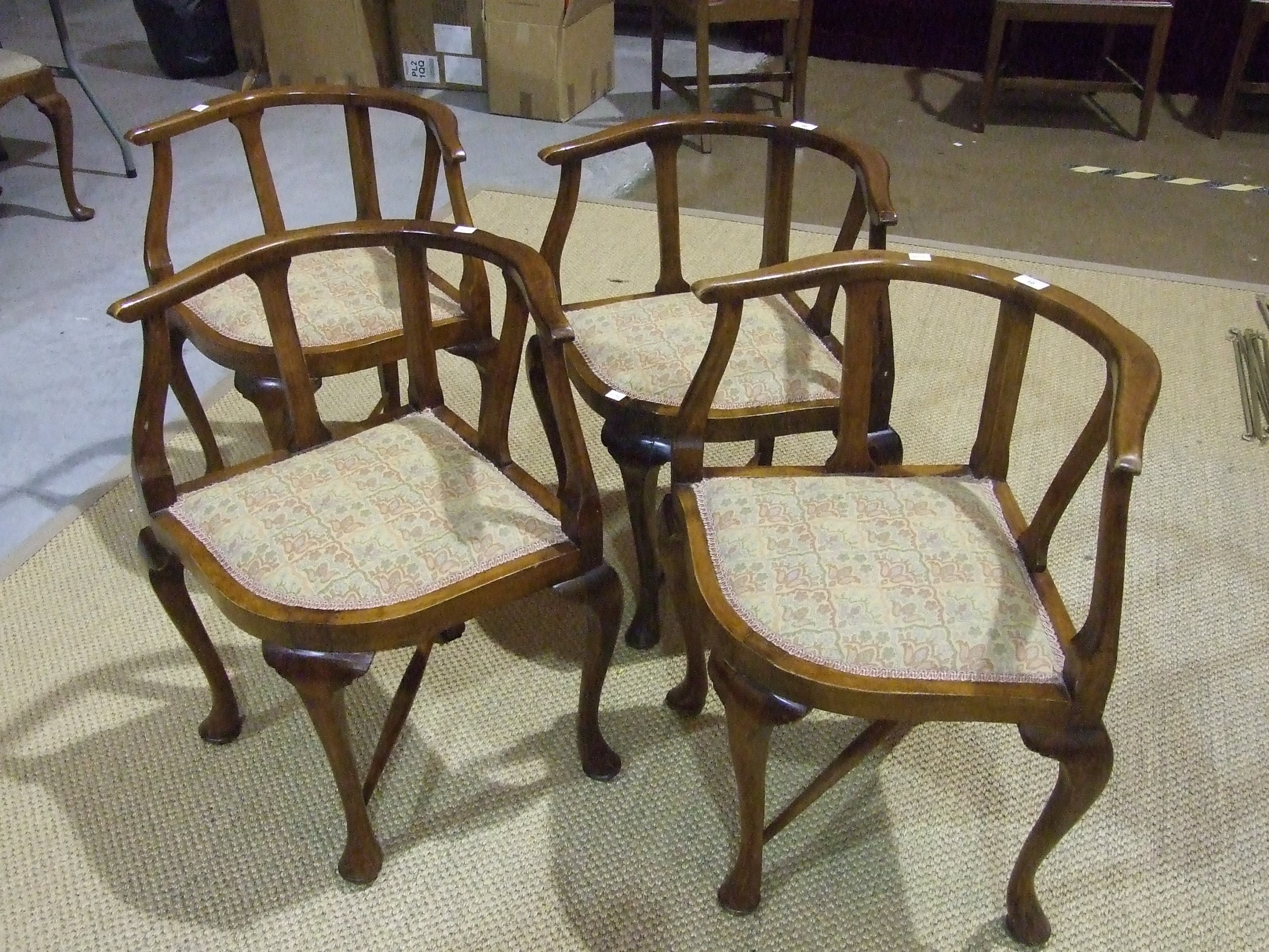 A set of four mahogany corner chairs with upholstered seats, on cabriole legs, (4).