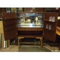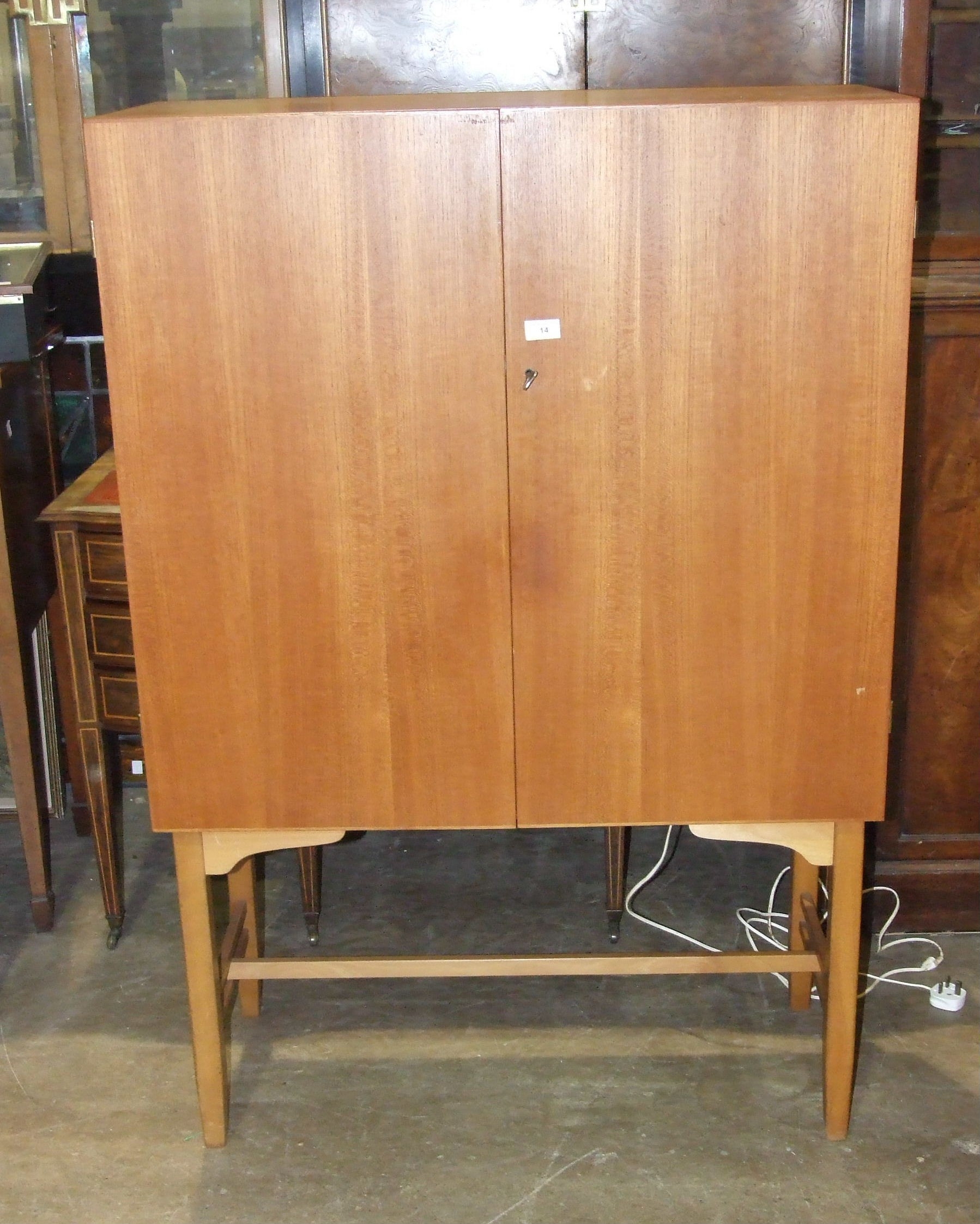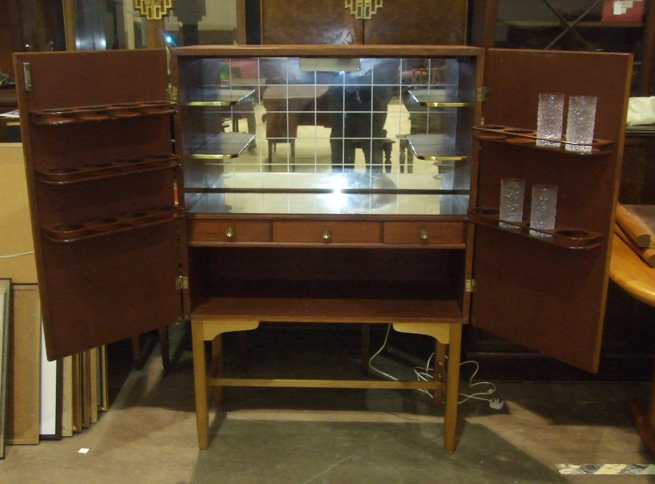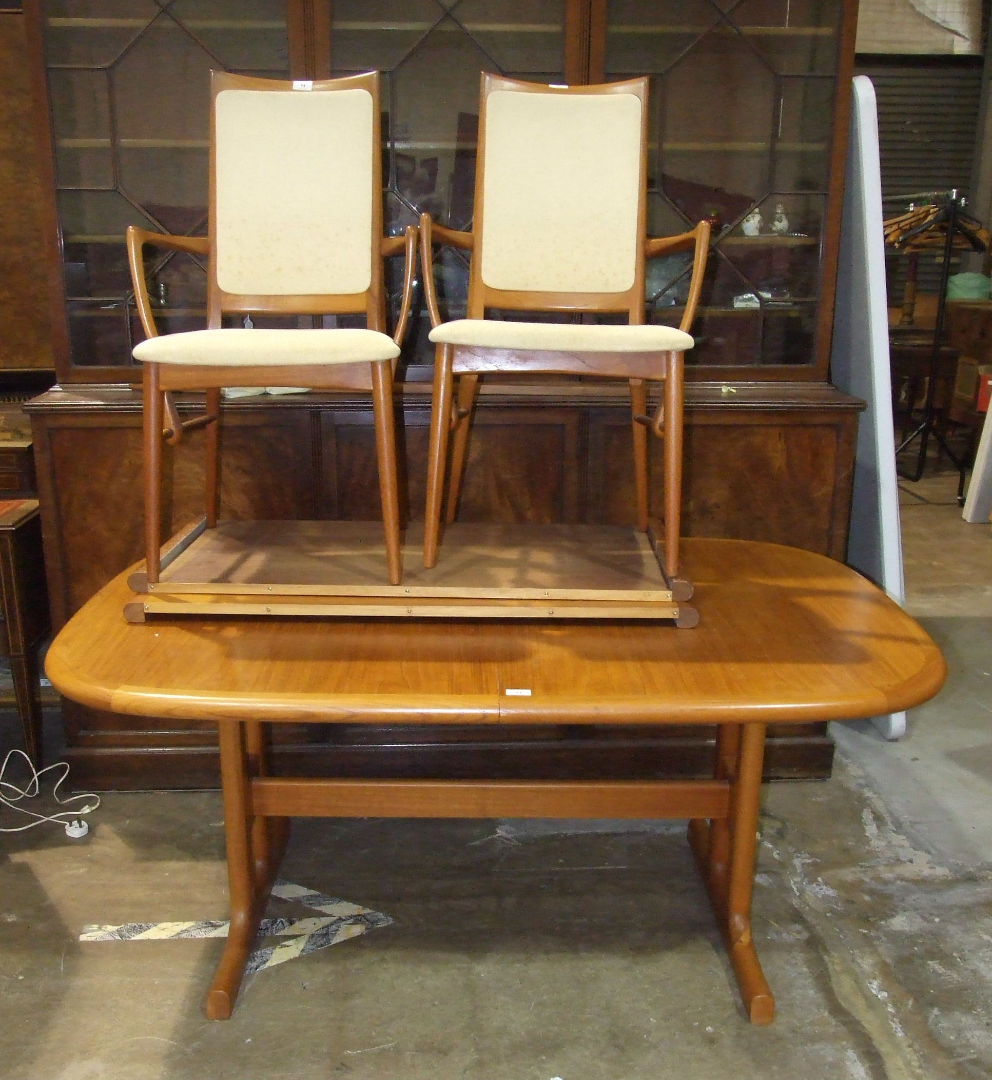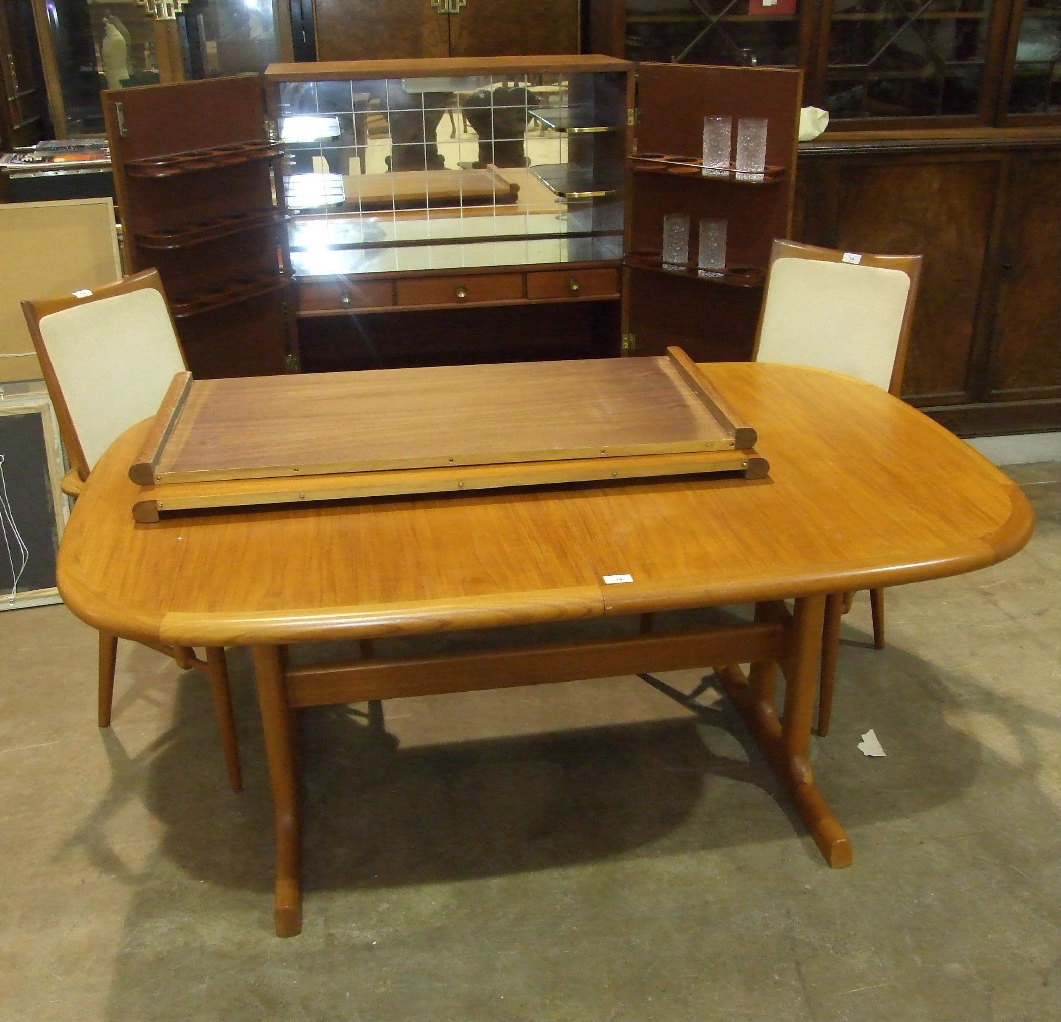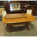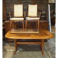 A modern hardwood extending dining table, 260 x 102cm extended, and two dining chairs with arms, together with a 1970's cocktail cabinet, 91cm wide, 134cm high, (4).