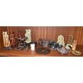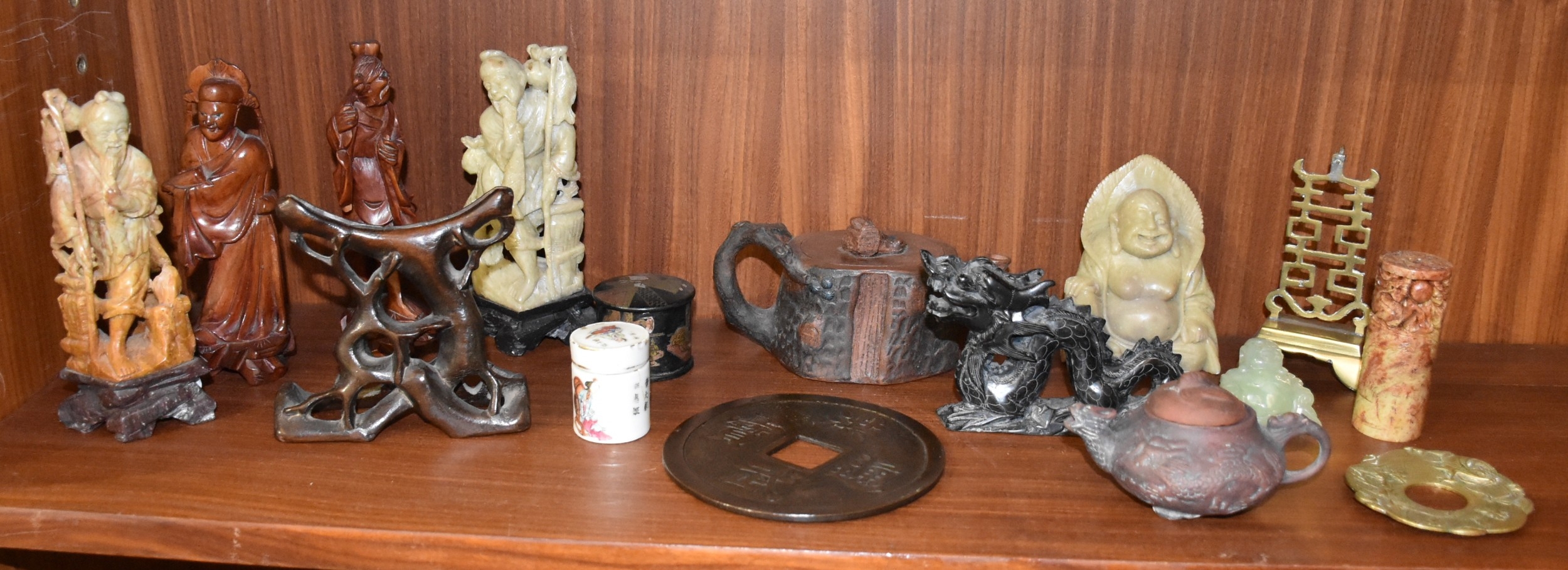A collection of Oriental soapstone, wood and other carved figures, two small ceramic teapots and other items.
