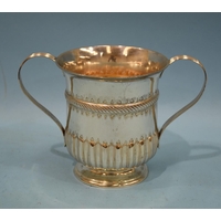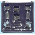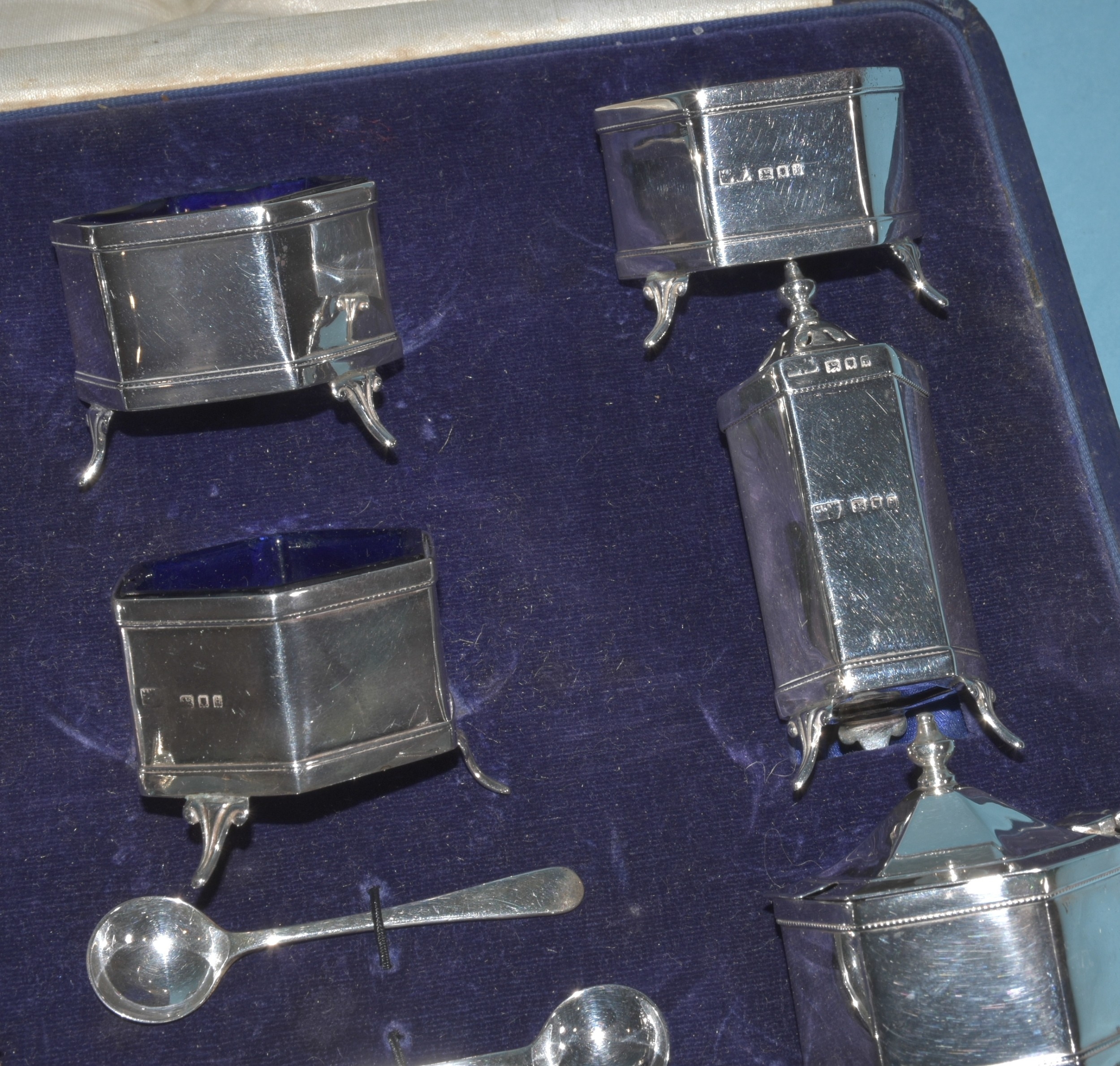 A cased silver double cruet set of plain hexagonal form, London 1924, with blue glass liners, 253g, ___8.1oz.