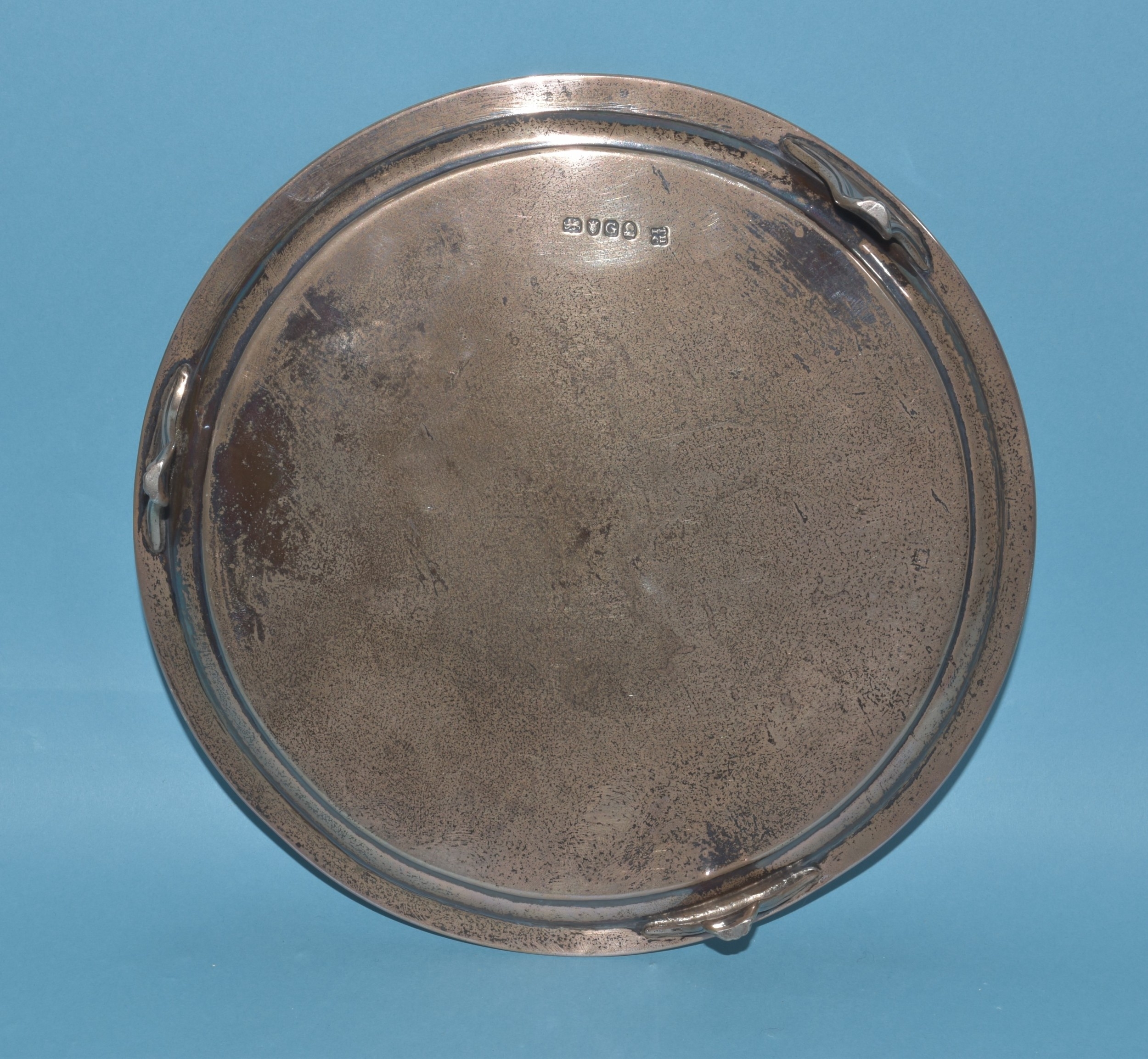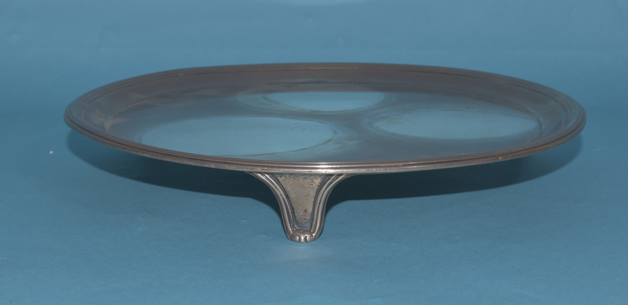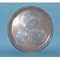 A George III circular silver card tray raised on three feet, engraved with central crest (faded), London 1802, maker Thomas Hannam & John Crouch II, 20cm diameter, 396g, ___12.7oz.