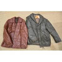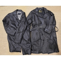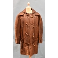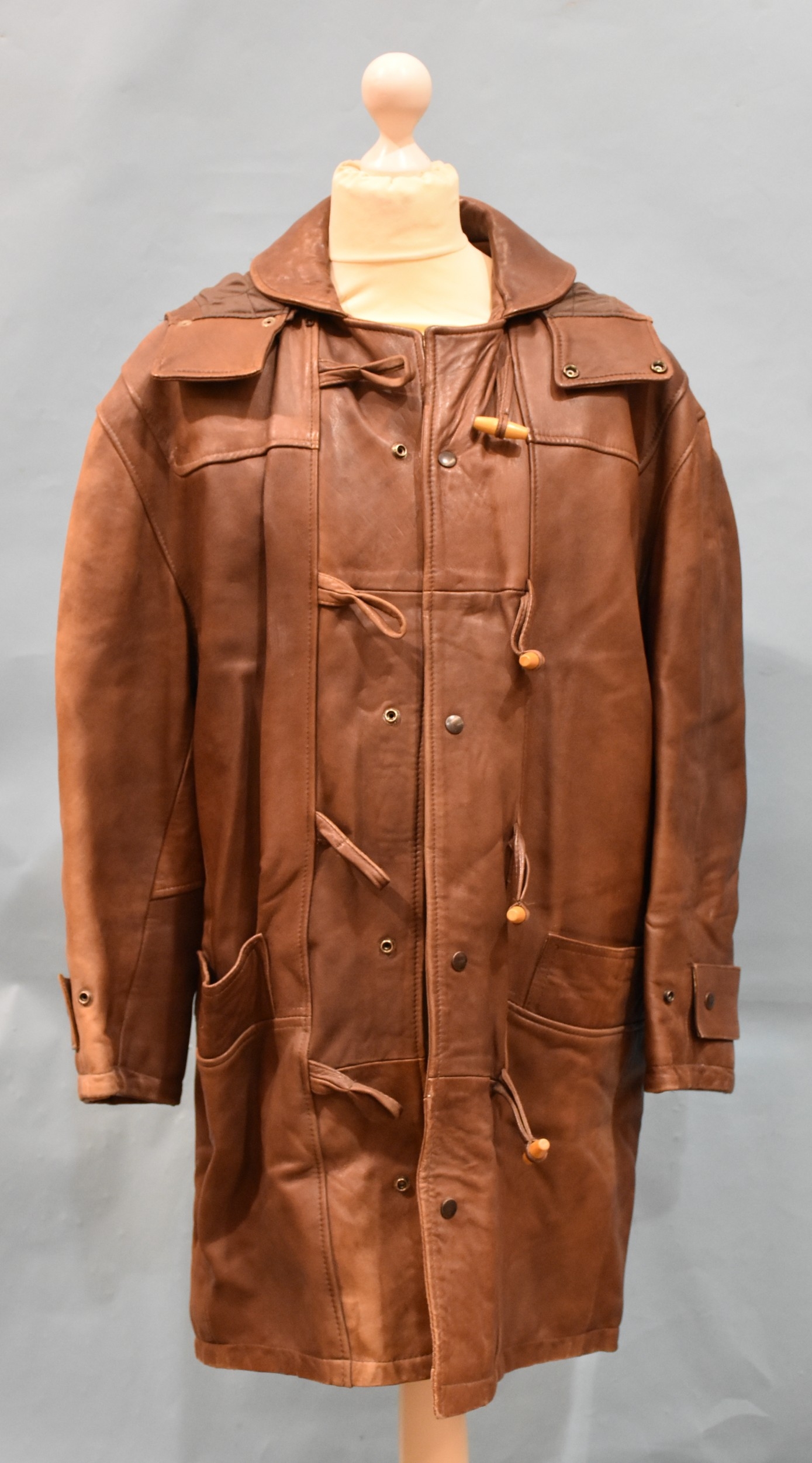 A leather duffle coat with detachable hood, no manufacturer's or size label.