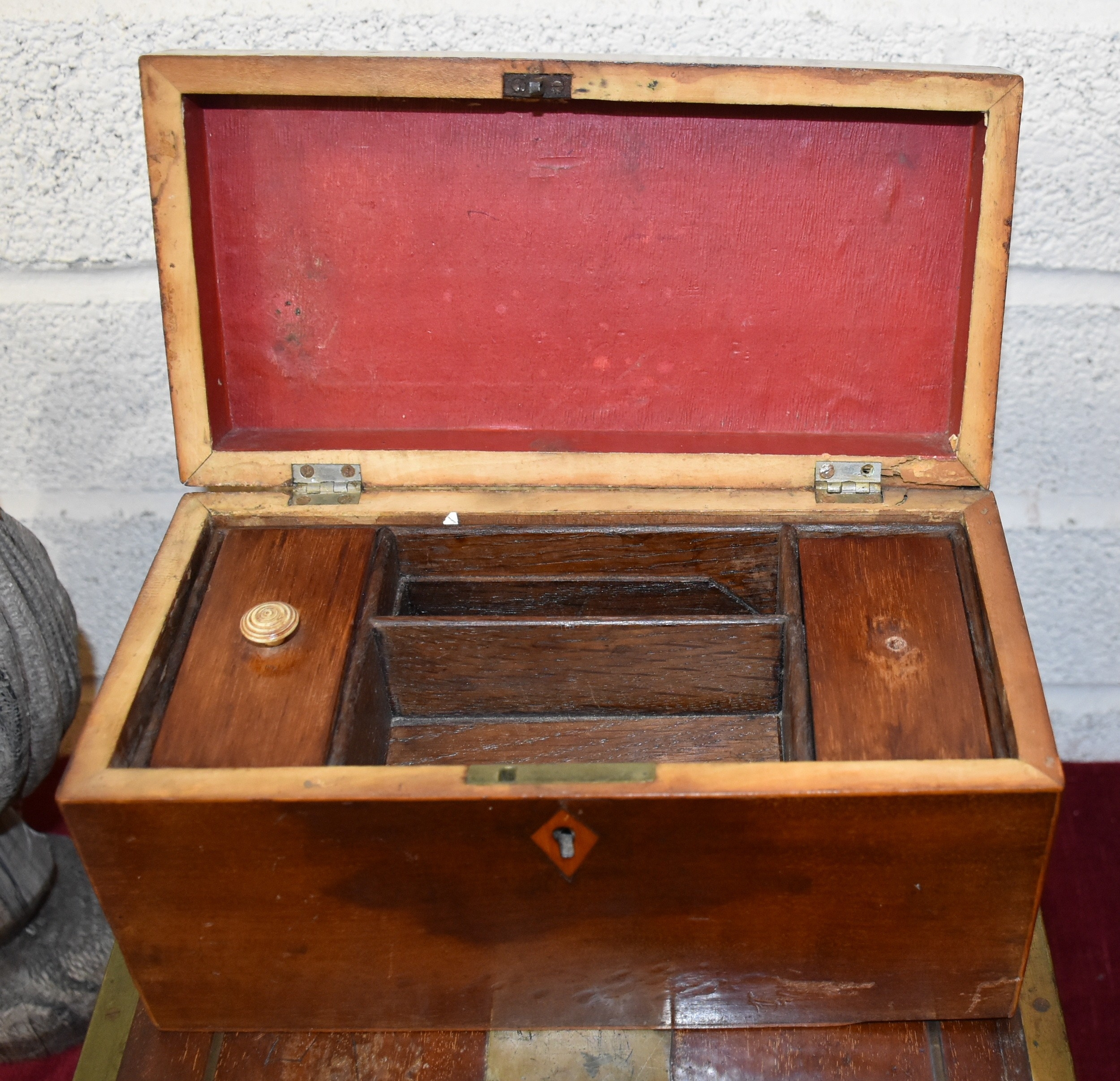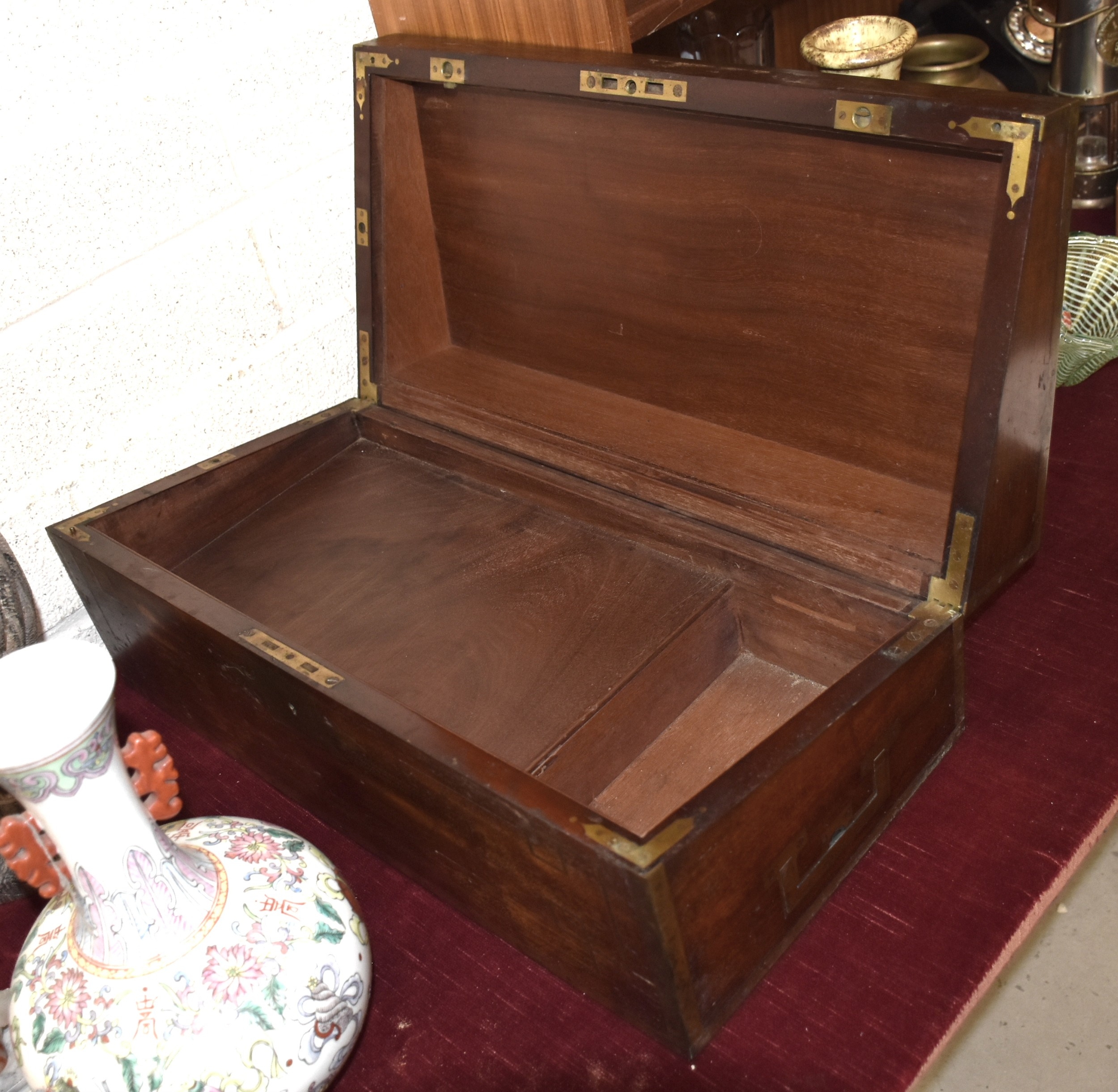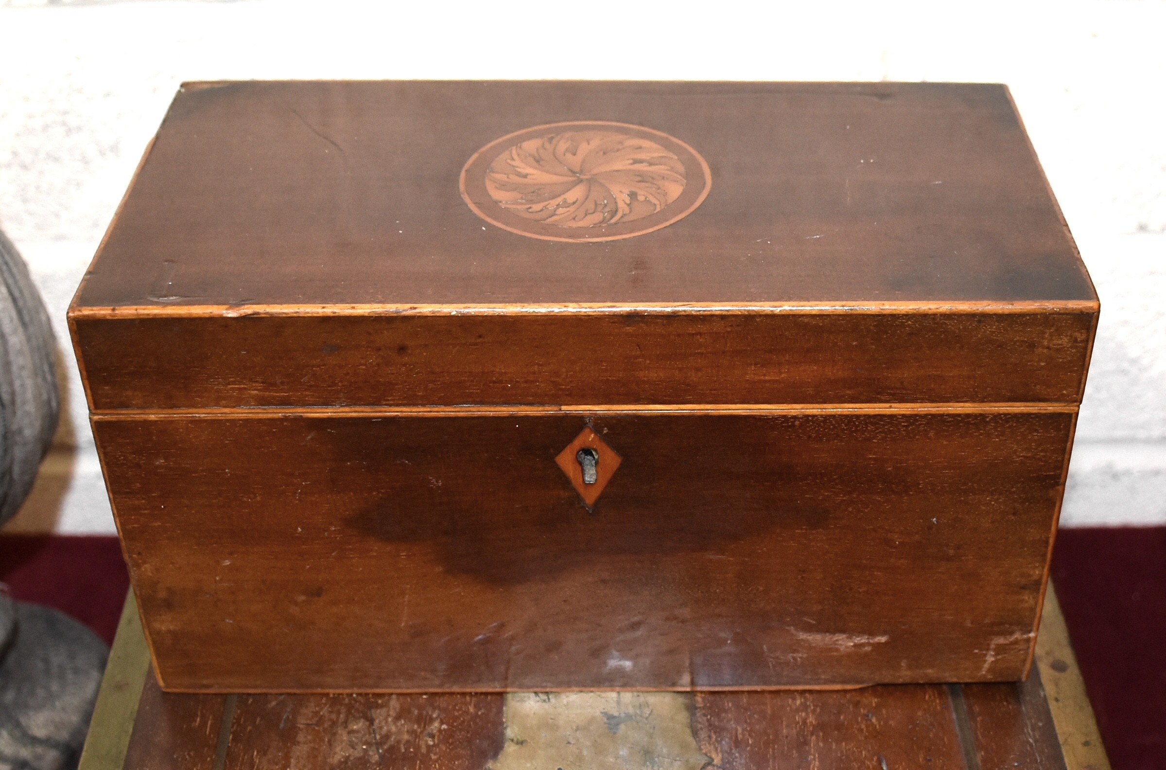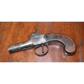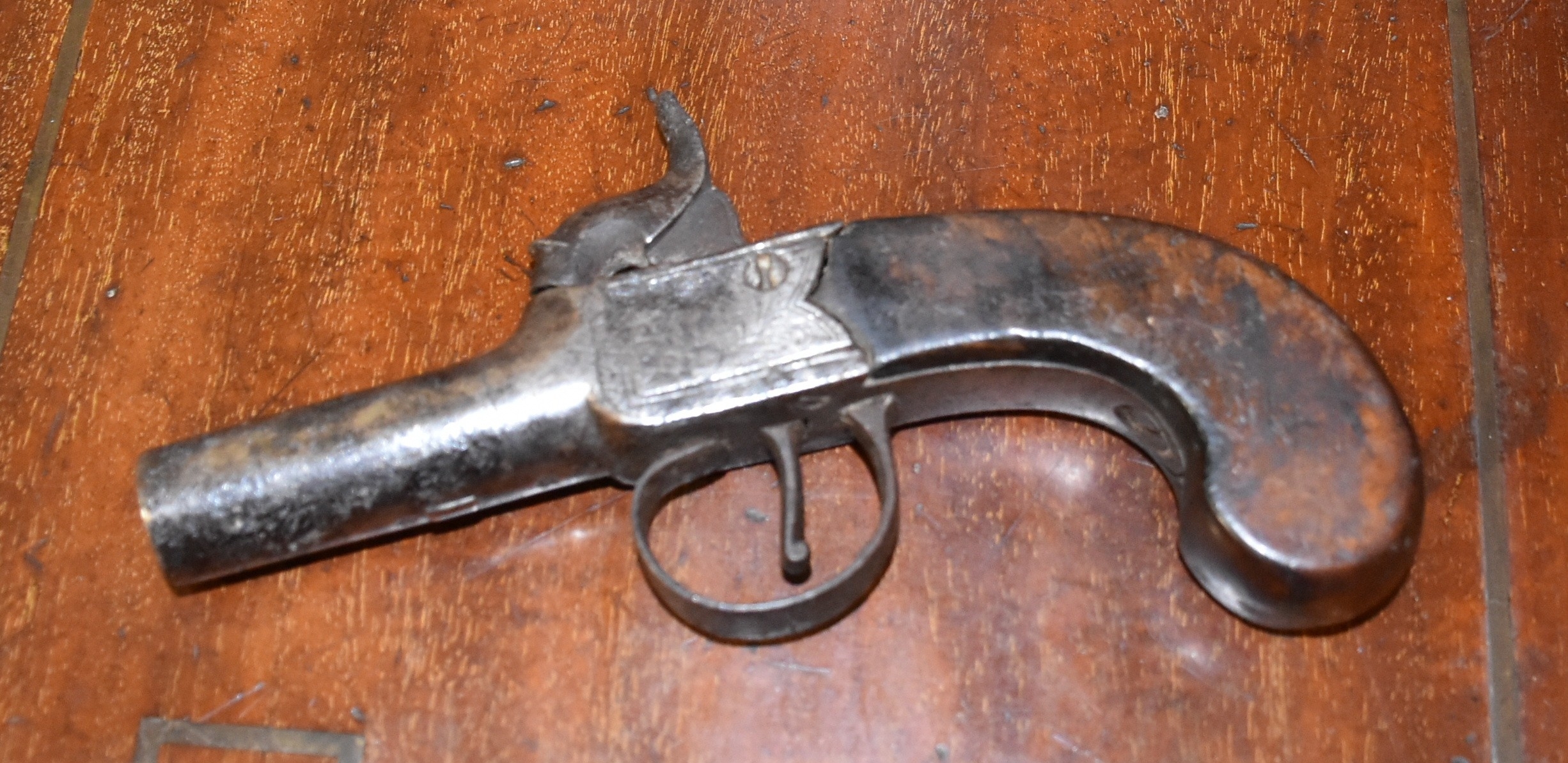 A brass-bound mahogany lap desk with side drawer, (fitting incomplete), an inlaid mahogany box and a percussion pocket pistol (a/f), (3).