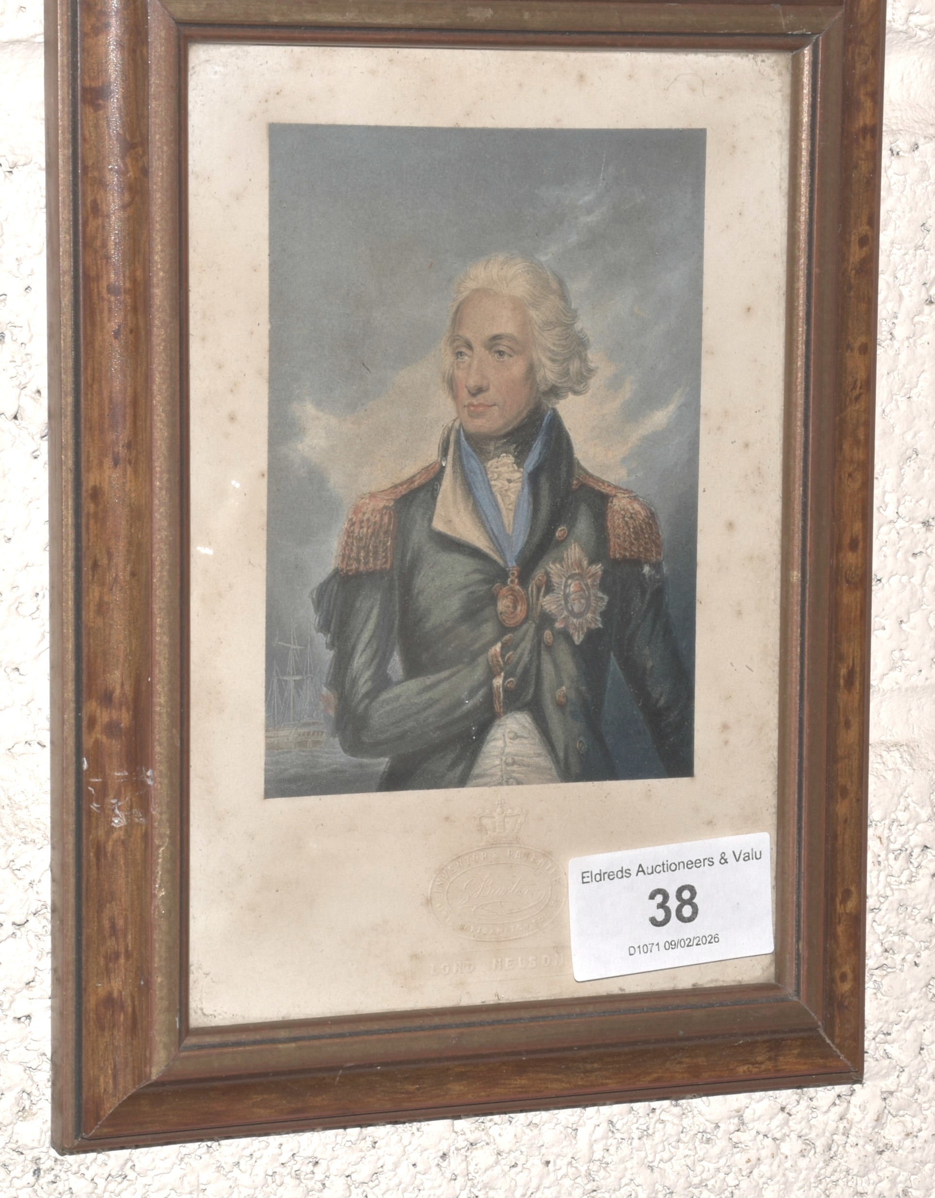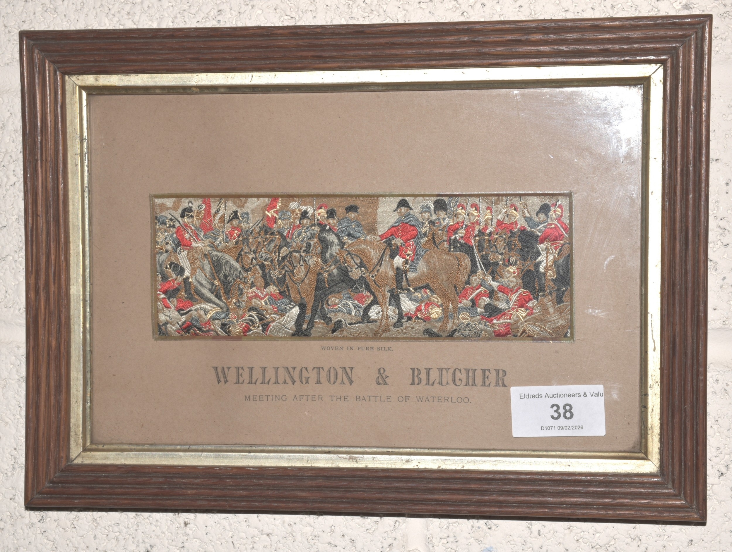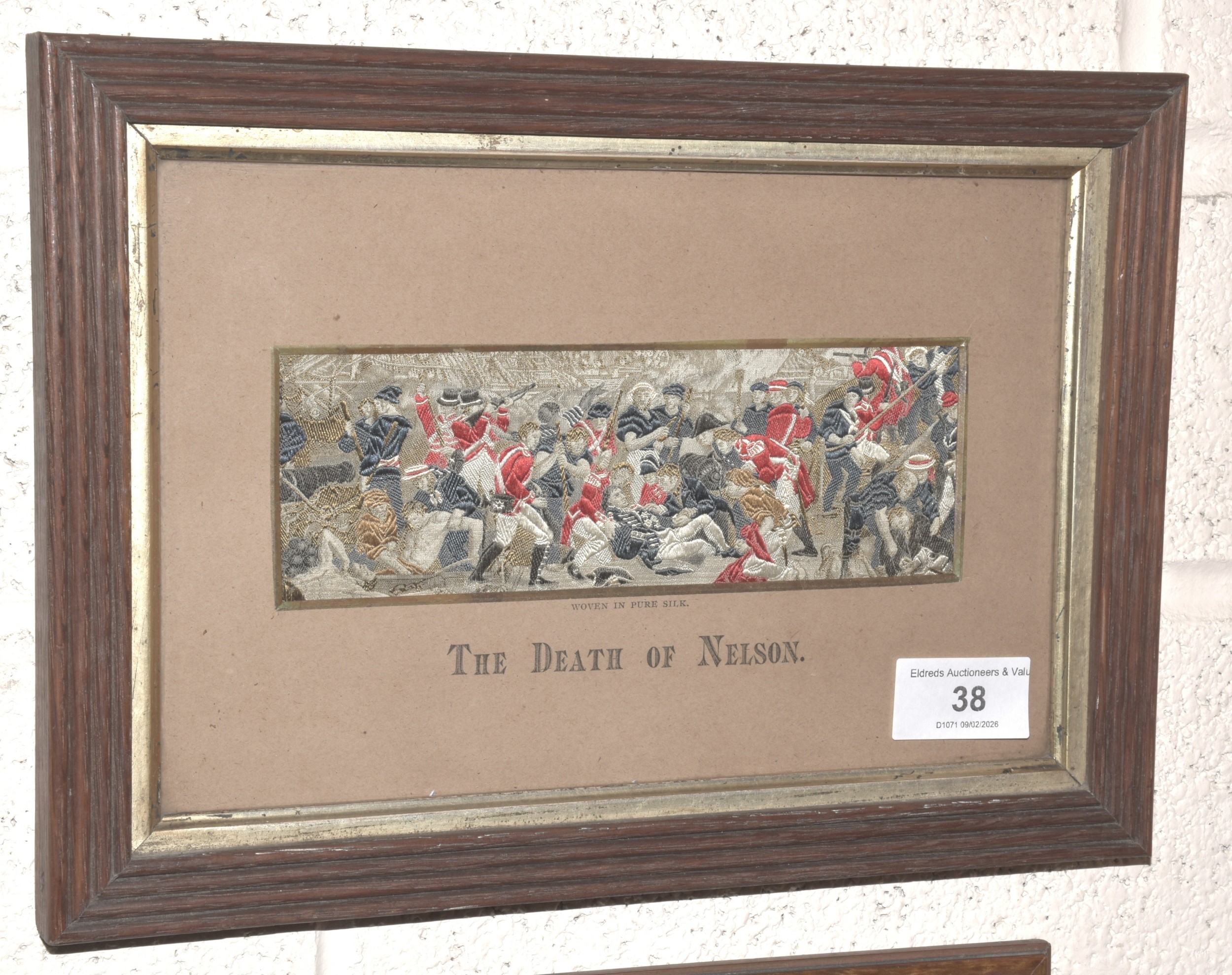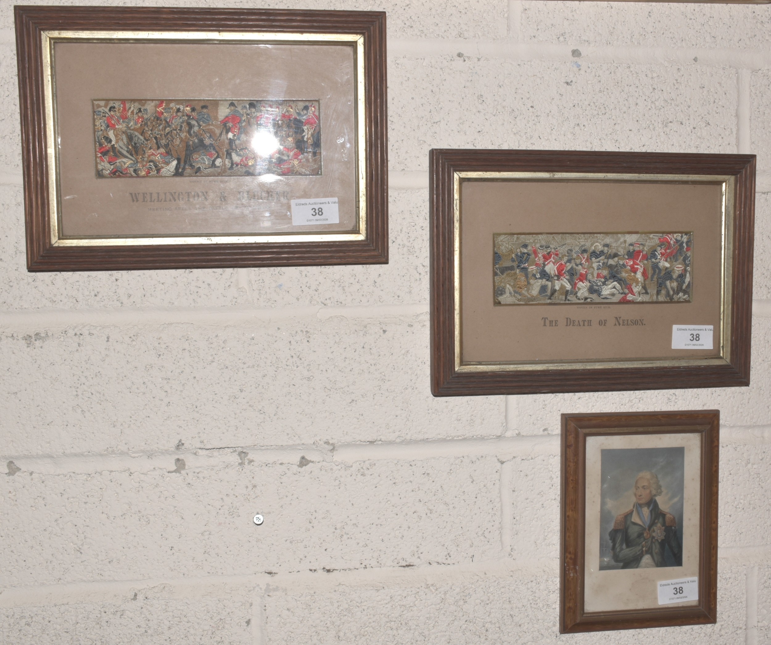 A pair of framed Stevengraphs: Wellington & Blucher and The Death of Nelson, 6 x 17.5cm and a framed Baxter print of Lord Nelson, 15.5 x 11cm, (3).