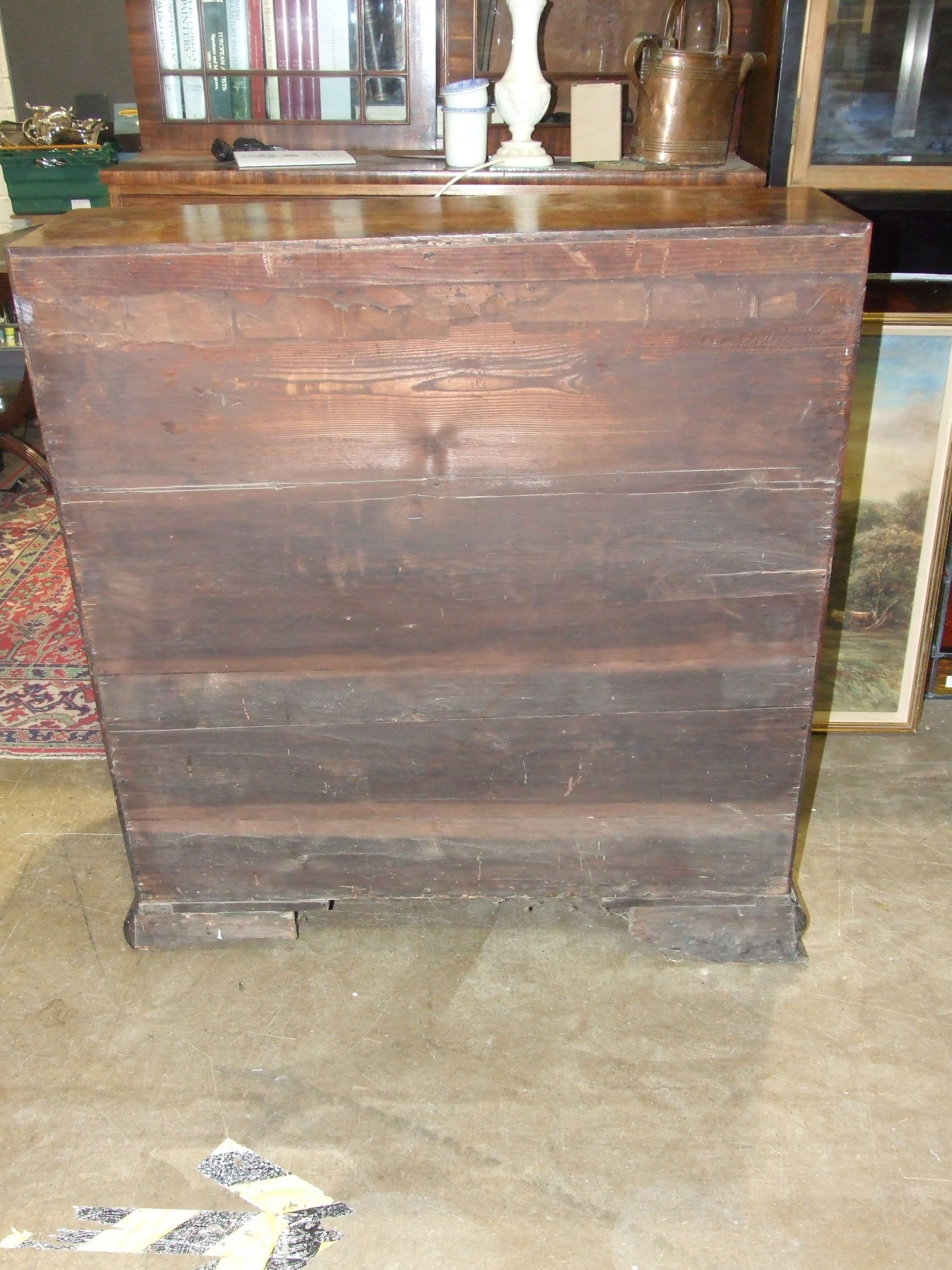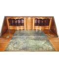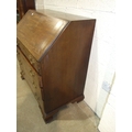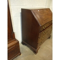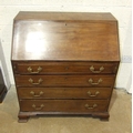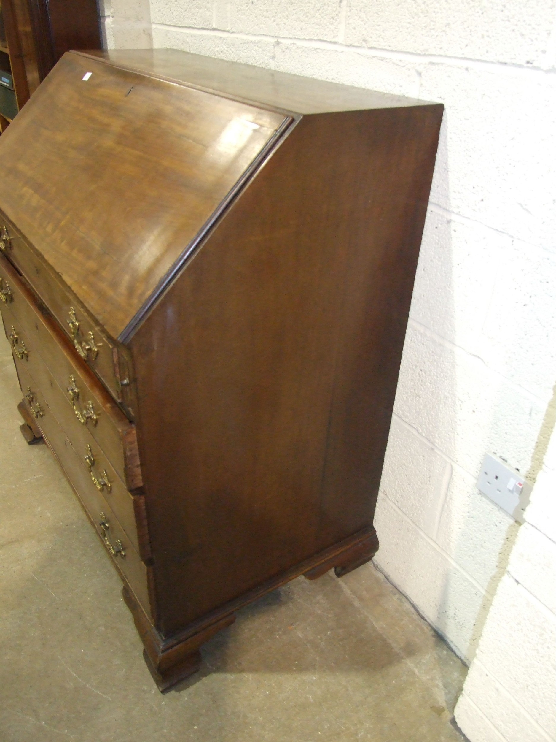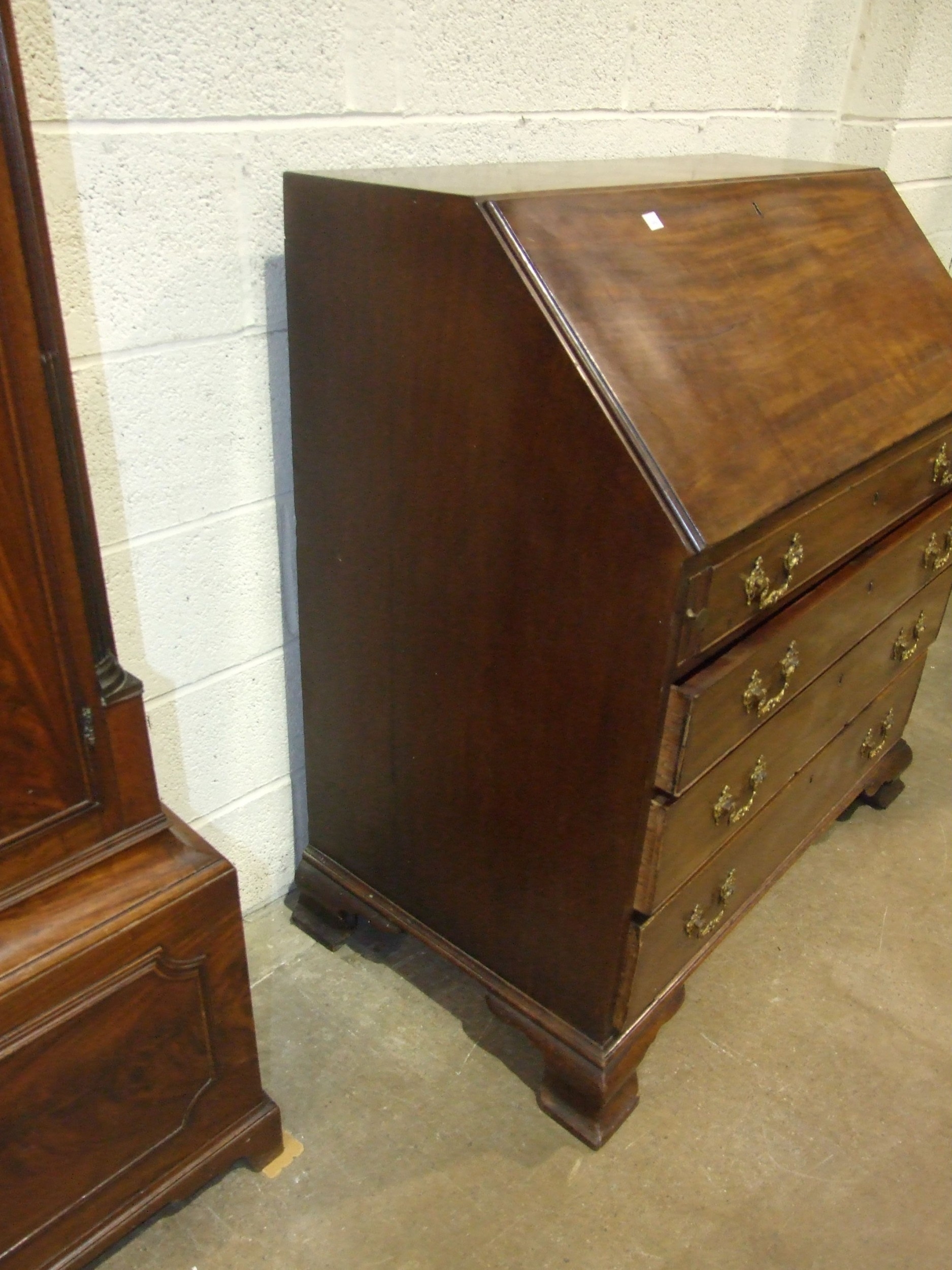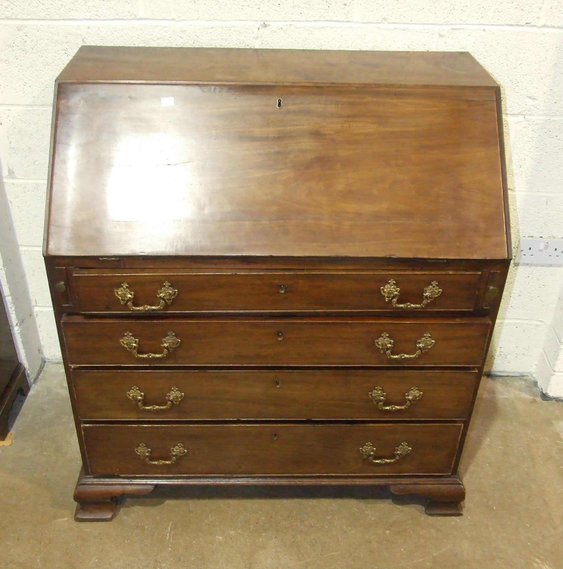 A George III mahogany bureau, the fall front enclosing the serpentine-shaped inlaid satinwood fitment, above four cock-beaded long drawers, on shaped bracket feet, label to drawer Edwin Nichols House Furniture Furnisher, New Street, Worcester, est. 1800, 97cm x 110cm, 55cm deep.