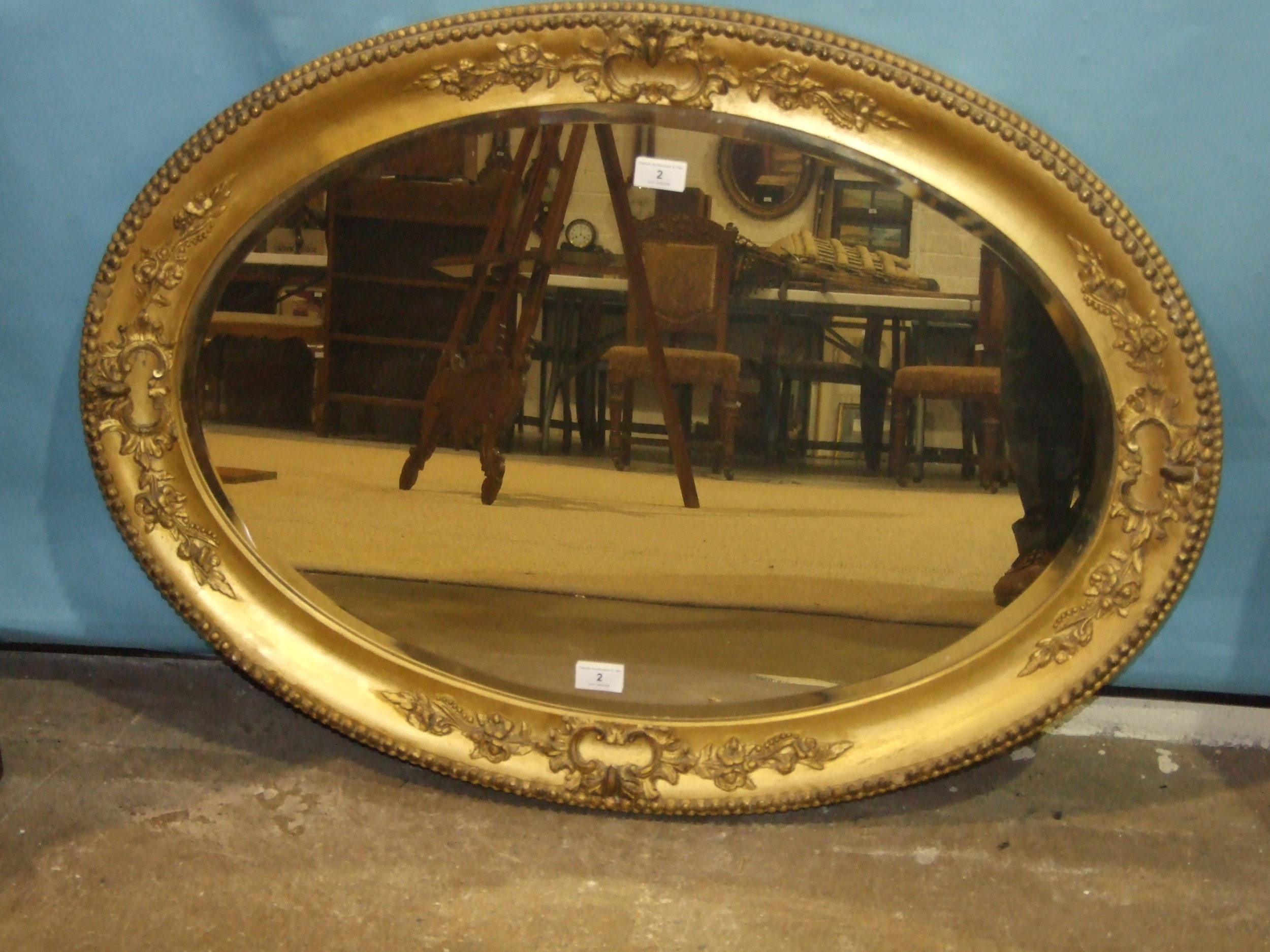 A gilt gesso oval-framed wall mirror with bevelled plate, 90 x 66cm.
