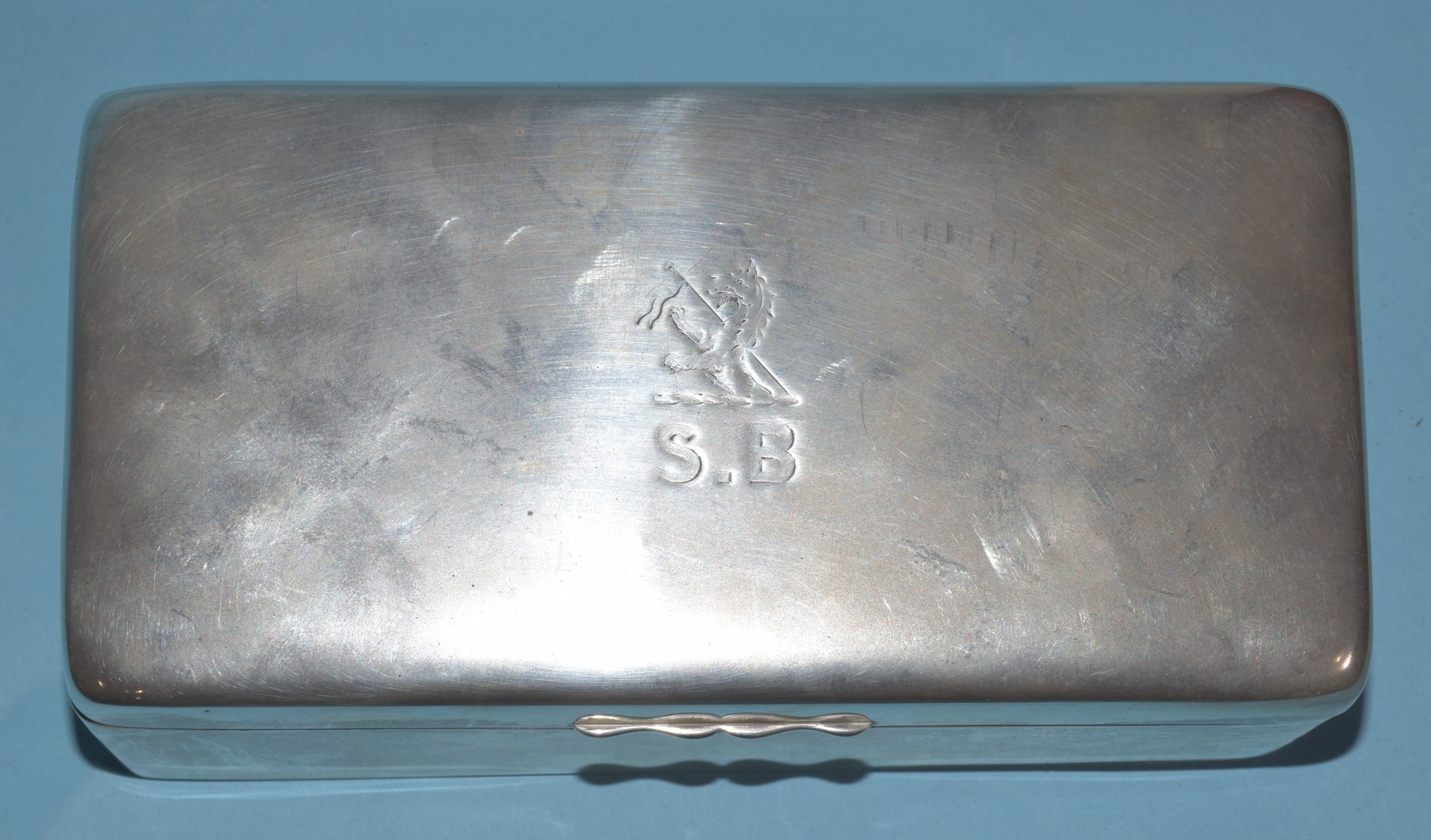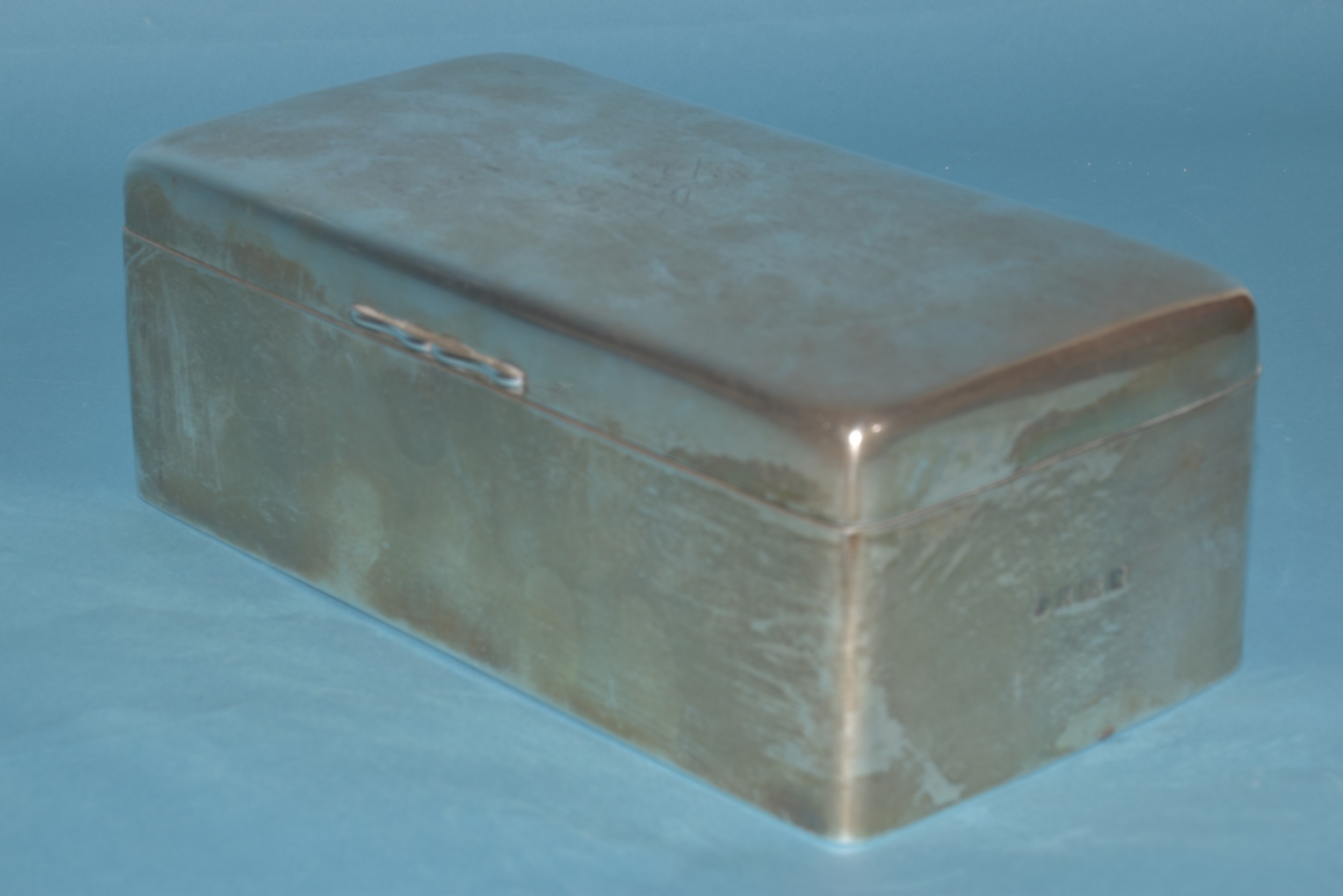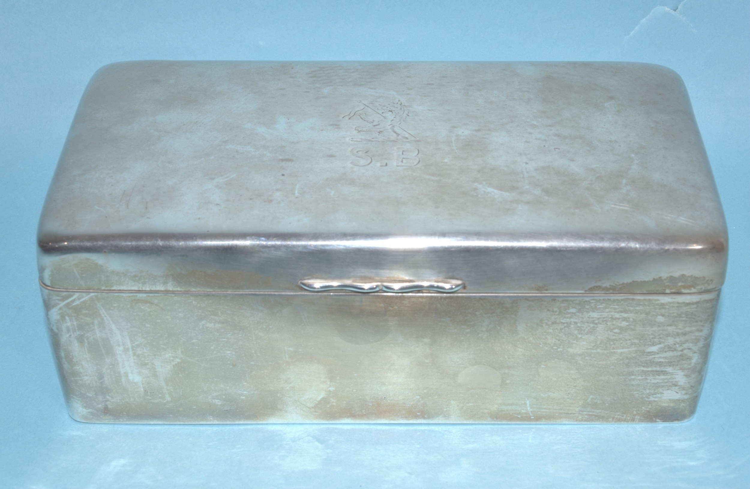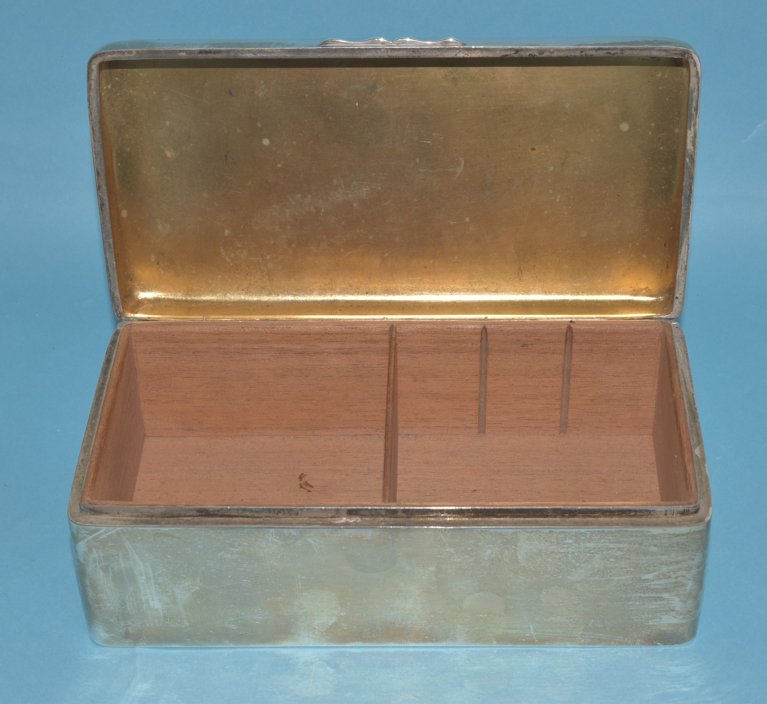 An Edwardian silver rectangular cigarette box with wood-lined interior, Birmingham 1901, 18.5 x 9.5cm, 7cm high, inscribed initials and crest to lid, gross weight 865.6g, ___27.8oz.