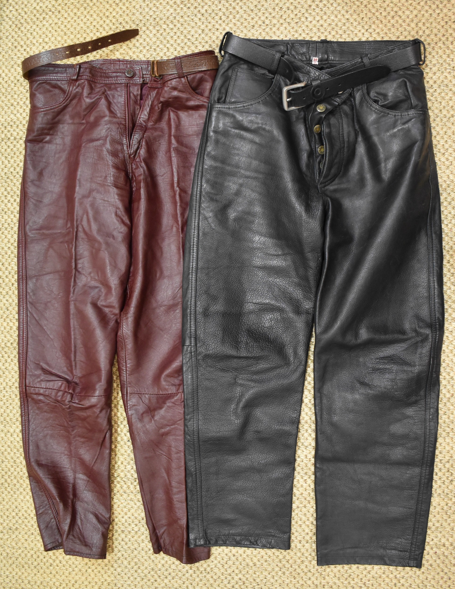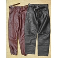 A pair of maroon soft leather trousers and a pair of black button-fly trousers, both size 34, (2).