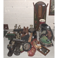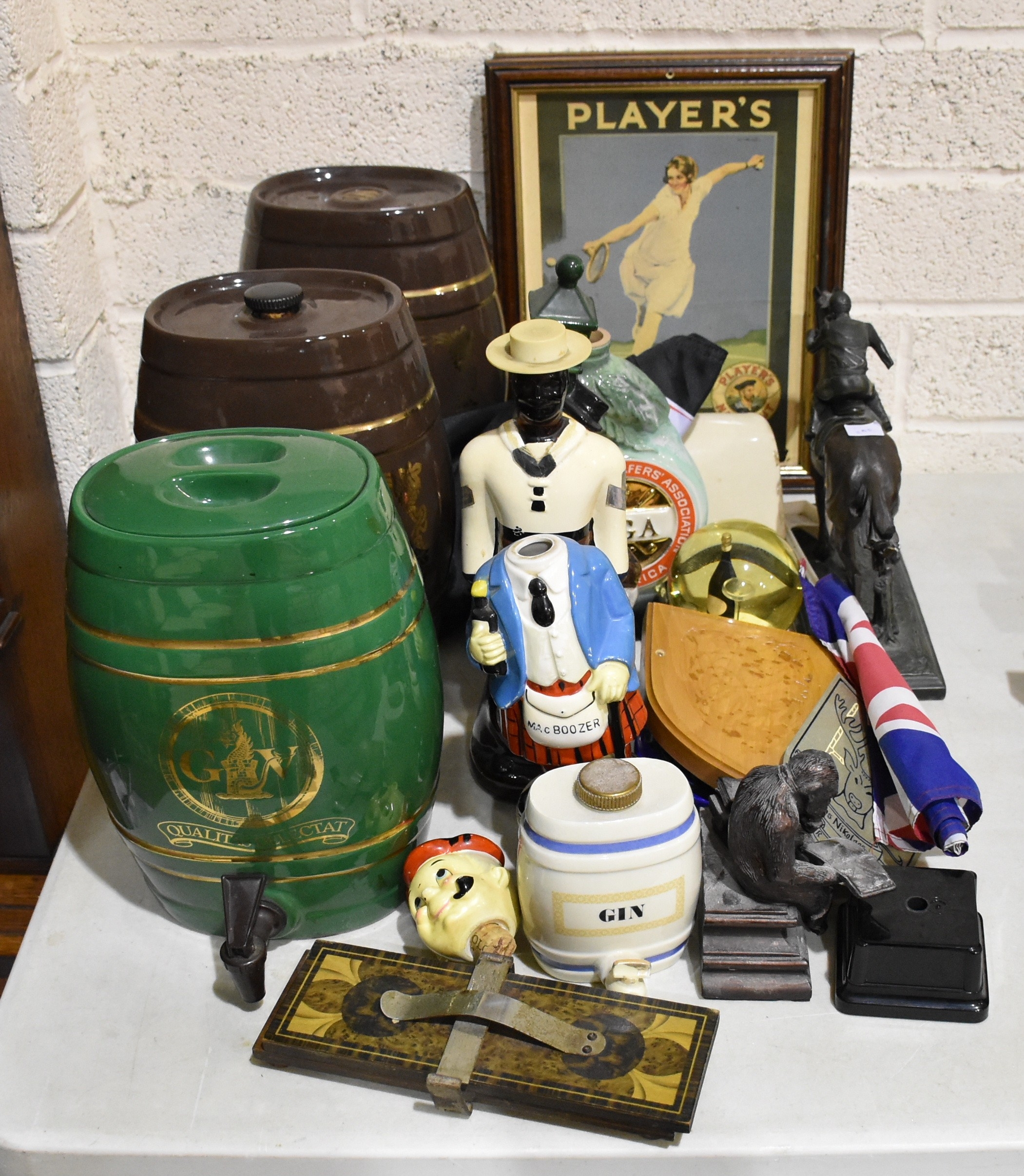 Two Royal Norfolk 'Saccone & Speed' Fine Old Ruby Port, in brown-glazed ceramic barrels, a similar Royal Winton green-glazed barrel, each 30cm high and other ceramic advertising merchandise, (some a/f).