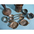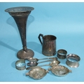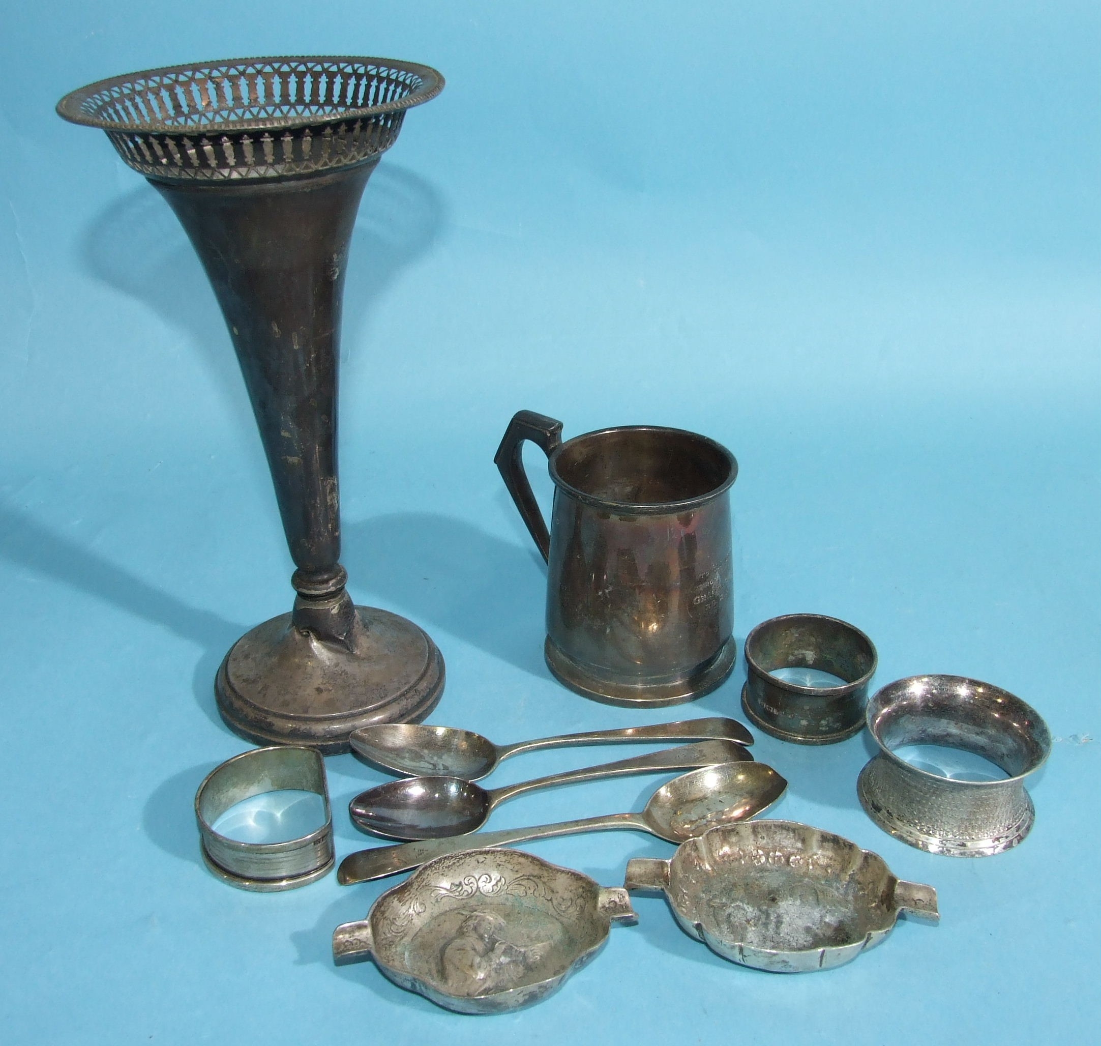 A small silver christening mug, 8cm high, with engraved inscription, Birmingham 1931, three silver napkin rings, a silver spill vase (a/f) and other small silver, total weight 363.4g, ___11.6oz.