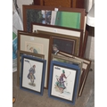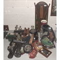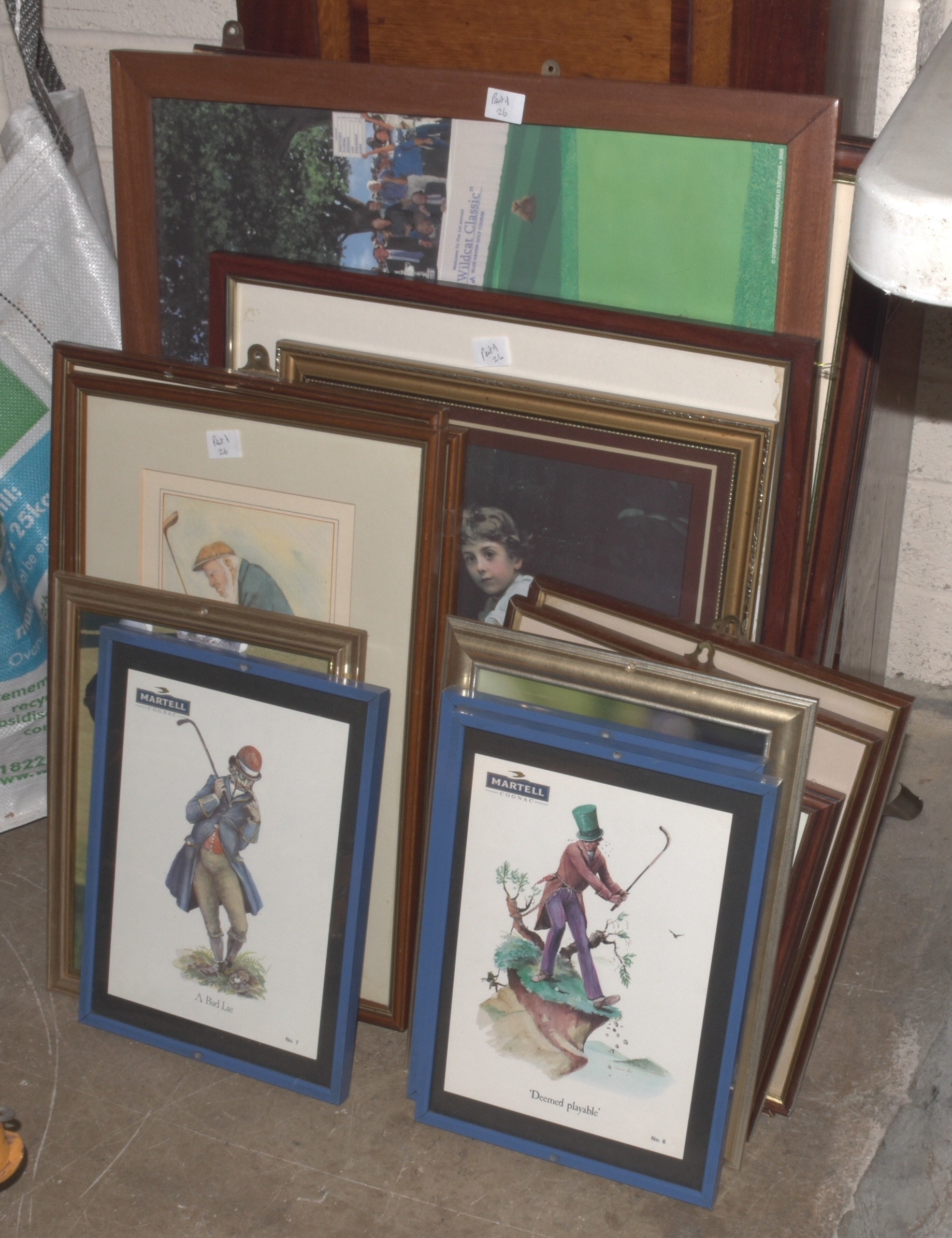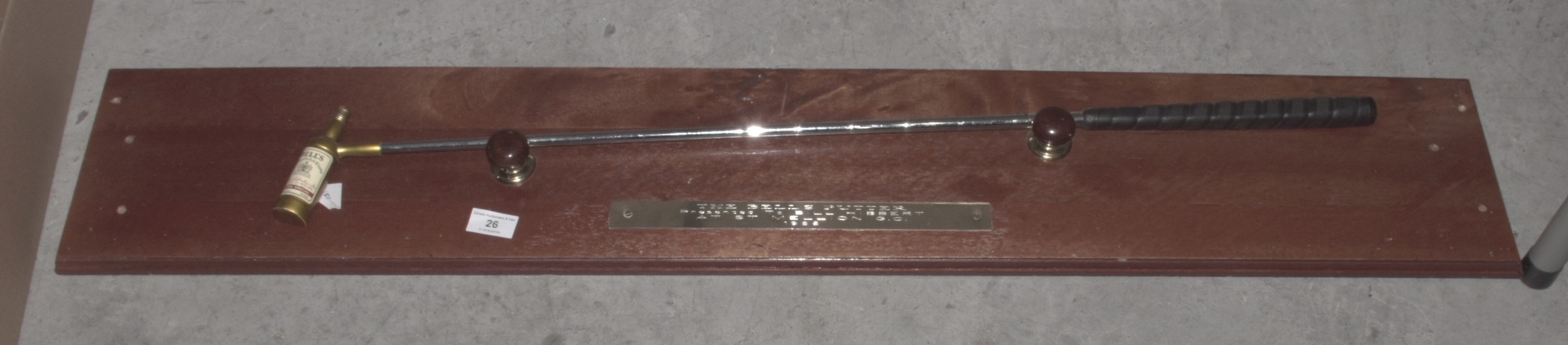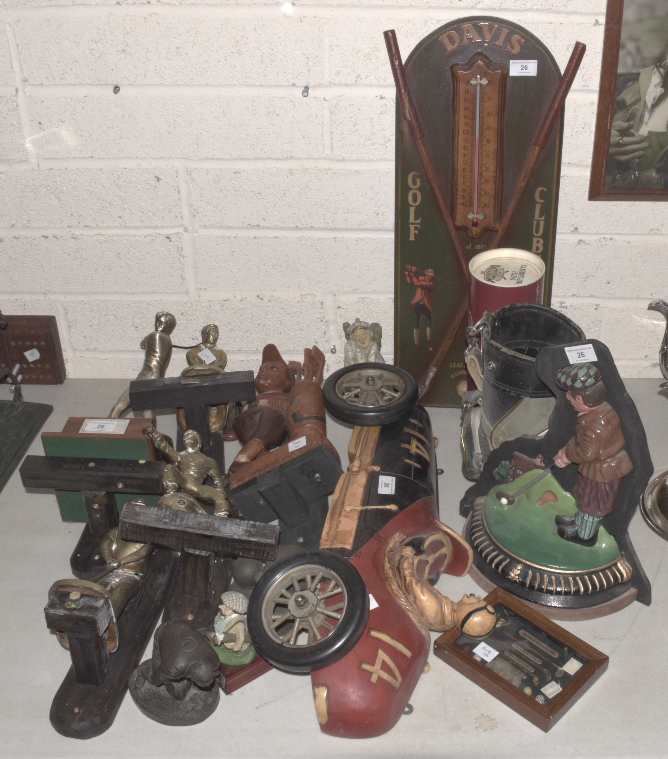 A promotional Bell's Scotch Whisky putter, the head shaped as a whisky bottle, 90cm long, mounted on a rectangular wooden plaque, various brassed and wooden golfing figures mounted on wooden brackets, together with a collection of golfing-related prints and miscellaneous items.