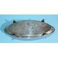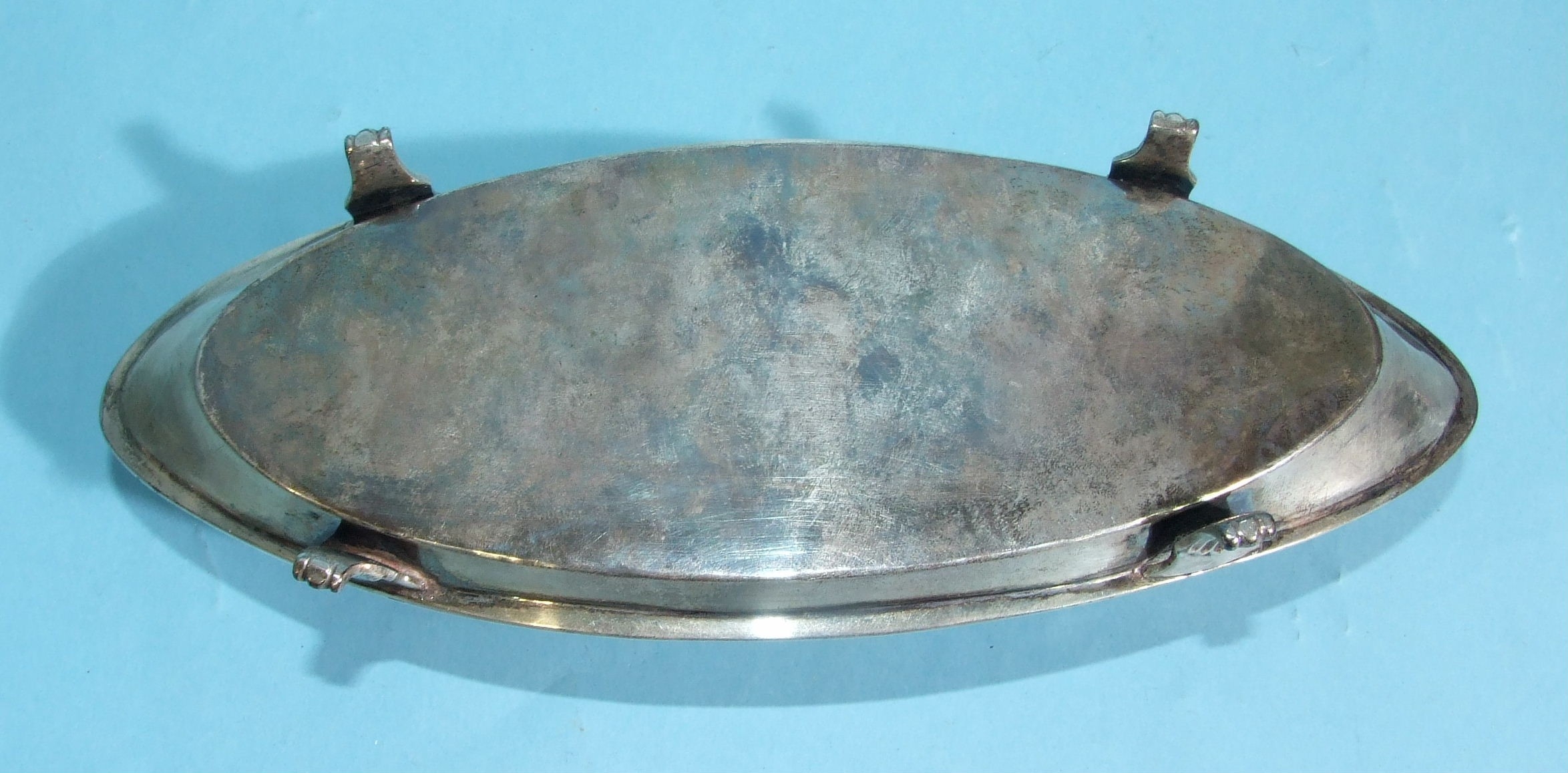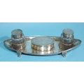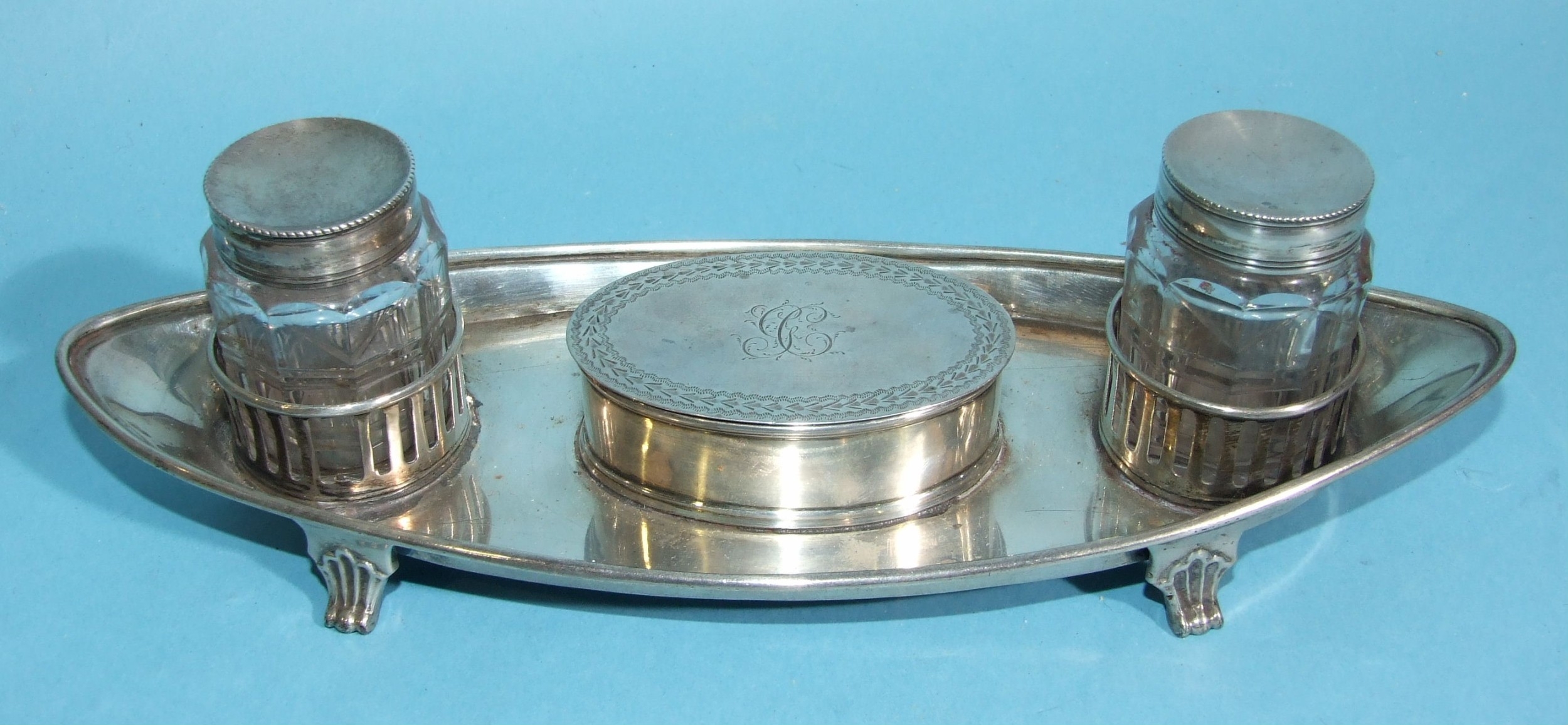 A late-18th/early-19th century oval-shaped inkstand with two glass bottles and oval wafer box, on tab feet, 23 x 8.5cm, 202.7g, ___6.5oz, (unmarked).