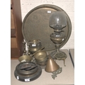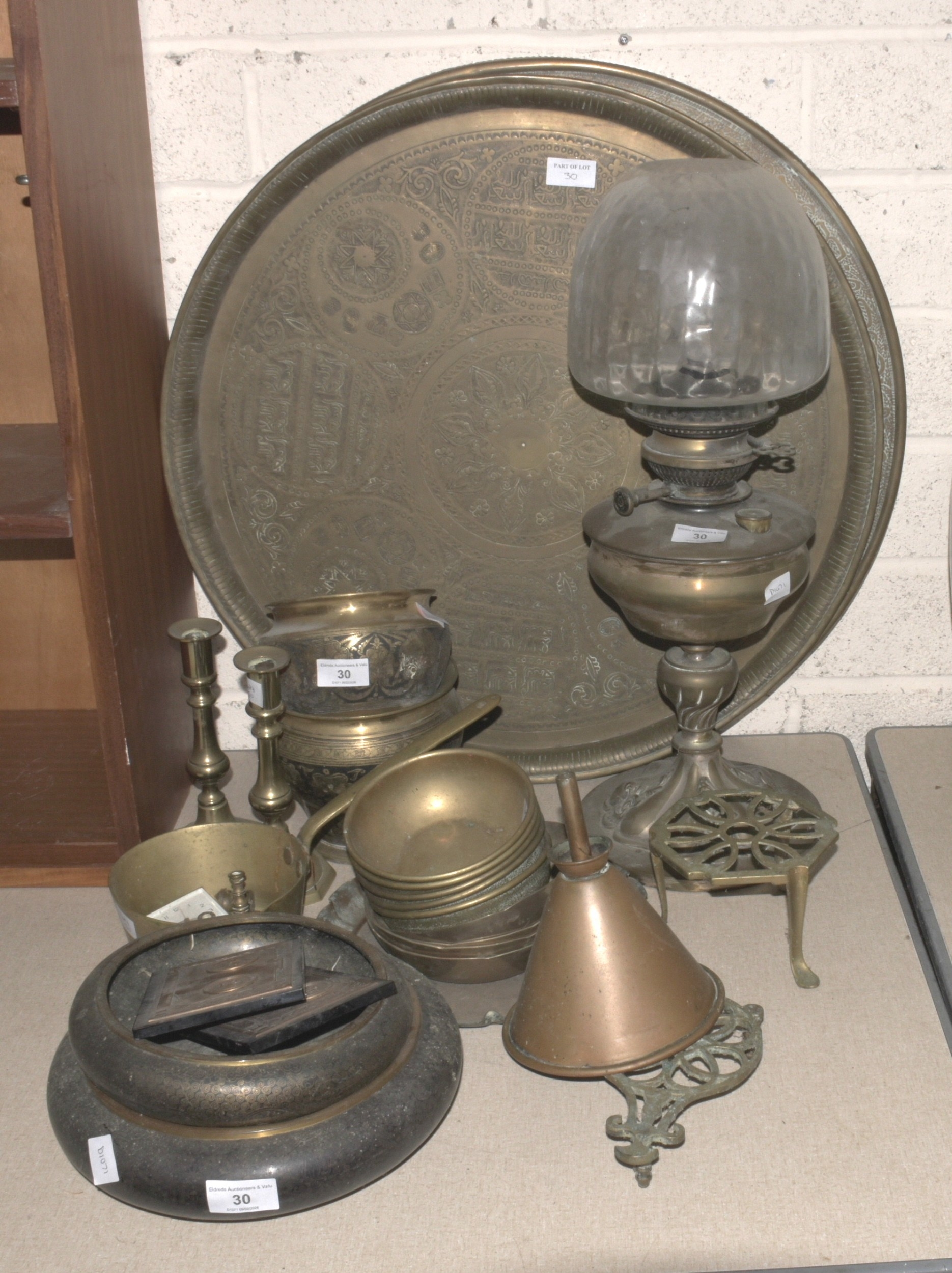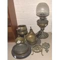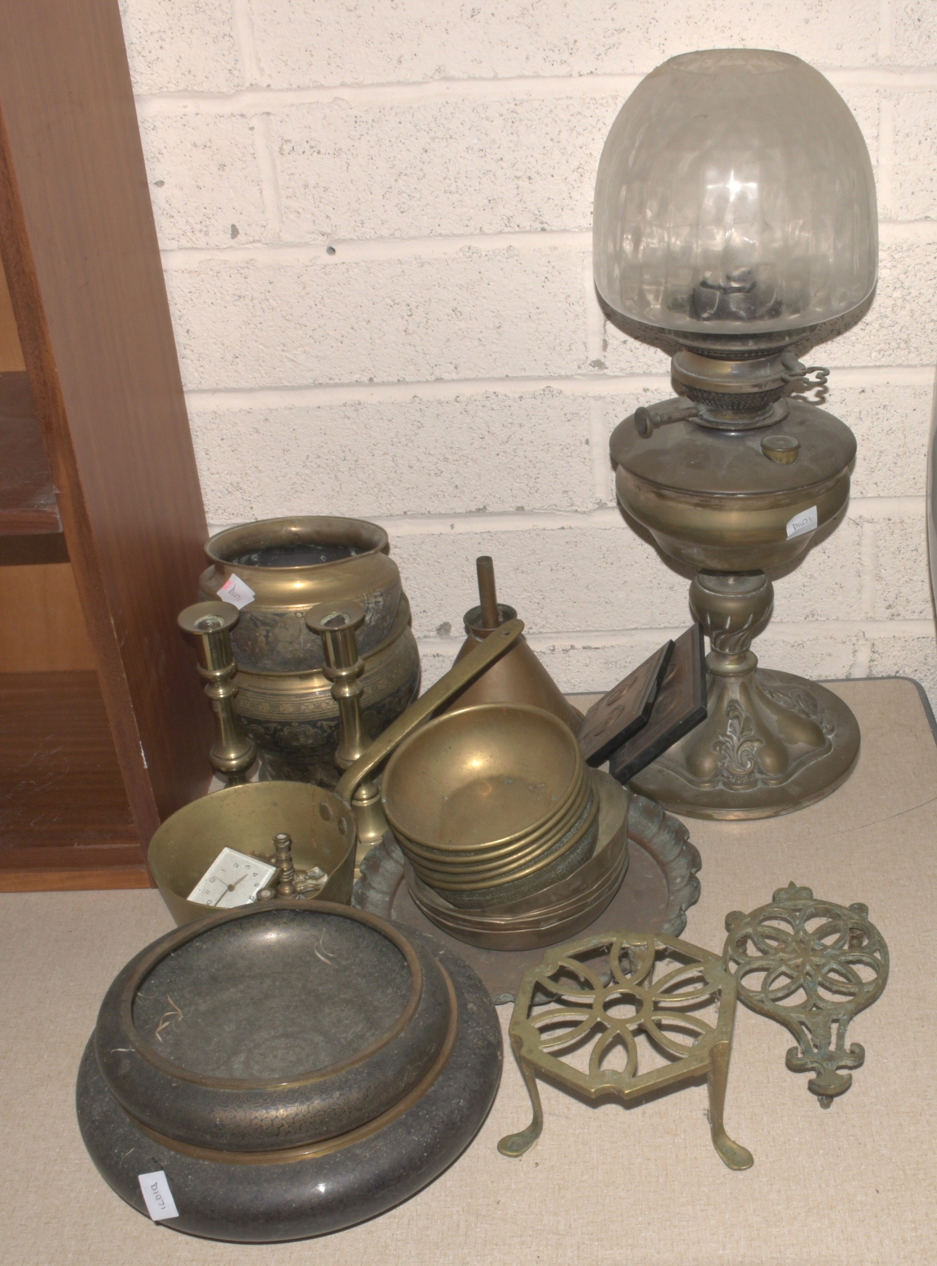A brass oil lamp with clear glass shade, 54cm high overall, a cloisonné shallow bowl 24.5cm diameter, 7.5cm high, a smaller similar bowl, a small brass saucepan and other brassware.