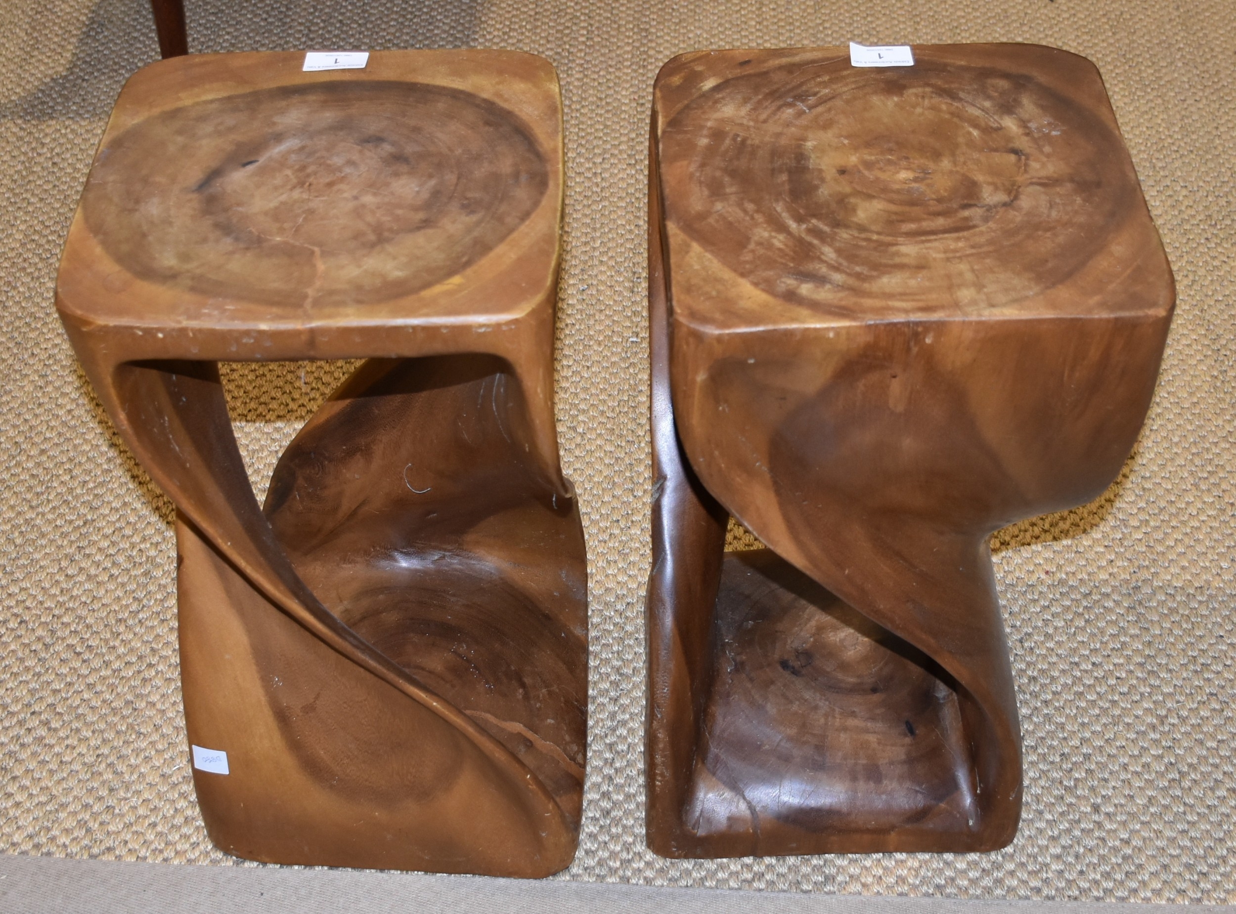 A pair of carved tree-trunk occasional tables, 51cm high, (2).