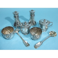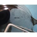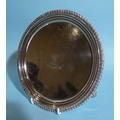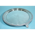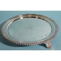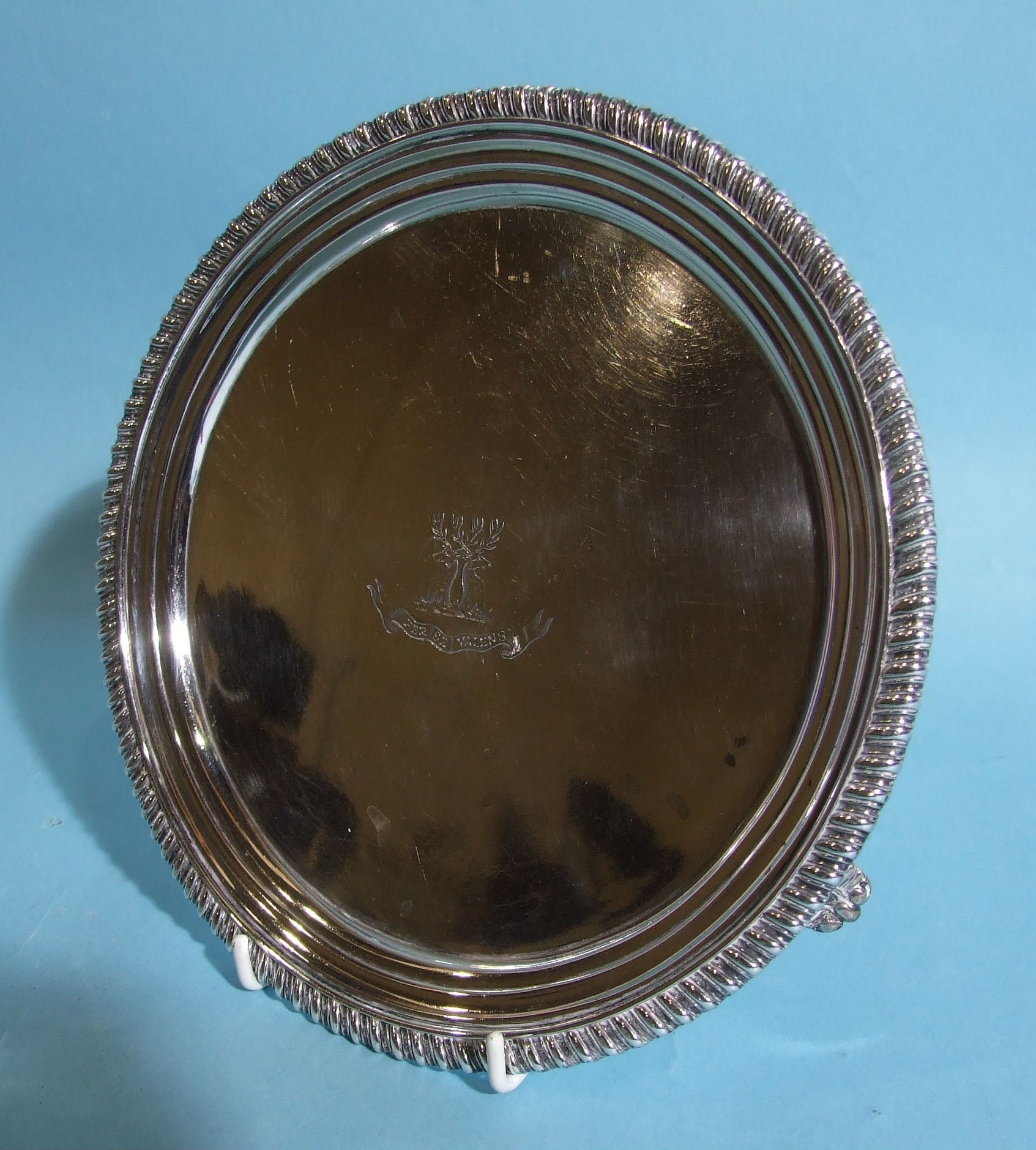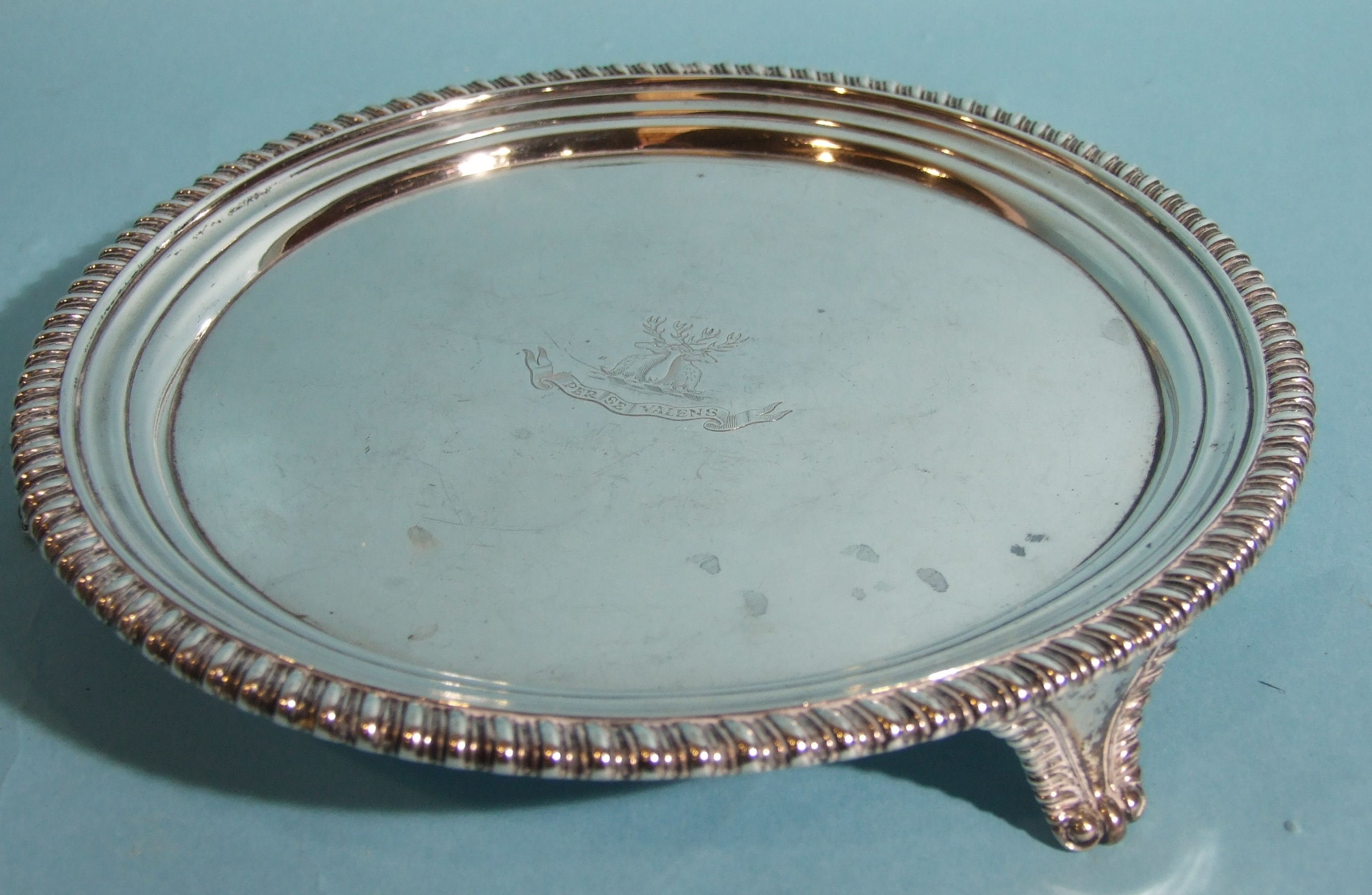 A George III circular silver salver with gadrooned border, on tapering scroll feet, with engraved central crest and motto, 20.5cm diameter, 450.8g, ___14.5oz.